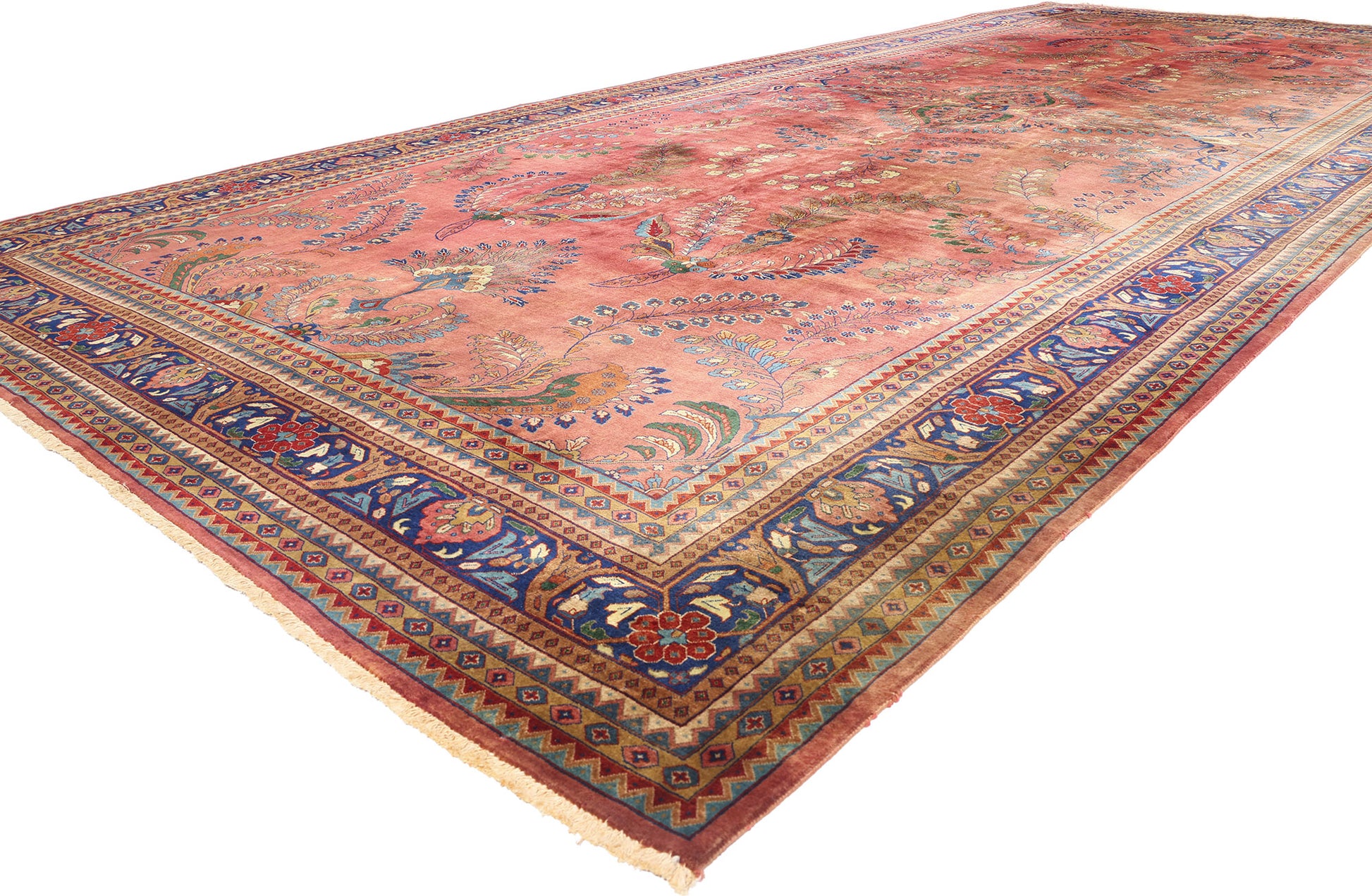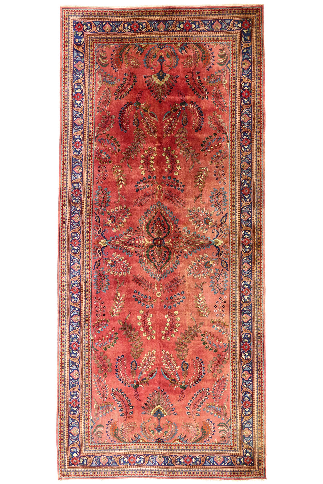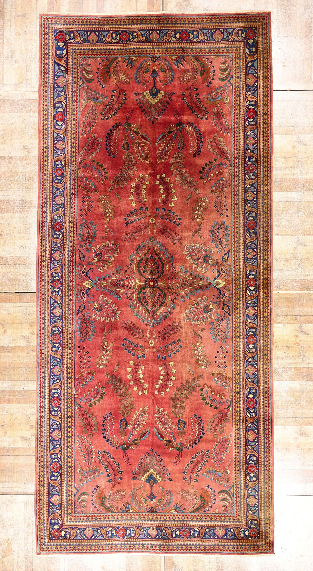 This Indian Sarouk rug is more than textile—it is a memory woven in wool, a dialogue between heritage and adaptation. It speaks to the grace of cultural translation, where Persian forms bloom anew in Indian hands, made not as imitation but as homage. In its vast length and painterly palette, this vintage Indian Sarouk becomes both a floor-bound fresco and a sanctuary for the senses—a woven oasis inviting repose, reflection, and timeless beauty.