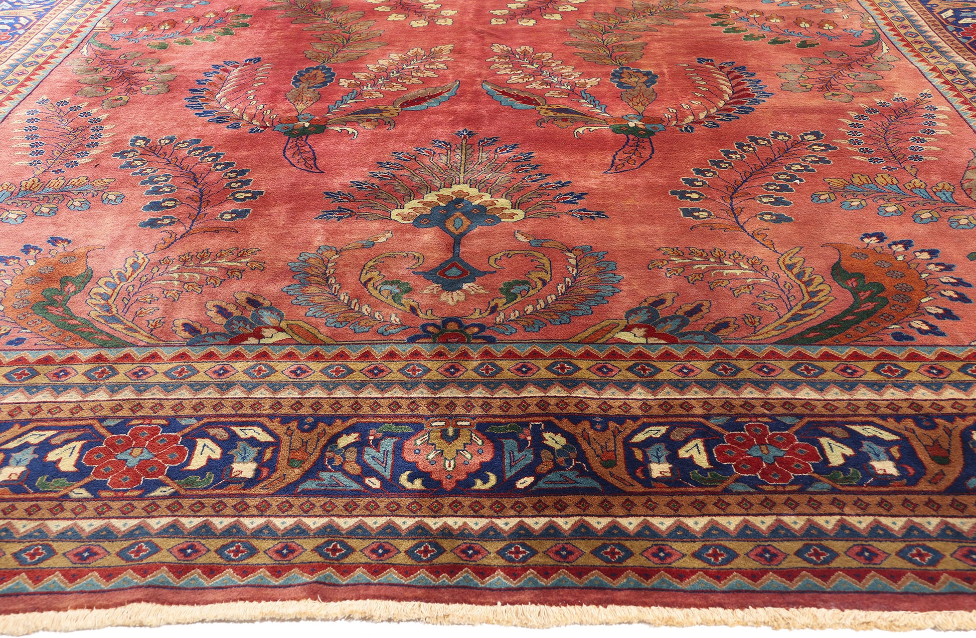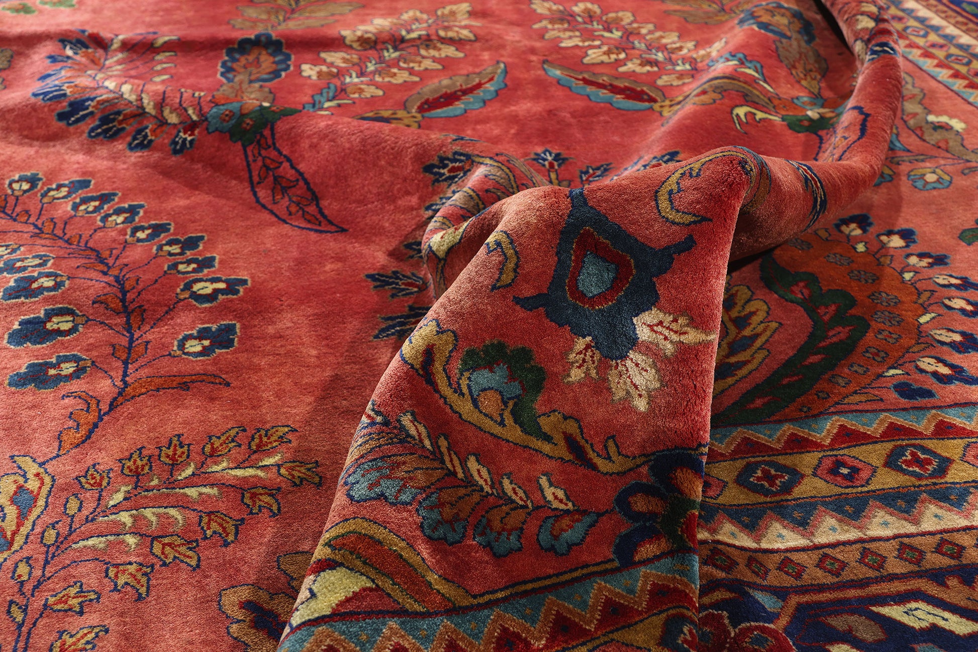 Floral sprays cascade outward in mirrored procession, hyacinths blooming, fronds unfurling in elegant S-curves, feathery leaves, and acanthus blossoms arranged in rhythmic cadence. The rich saturation of carnelian, sapphire, blue topaz, and smoky quartz infuse the field with chromatic harmony, echoing the palette of the American Sarouk rugs once beloved in refined Western parlors. Yet here, those familiar motifs are subtly transformed: the scale enlarged, the forms more lyrical, and the balance between ornament and emptiness rendered with a modern eye toward light and air.