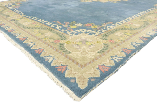 Although the height of Indian carpet weaving existed during the Mughal Dynasty, British colonization in the 19th century revitalized the art of rug weaving. In addition to flower and animal scenes, antique Indian rugs crafted during this time displayed vividly compelling calligraphic and geometric patterns to complement spacious interiors of royal palaces and wealthy British homes. Muted color patterns and hints of classical Persian and Indian motifs catered to specific decorative preferences of the European elite.