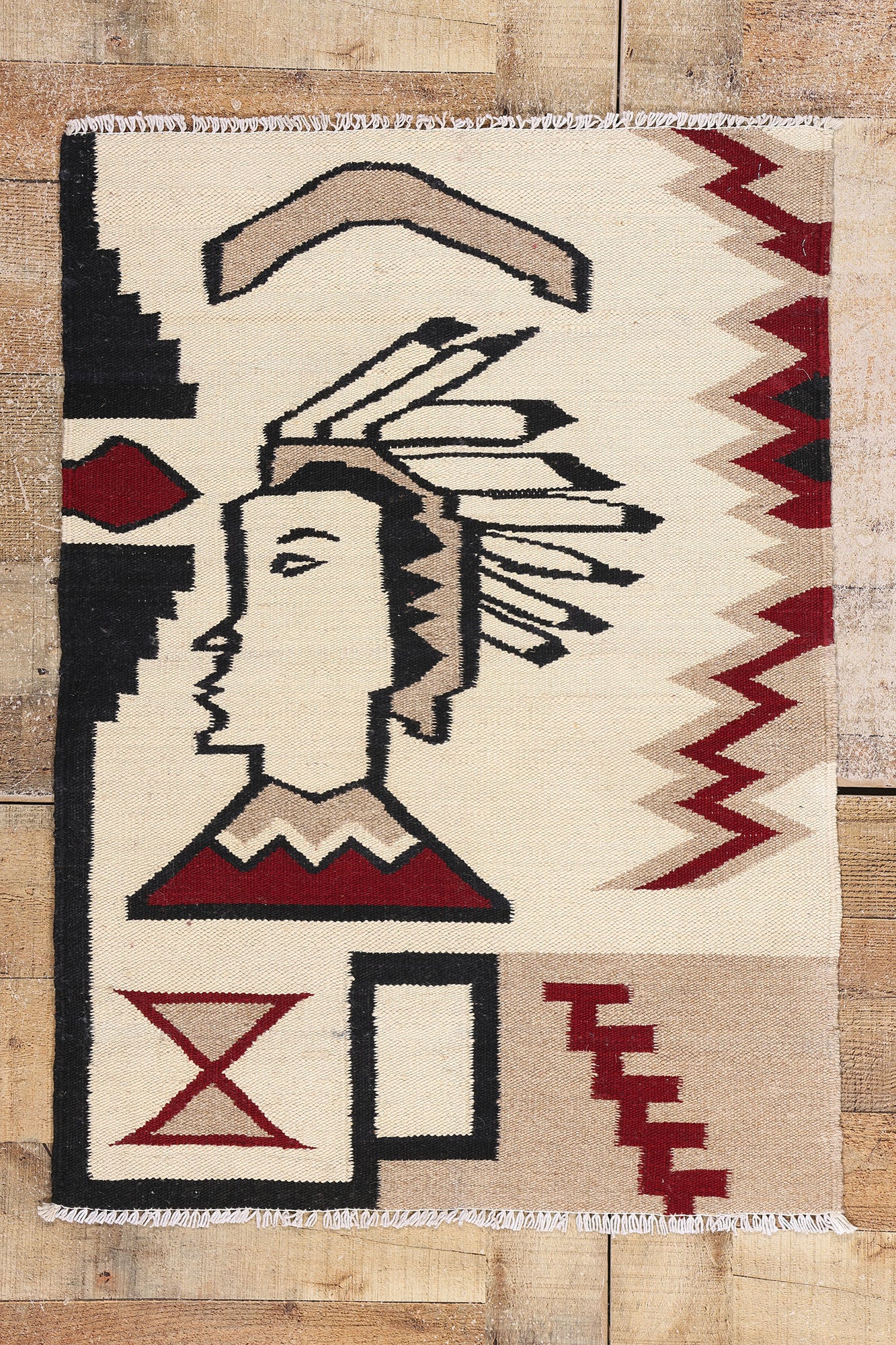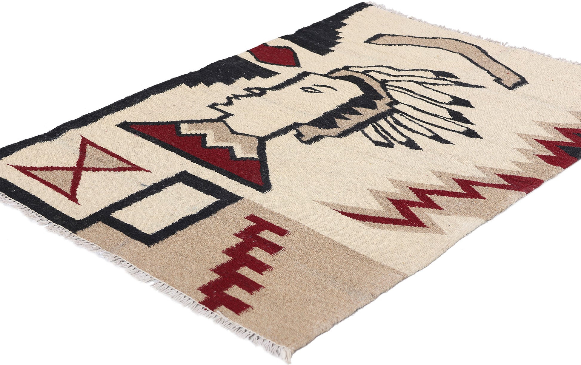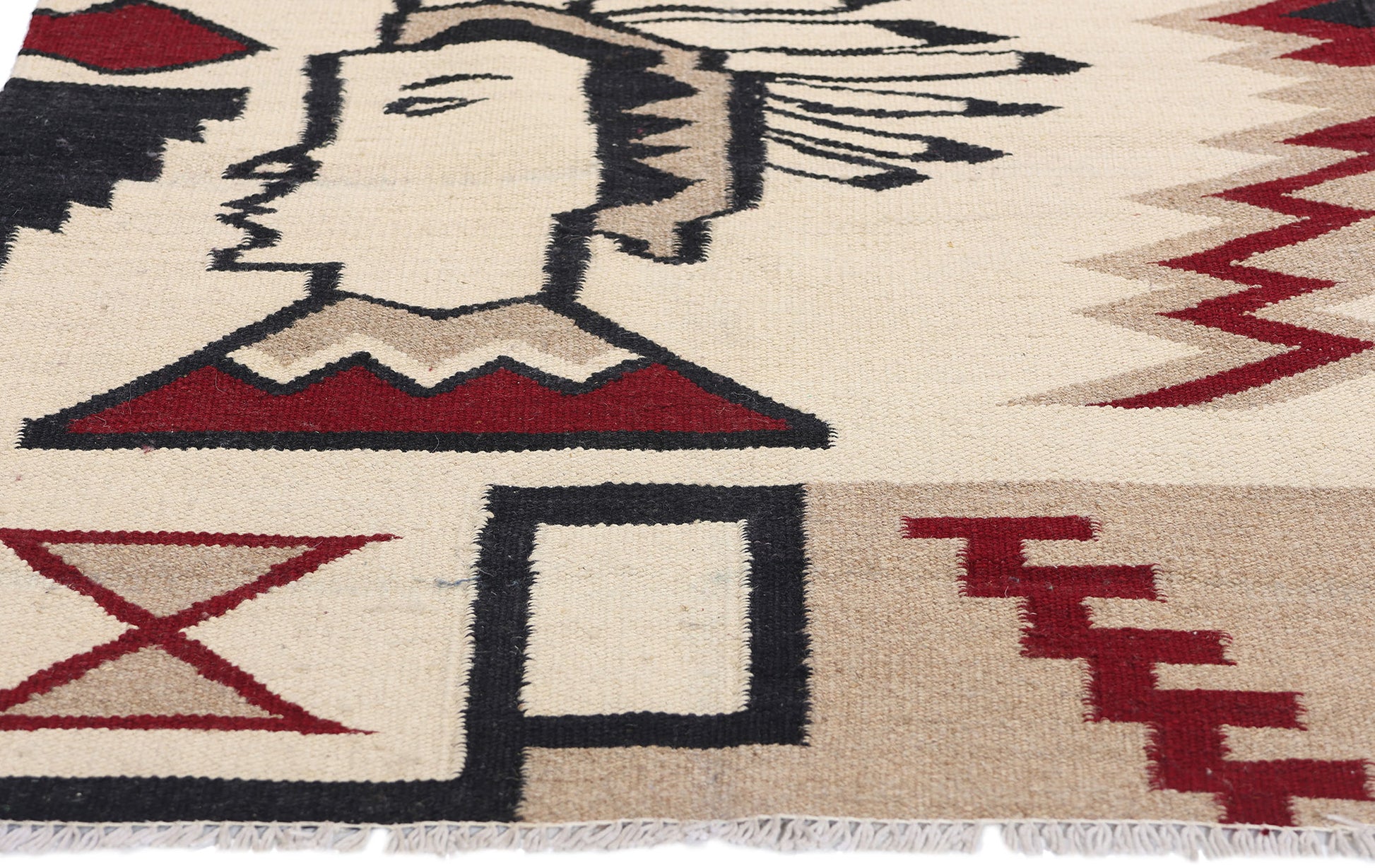 This handwoven wool Southwest Modern Navajo-style kilim rug is a bold and artistic representation of traditional Native American-inspired design with a contemporary twist. At its center, a striking profile of a Native American figure with a feathered headdress emerges, rendered in sharp black outlines and earthy tones. Surrounding this figure are dynamic geometric motifs, including red and beige zigzags, stepped patterns, and striking black-and-red diamond shapes, all set against a warm ivory background. The juxtaposition of figurative and abstract elements creates a visually captivating piece that bridges cultural storytelling with modern design.