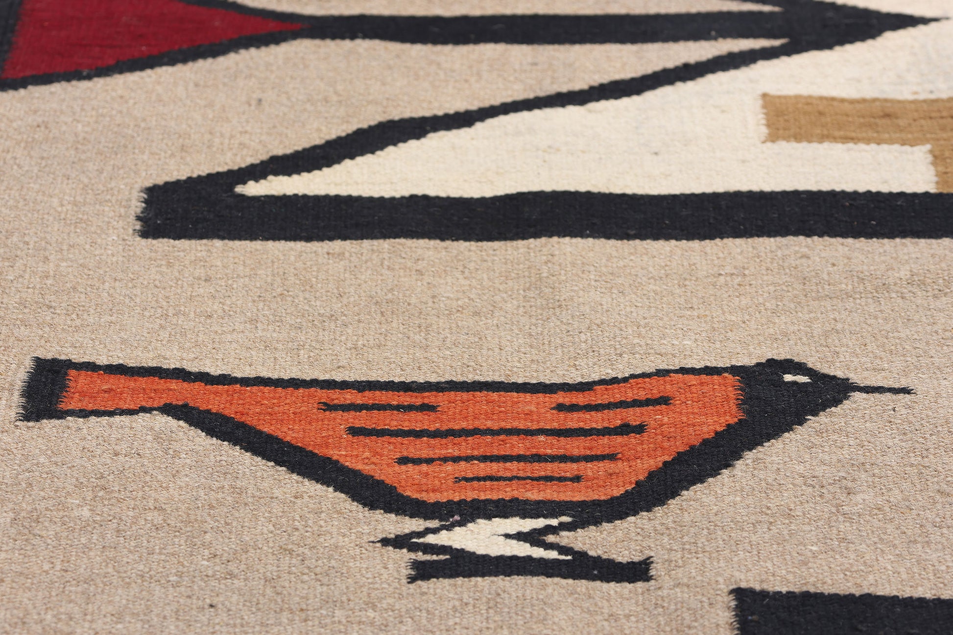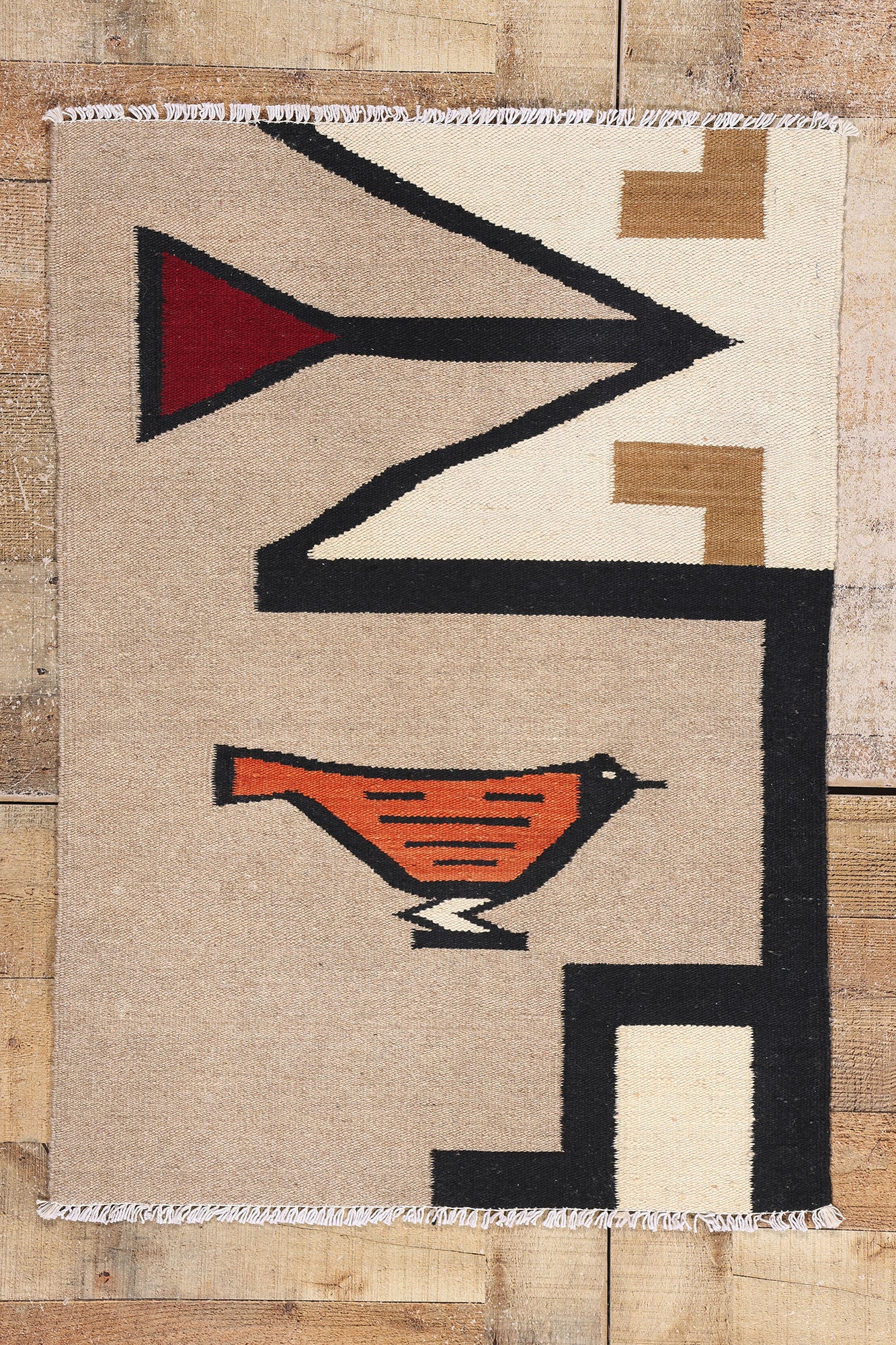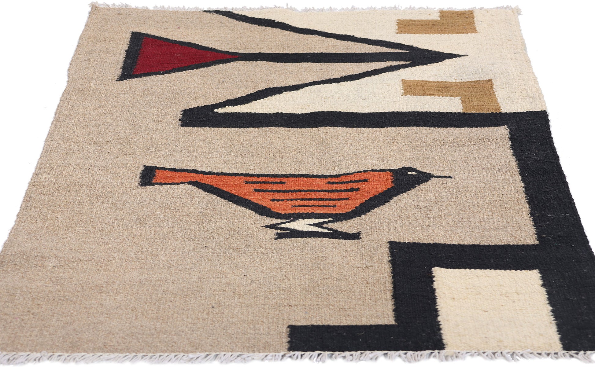 This handwoven wool Southwest Modern Navajo-style kilim rug showcases a unique interplay of traditional motifs and bold modern elements, making it a striking addition to nearly any space. The design features a central red bird motif, symbolizing freedom and vitality, set against a warm beige field. Angular geometric patterns in black and ivory frame the composition, creating a sense of structure and balance, while subtle touches of golden brown add depth and dimension. The juxtaposition of figurative and abstract elements makes this rug both visually dynamic and culturally evocative.