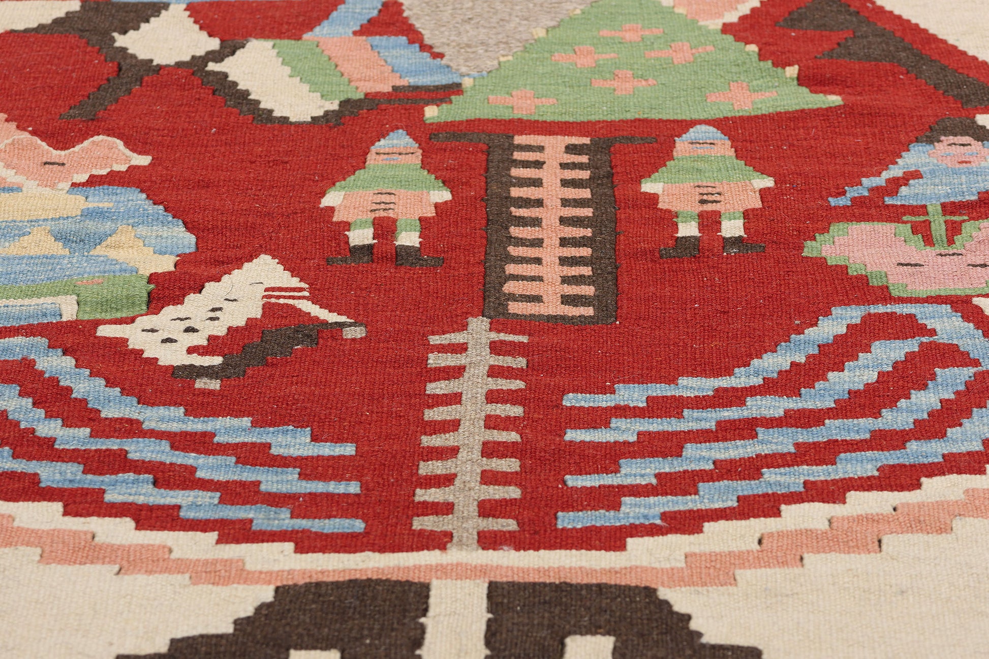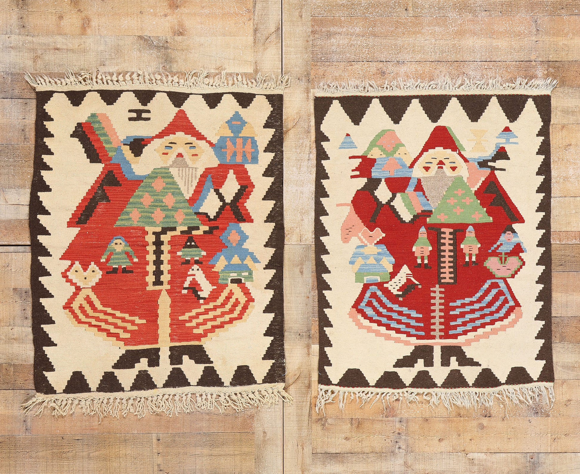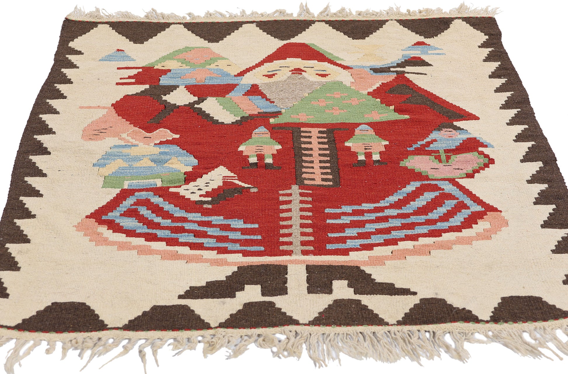 This delightful handwoven wool vintage Turkish Noel Baba Kilim rug brings together the artistry of traditional Turkish weaving and the joyous spirit of holiday folklore. Depicting the beloved figure of Noel Baba, the Turkish equivalent of Santa Claus, this kilim rug adds a charming festive touch to any space. The vibrant colors and playful motifs capture the essence of Baba Noel, a figure rooted in both Turkish and global holiday traditions, who delivers gifts to children and embodies the spirit of generosity and joy during the holiday season.