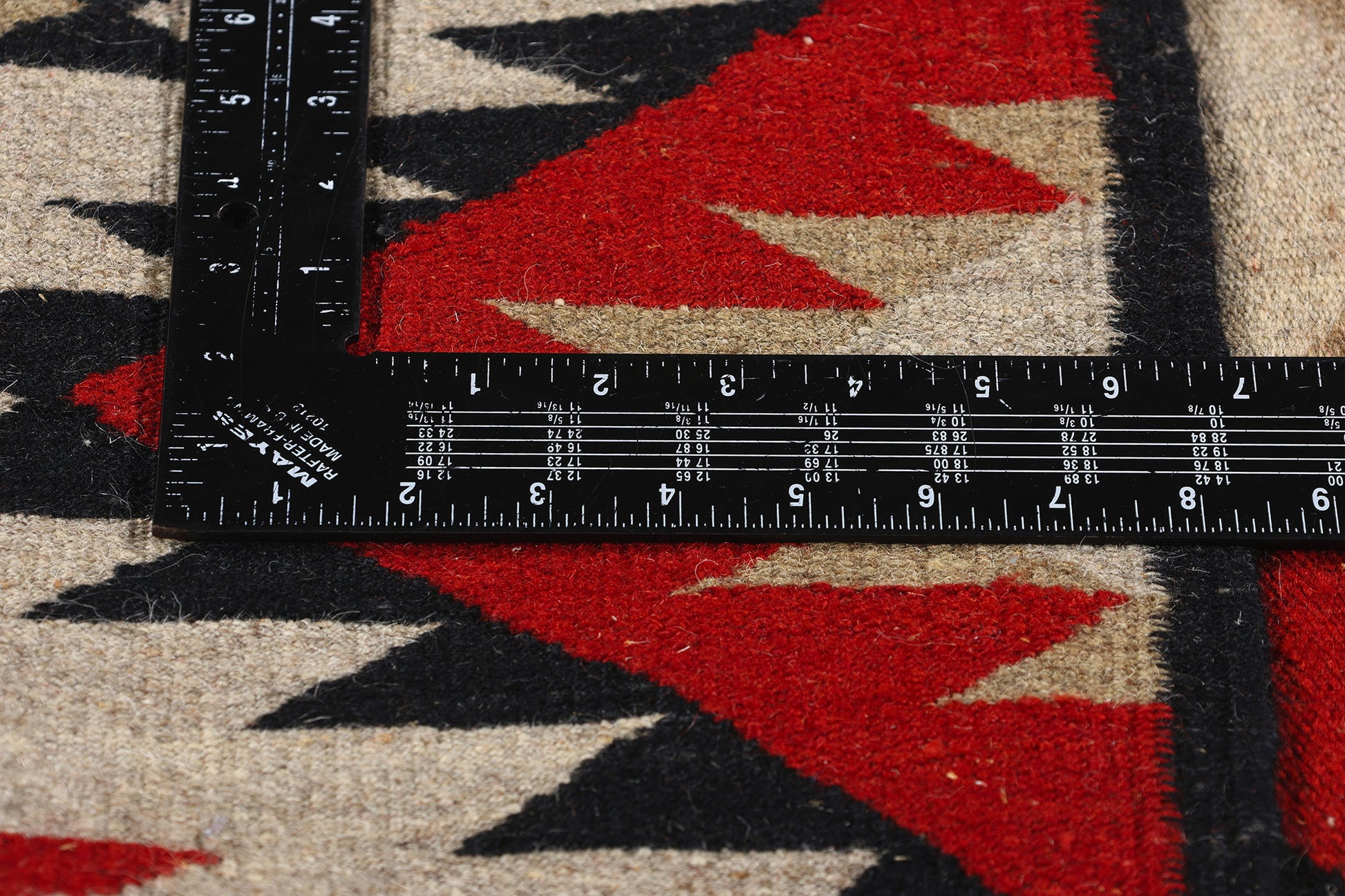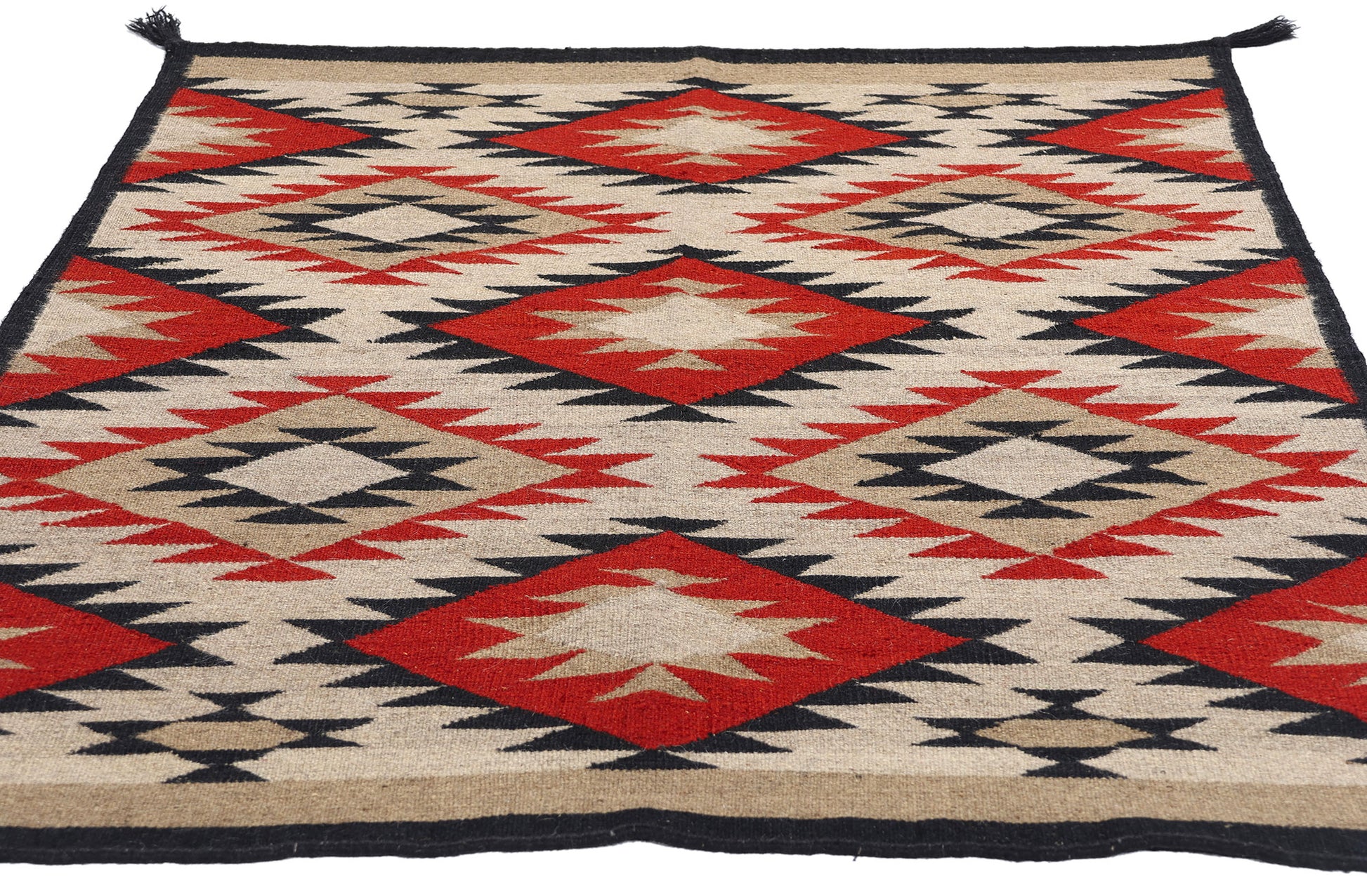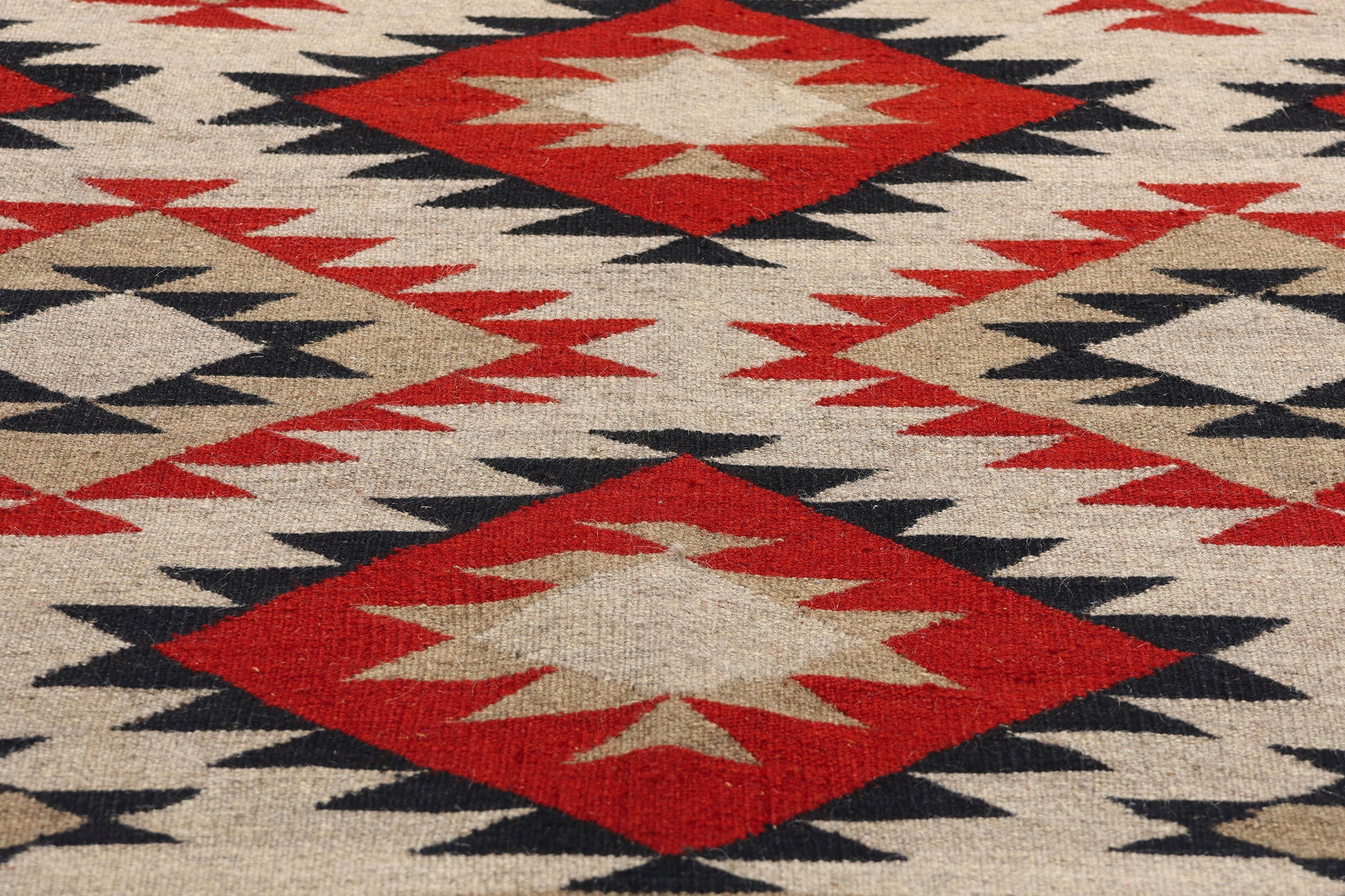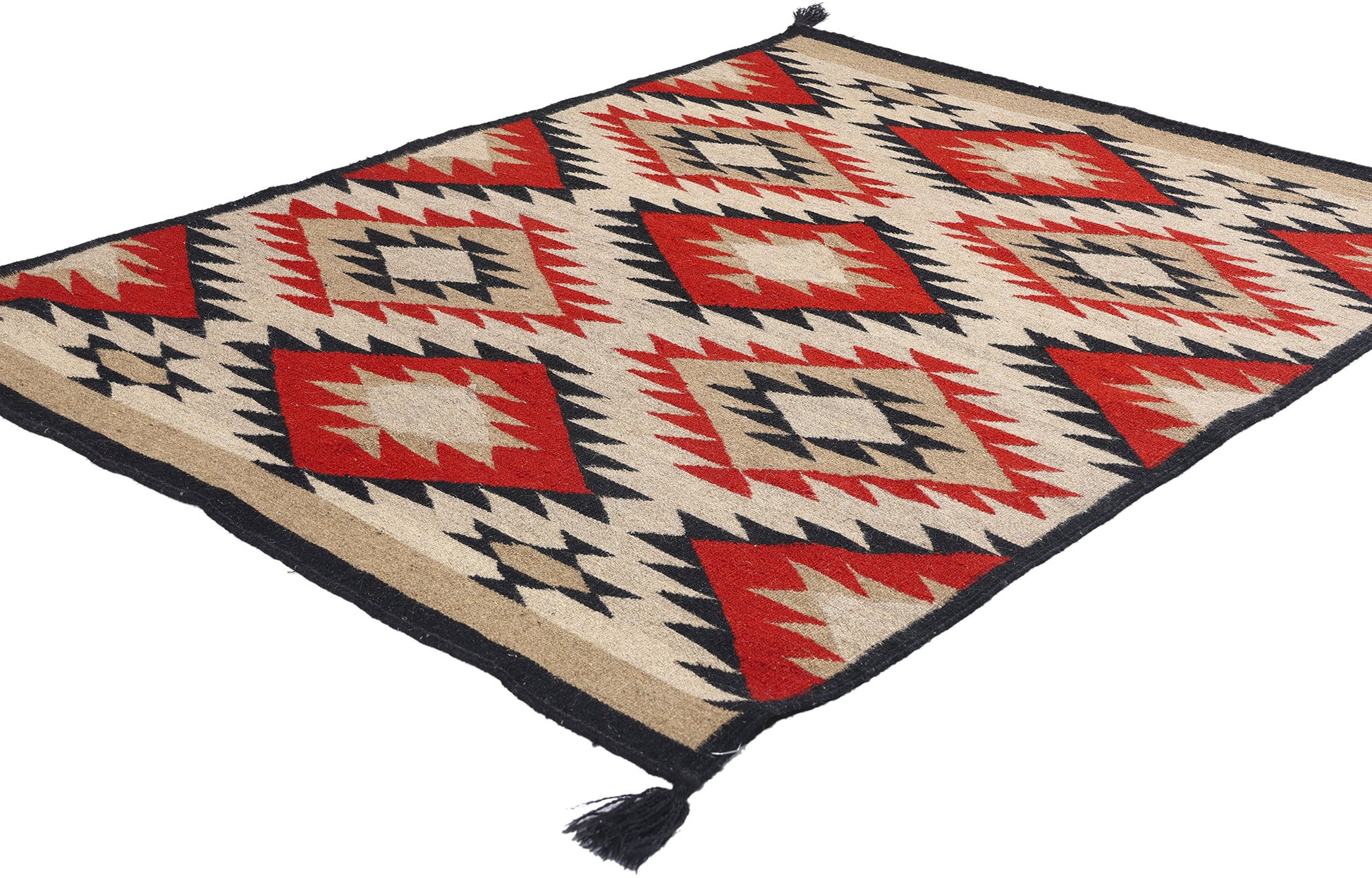 This handwoven Southwest Modern Navajo-style kilim rug draws inspiration from the iconic Eye Dazzler and Red Mesa Navajo rugs. It features a captivating arrangement of serrated diamonds and zigzag patterns that create a dynamic sense of movement and depth. The bold geometric motifs, meticulously woven by skilled artisans, are harmoniously composed, showcasing the weaver’s exceptional attention to detail. Each diamond and zigzag is highlighted with contrasting lines, accentuating the vibrant red, black, earthy beige, and warm brown tones that dominate the design. The black Navajo-style border frames the rug elegantly, adding a touch of sophistication to the striking composition.