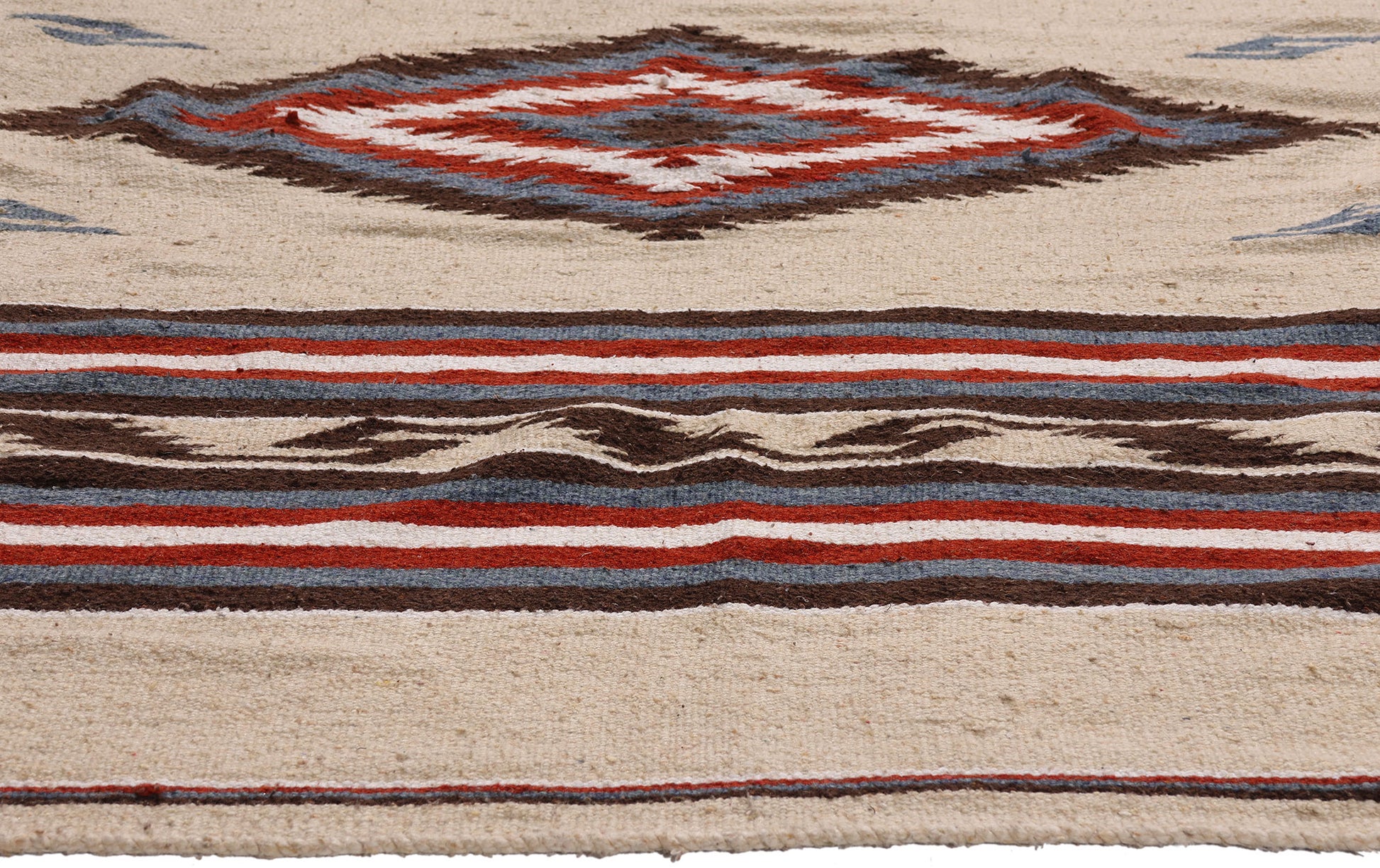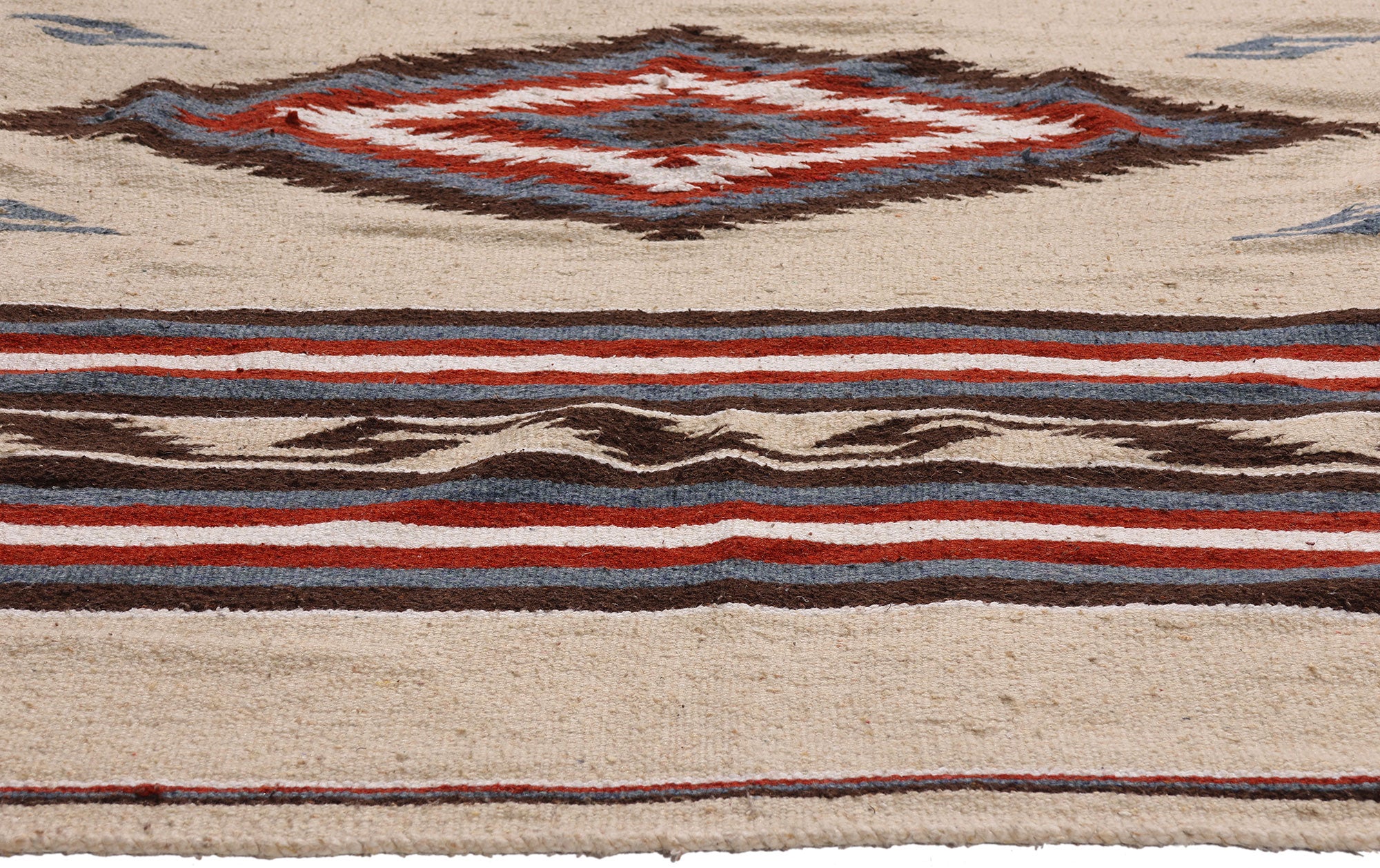 At the heart of the design, a commanding stepped diamond medallion anchors the composition, a sacred geometric form long associated with the four cardinal directions and the cyclical order of the natural world. This central motif is framed by rhythmic horizontal bands, each carefully proportioned to create visual harmony and architectural strength. The angular lightning-like forms woven into the borders reference movement, energy, and transformation—iconic motifs deeply embedded in Zapotec symbology and spiritual thought.