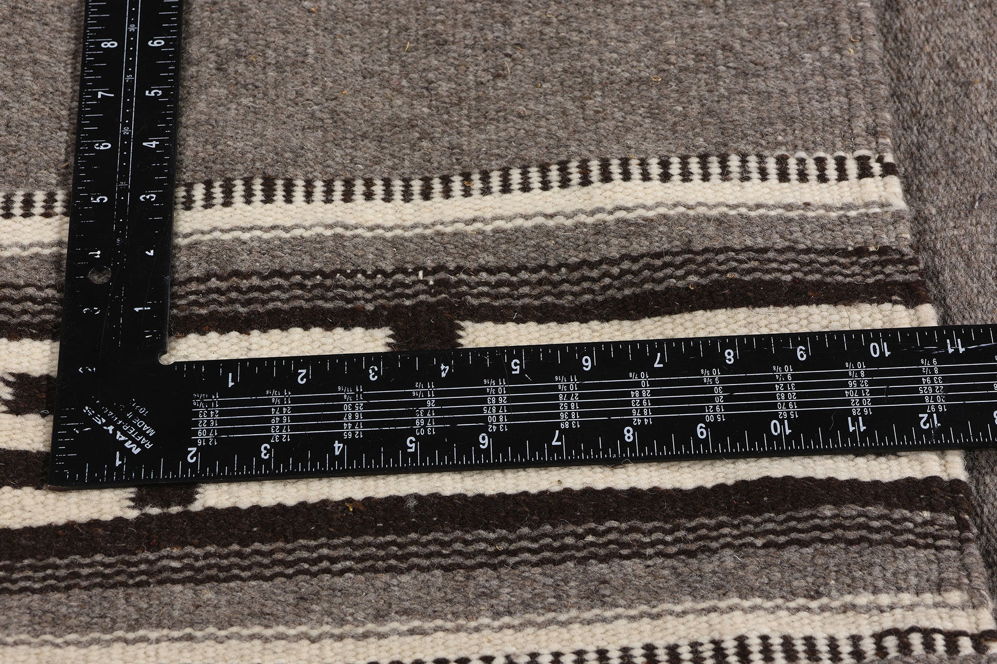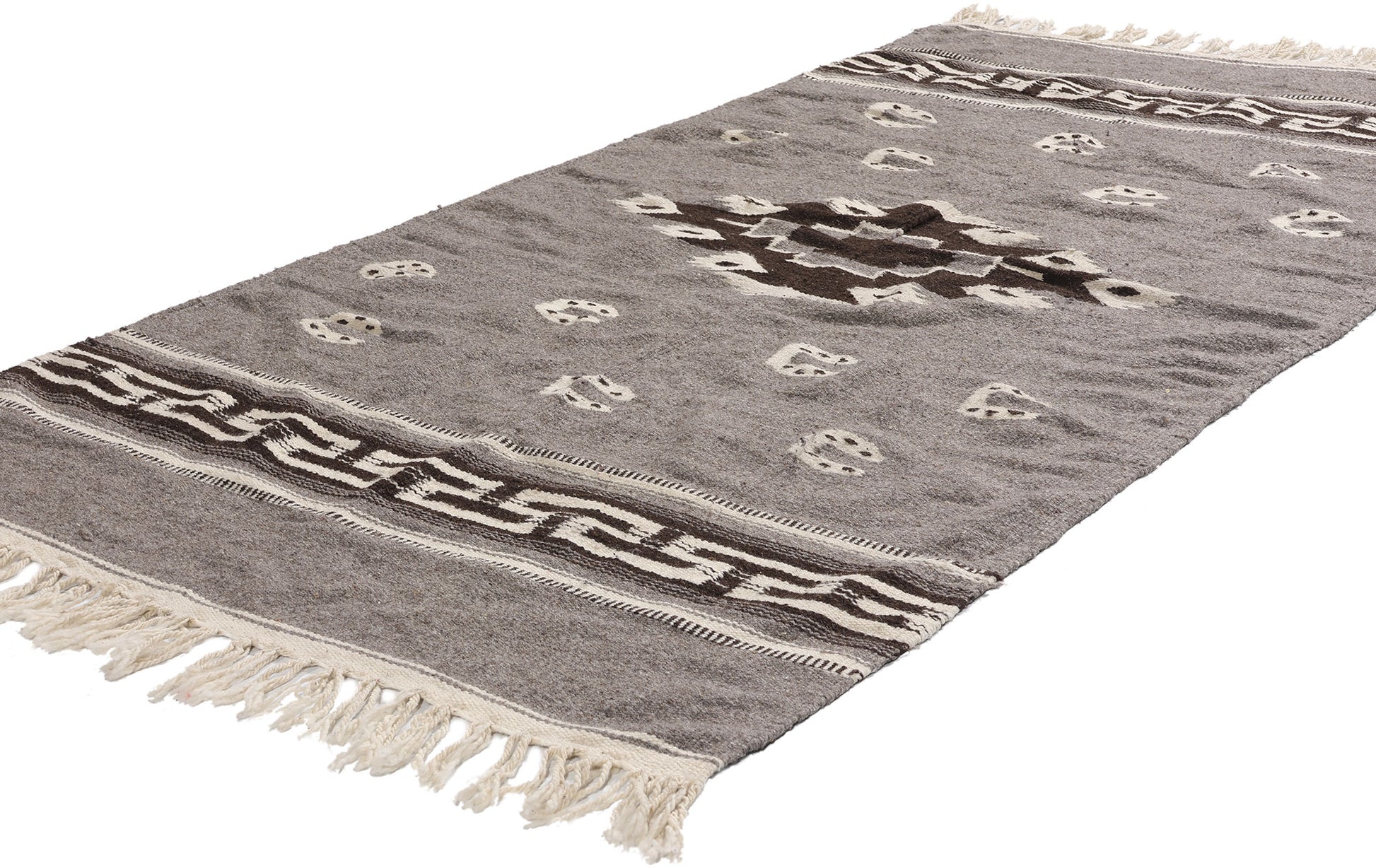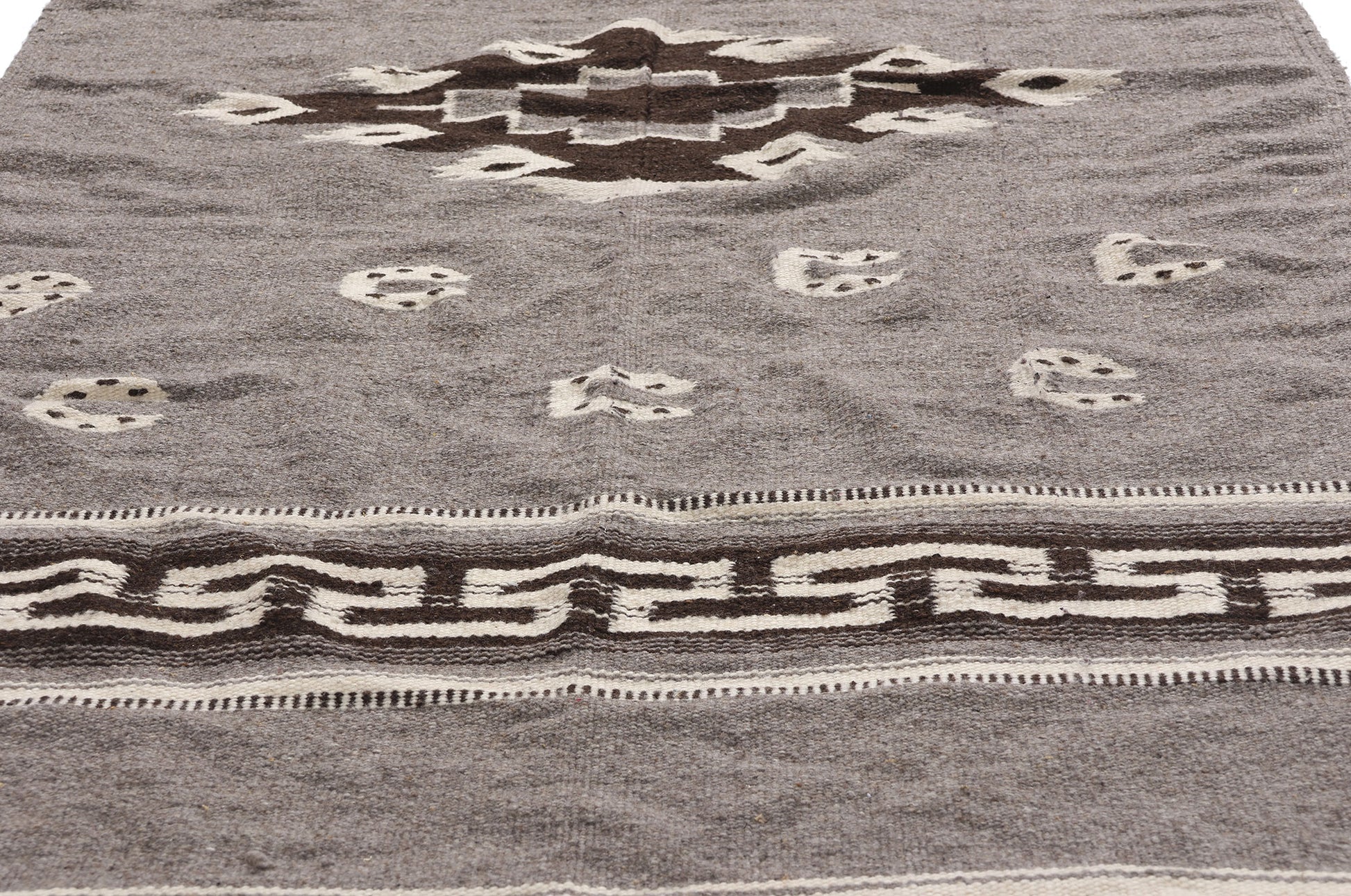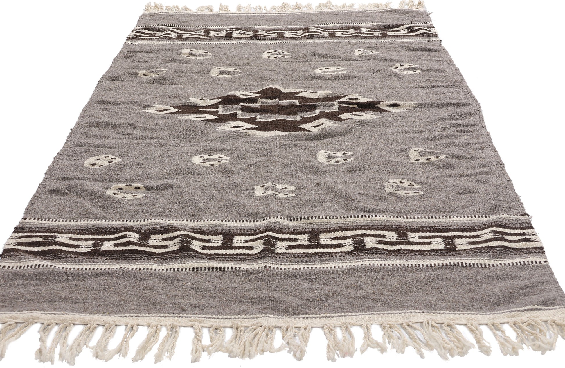 Rooted in the ancient weaving traditions of Oaxaca, this handwoven wool vintage Mexican Zapotec rug is a profound expression of indigenous artistry and cultural heritage. Meticulously crafted by Zapotec weavers, this flatwoven kilim rug showcases a harmonious interplay of geometry and symbolism, channeling generations of sacred design knowledge. Its central diamond medallion, rendered in nuanced shades of gray, espresso, and beige, recalls motifs often used to represent the four cardinal directions or the balance of life’s elements—earth, fire, water, and air.