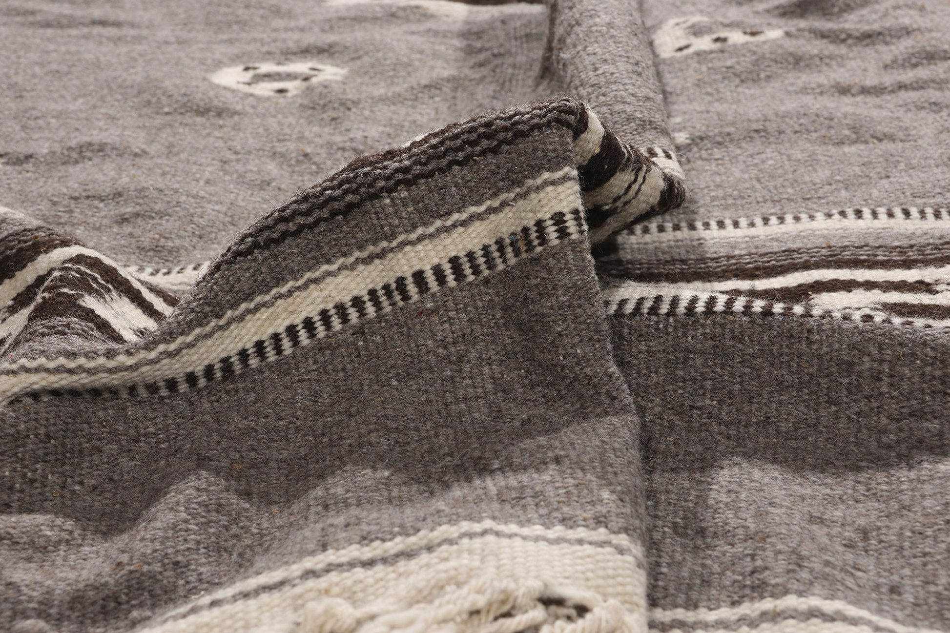 Woven entirely by hand with naturally dyed wool, the Zapotec kilim rug reflects a quiet reverence for the earth and its palette. The muted tones of gray, beige, and black evoke a grounded serenity, perfect for interiors that embrace the raw elegance of Organic Modern design or the rustic minimalism of Contemporary Santa Fe style. The texture of the weave brings a tactile warmth, inviting both touch and contemplation—an authentic reflection of the weaver’s connection to land and tradition.