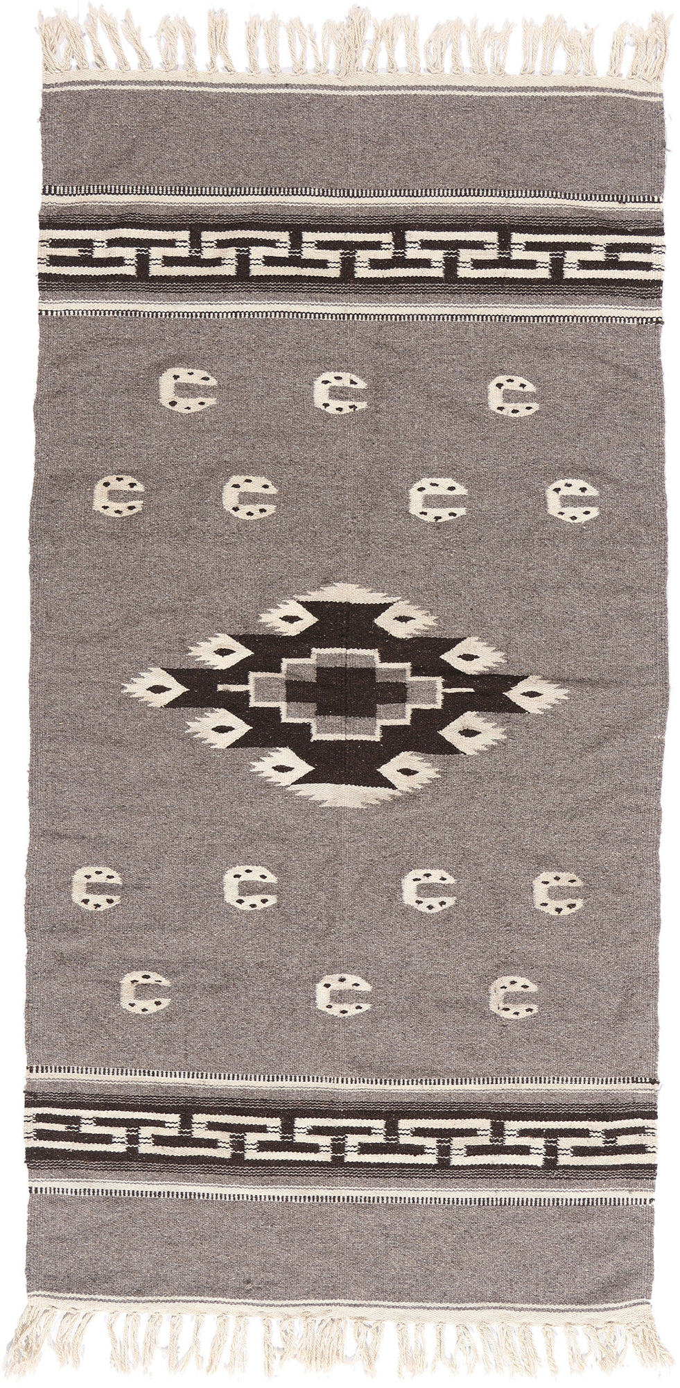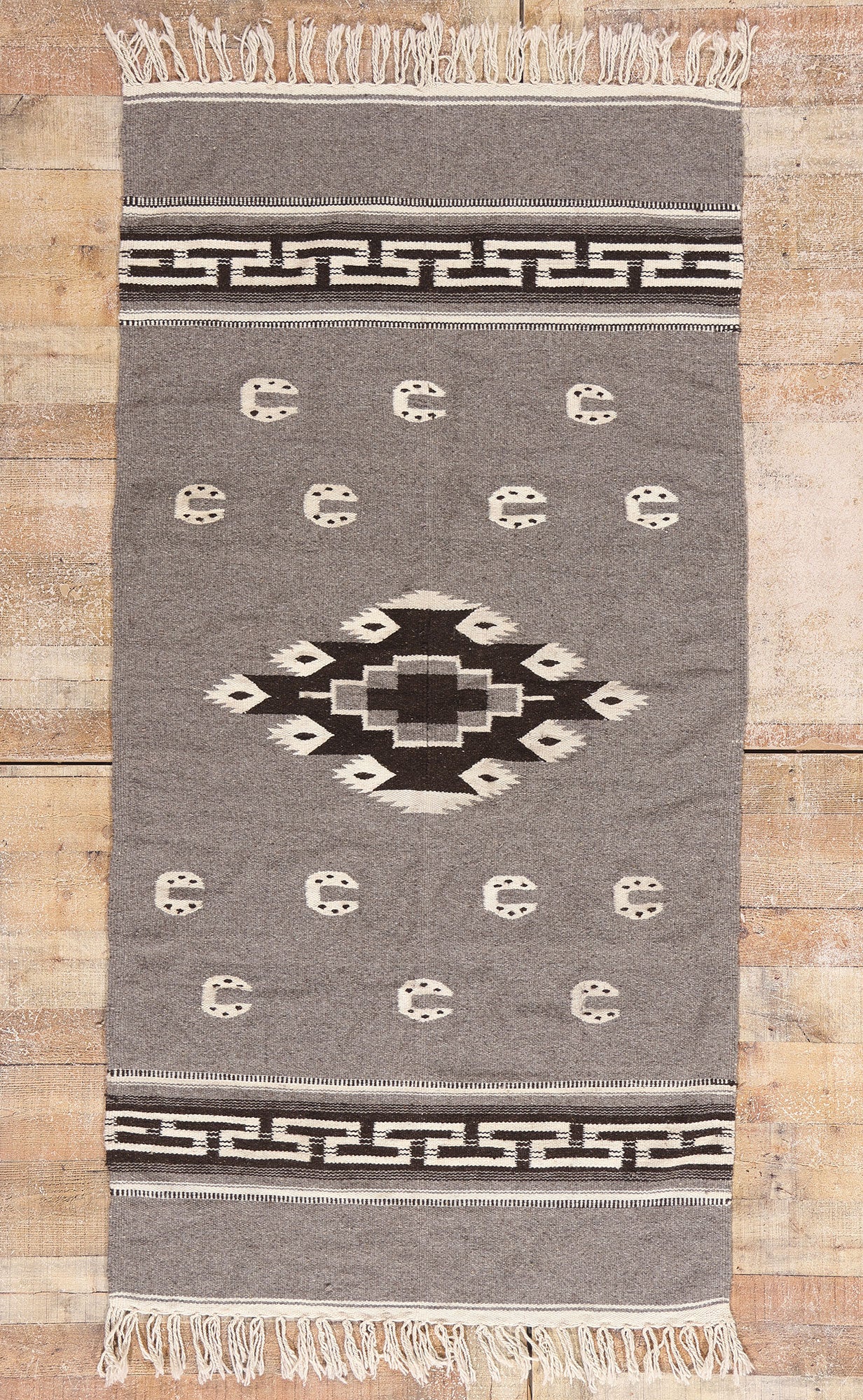 The Zapotec rug’s background field is a heathered gray, offering a soft, organic foundation that allows the symbolic elements to breathe. Scattered across the field are horseshoe-like motifs, which may reference agricultural prosperity or equestrian symbolism—an homage to the rugged terrain and working traditions of the Oaxacan valleys. Flanking each end are interlocking Greek key motifs, a powerful visual metaphor for continuity, unity, and the strength of community. These stylized borders echo ancient architectural friezes and lend the piece a rhythm of balance and enclosure.