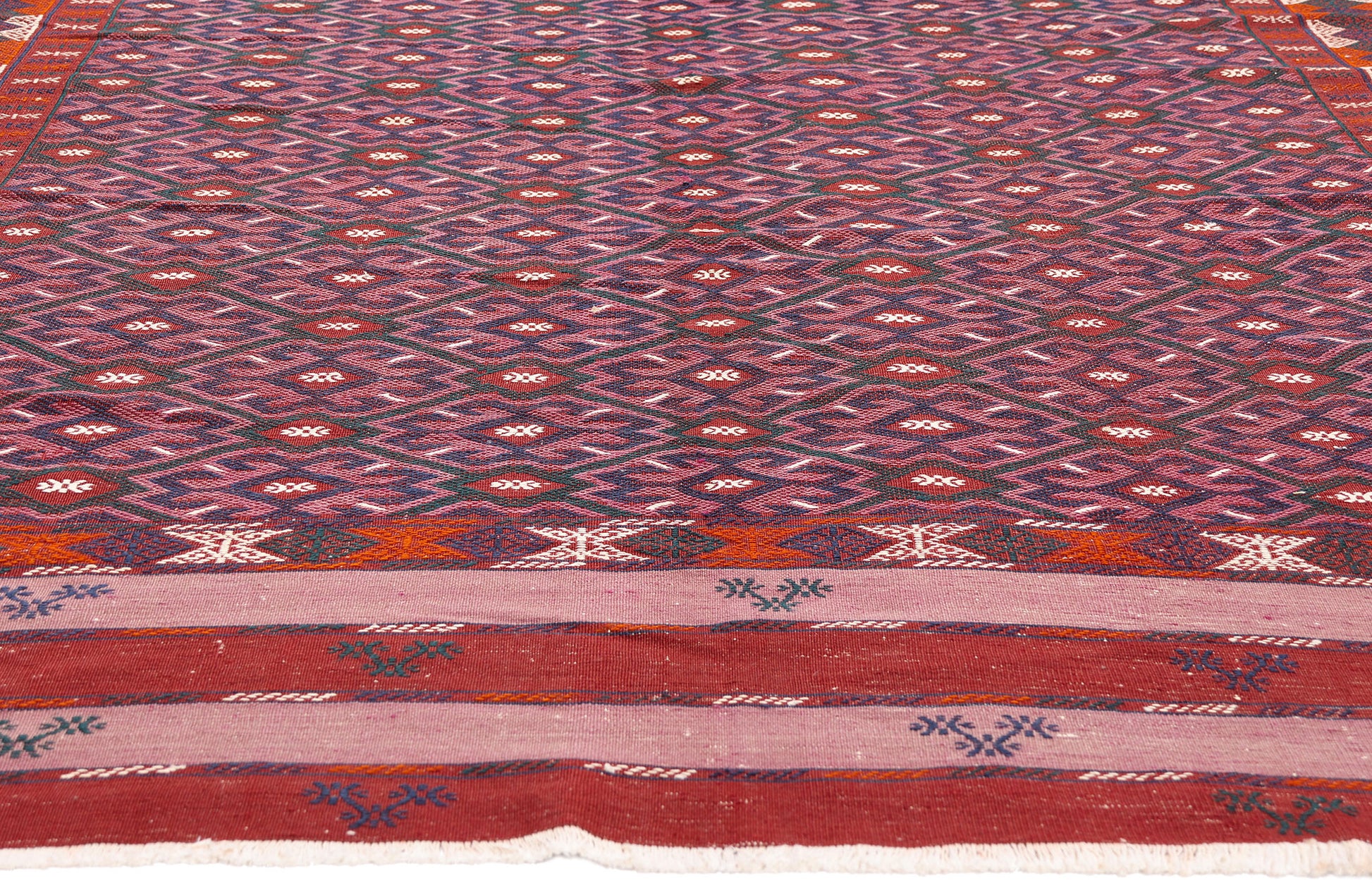 Across the richly saturated field, an allover pattern of Bereket motifs unfolds in rhythmic repetition, forming a tapestry of union and continuity. Each compartment is a powerful pairing: the “Hands on Hips” (elibelinde), symbolizing femininity, motherhood, and creation, joined with the Ram’s Horn (kocboynuzu), emblematic of masculinity, strength, and heroism. Together, they form a visual expression of partnership—man and woman intertwined in balance, fertility, and shared existence. At the heart of each iconic motif lies the protective eye, quietly guarding the family from unseen harm, ensuring that prosperity and harmony endure.