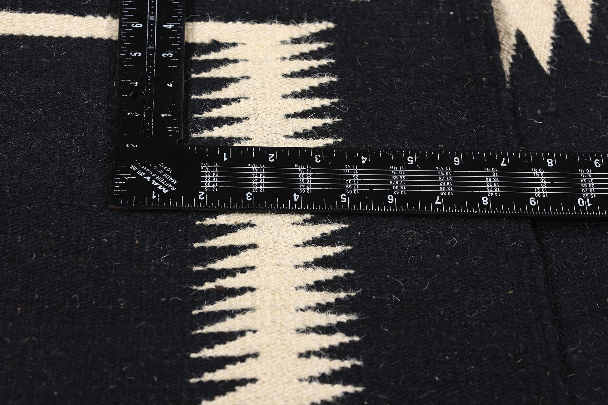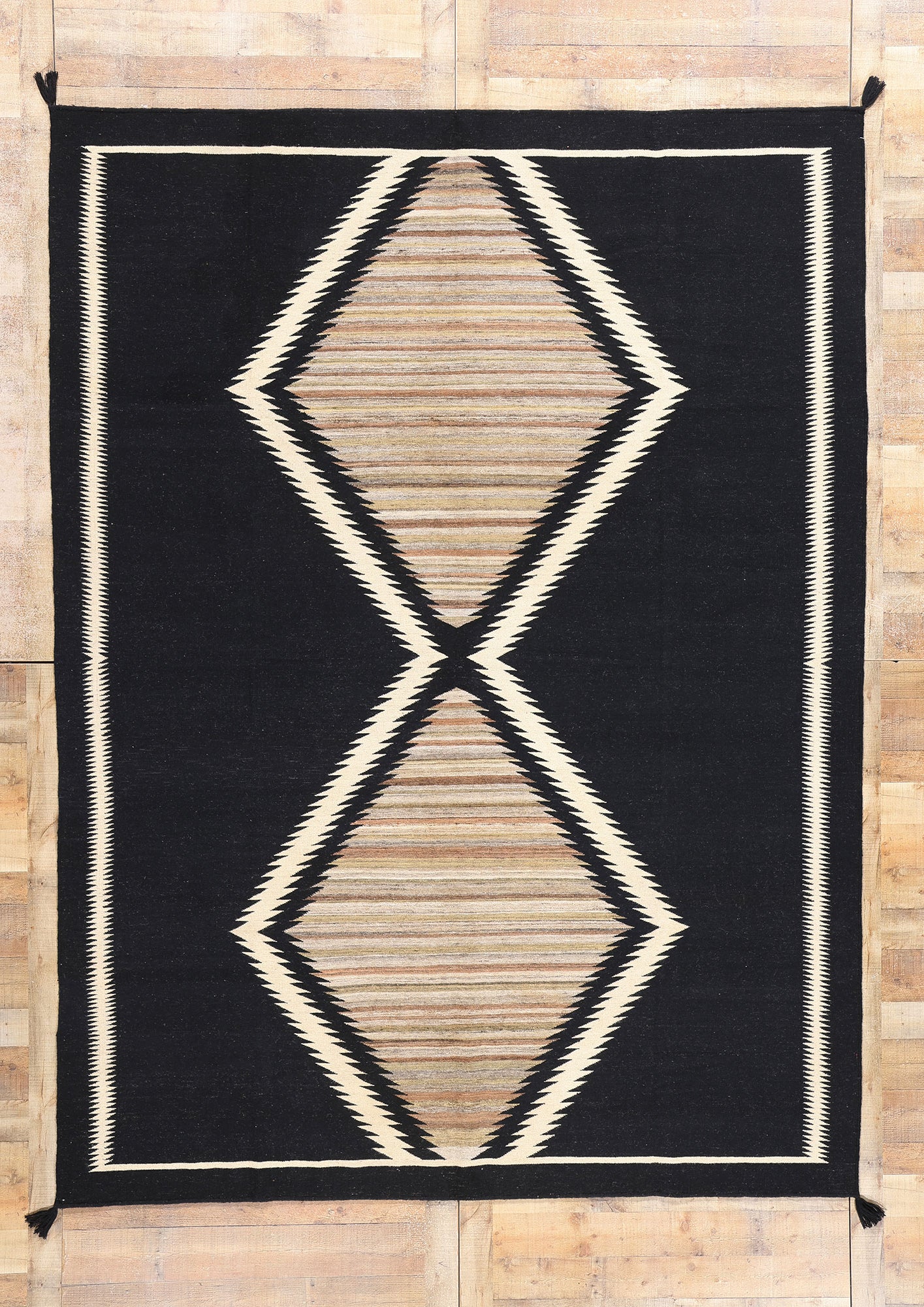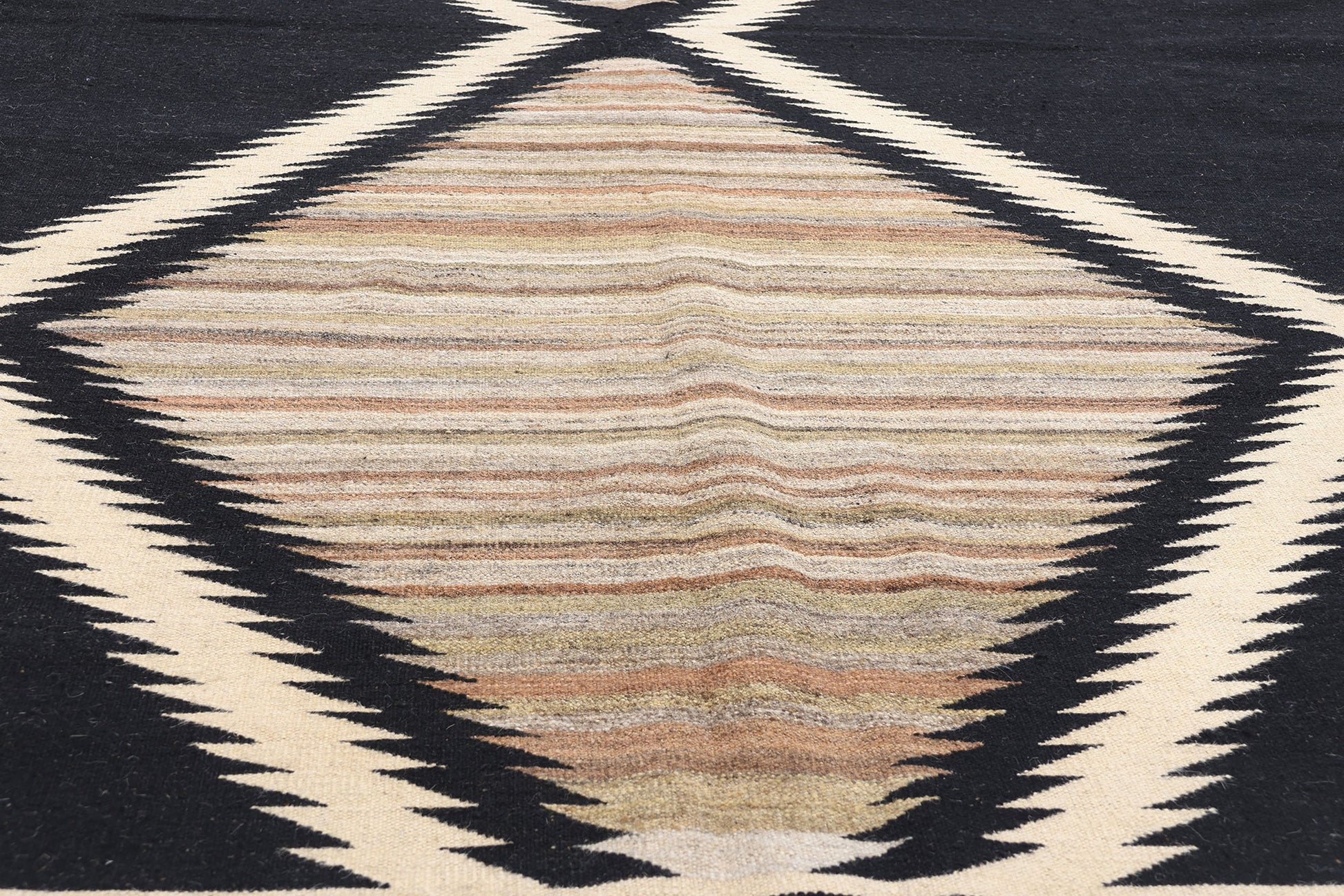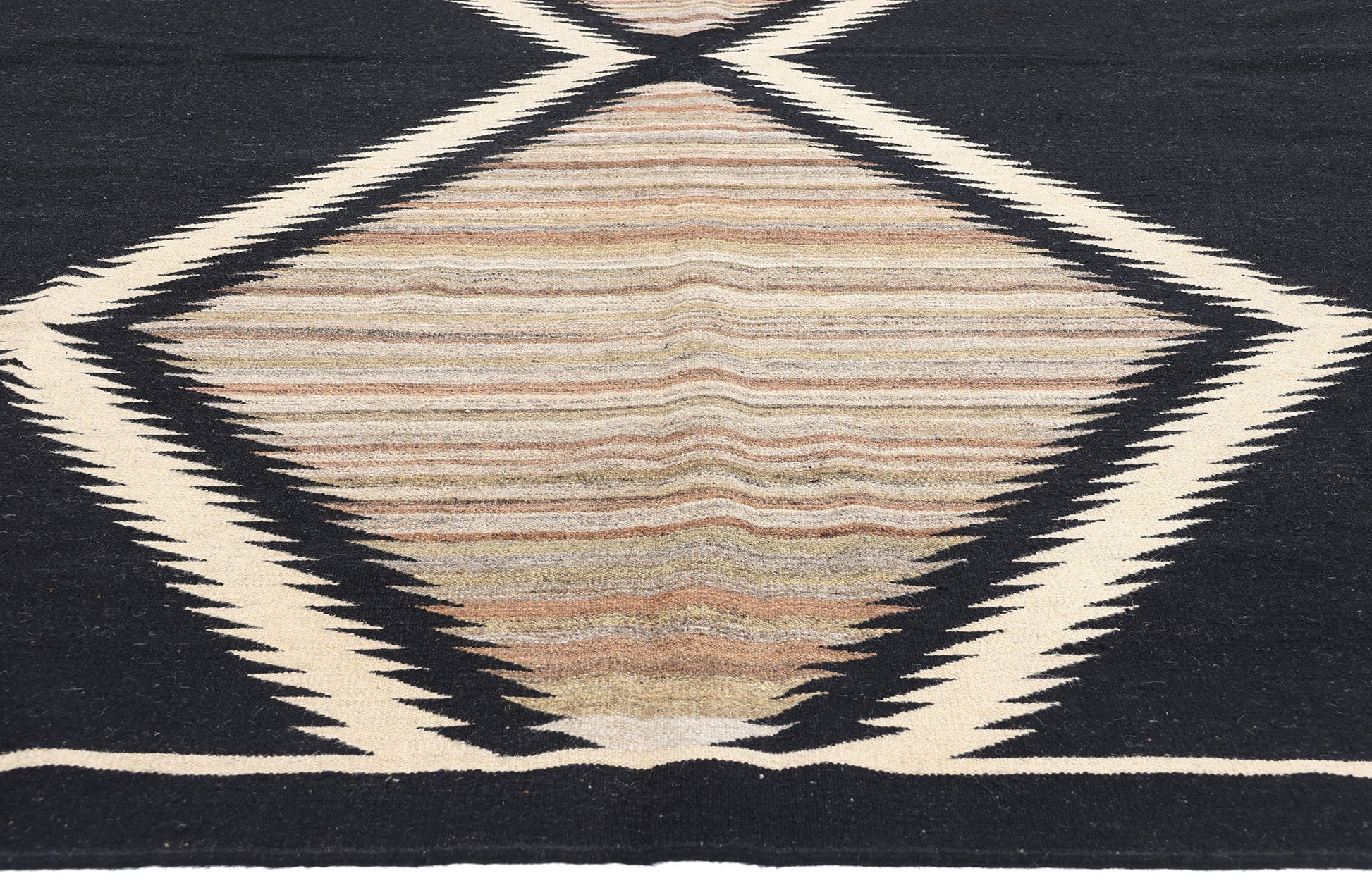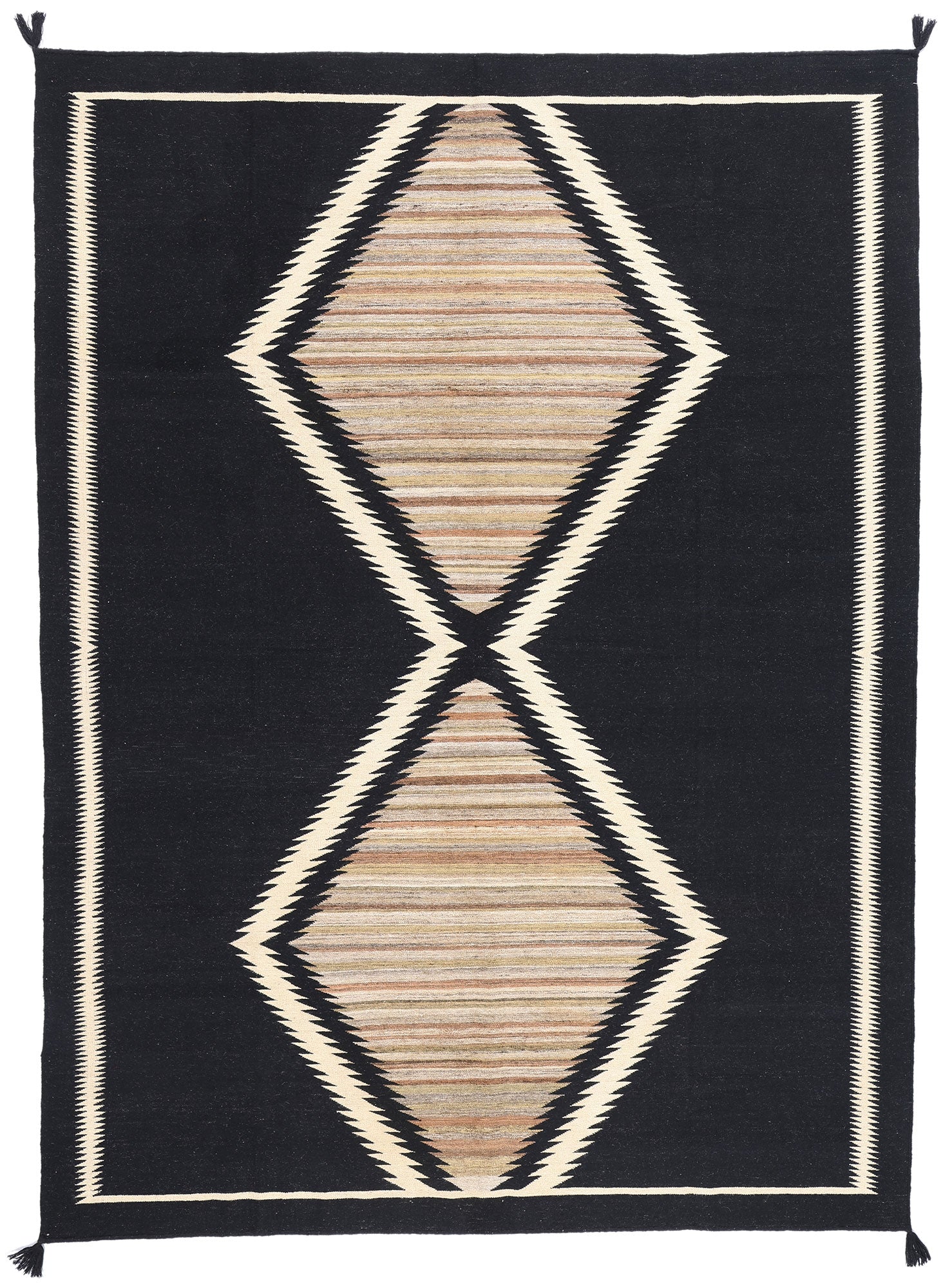 This handwoven wool Modern Two Grey Hills Navajo-style kilim rug is a stunning representation of Southwest Modern design, inspired by the renowned Two Grey Hills Navajo rugs. The striking geometric design features two large, serrated diamonds in the center, connected at their points and framed by intricate zigzag lines. The diamonds are filled with horizontal striations in earthy tones of brown, beige, and gray, creating a beautiful contrast against the deep black background. The boldness of the black field enhances the sharpness of the beige border and accentuates the pattern’s clean lines and symmetry.