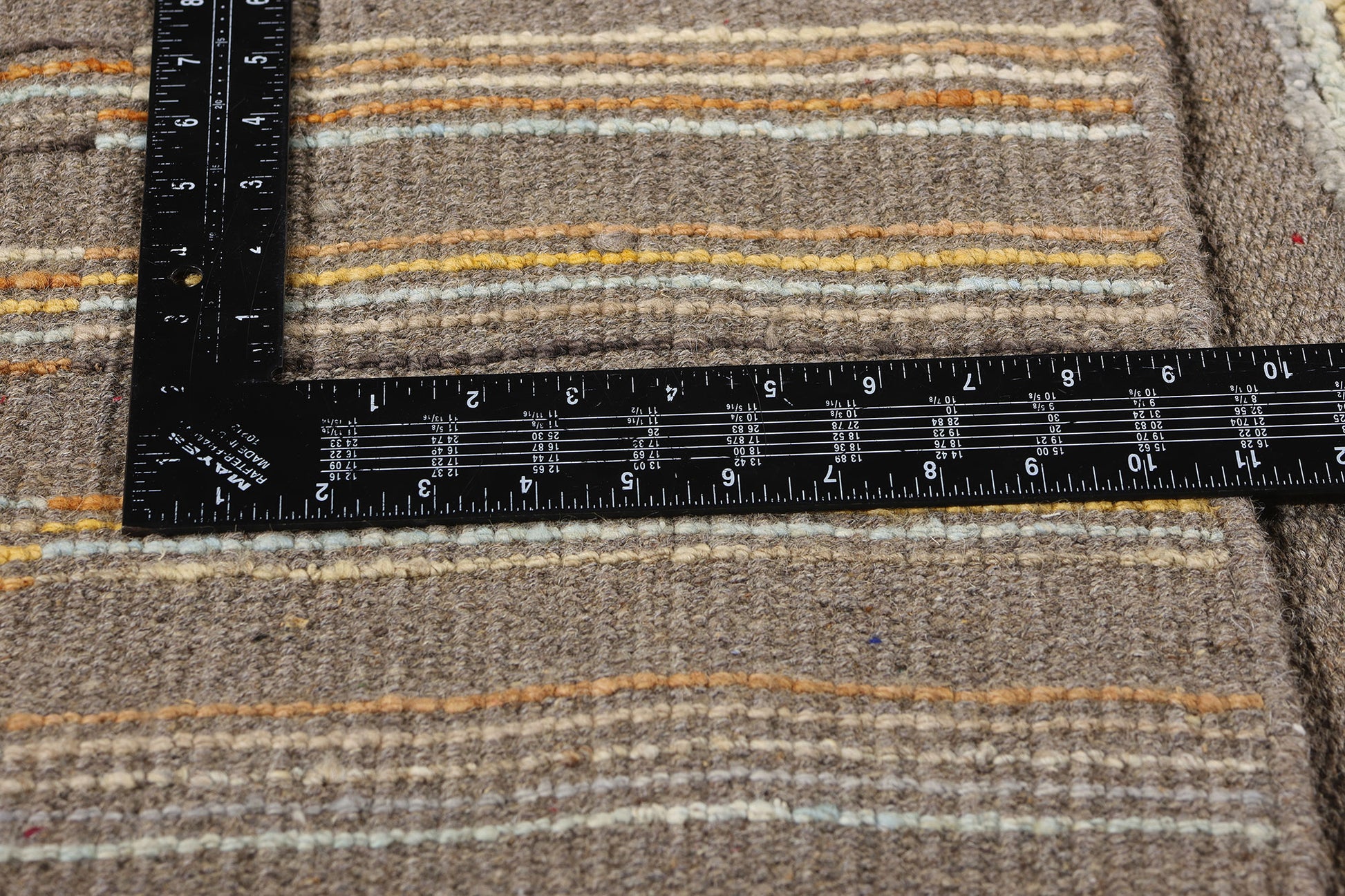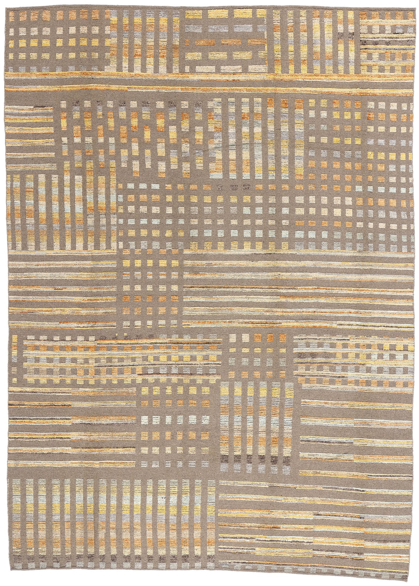 The high-low rug's earthy taupe field is accented by a palette of warm golden hues, soft grays, and hints of sky blue, evoking the gentle glow of sunlight filtering through a grid of urban architecture or natural landscapes. These tones create a balanced aesthetic that feels both grounded and uplifting, allowing this modern masterpiece to seamlessly integrate into a variety of color schemes. The interplay of horizontal and vertical lines lends a sense of rhythm and order, while the varying widths and orientations of the motifs add depth and visual intrigue.