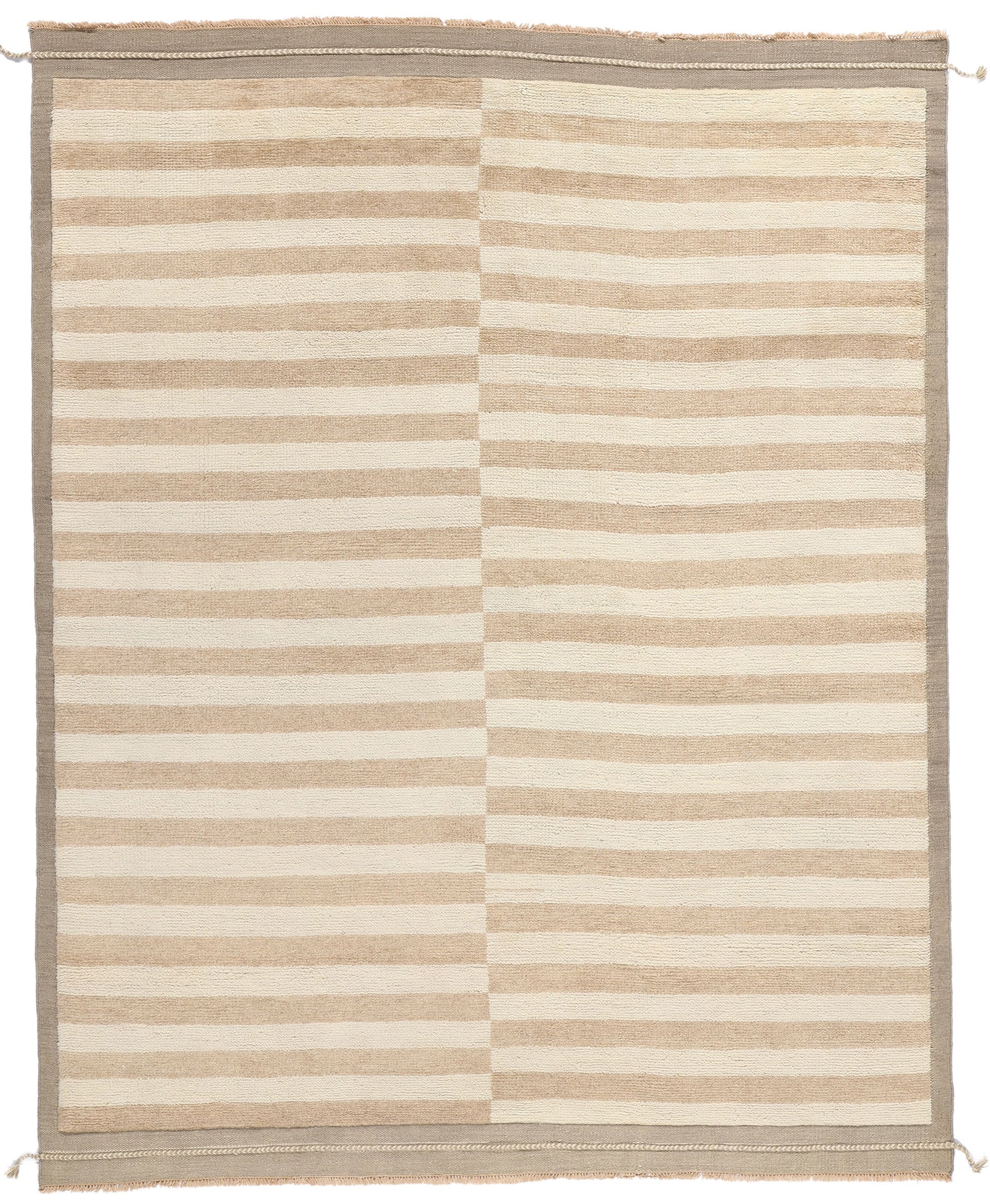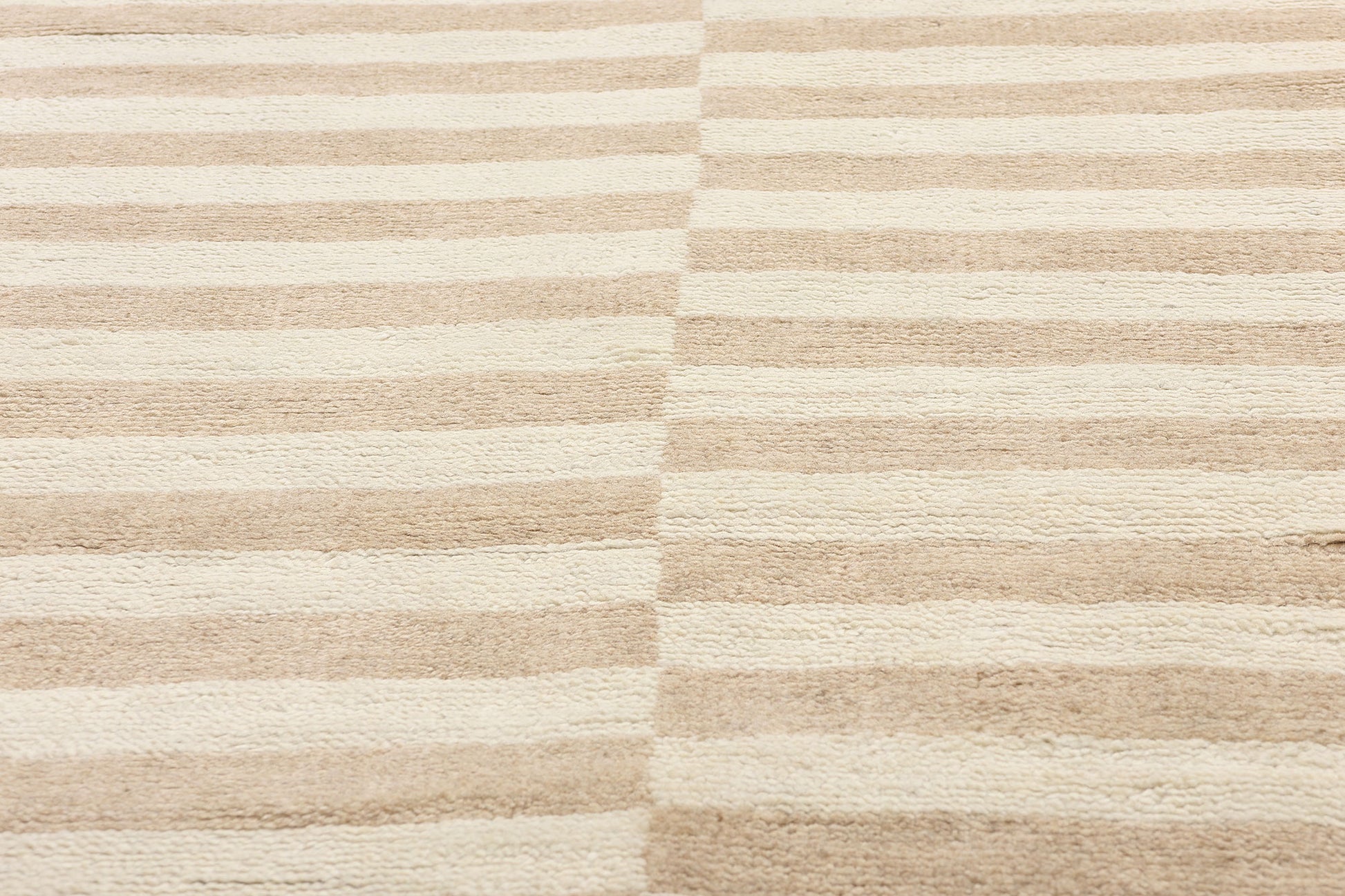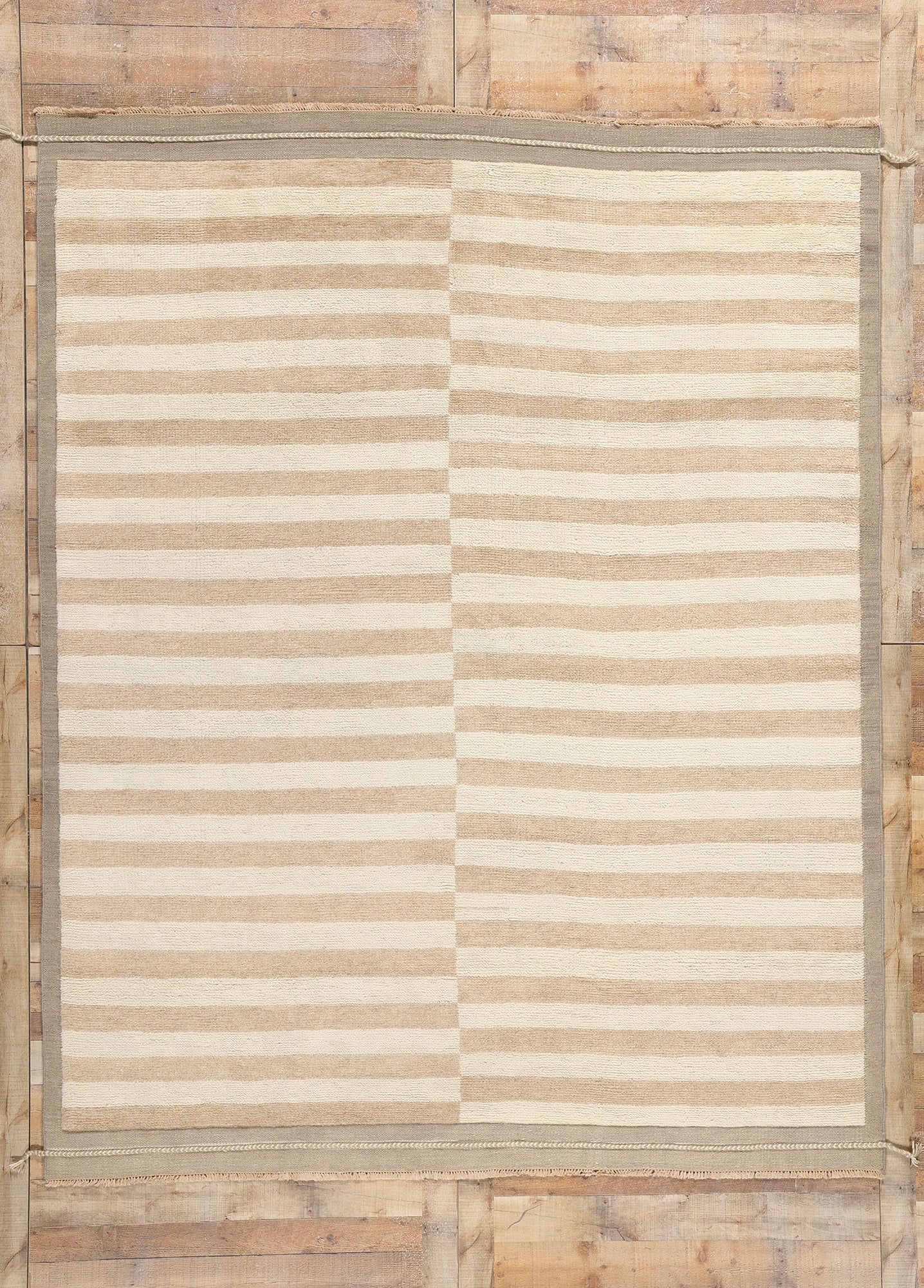 Embrace the serene beauty of simplicity with the Desert Lines Organic Modern Moroccan Rug. This hand-knotted wool Moroccan area rug showcases an elegant interplay of beige and tan horizontal bands, evoking the natural hues of sunlit sand and the neutral tones of a desert landscape. Its earth-tone striped pattern flows across the surface like a series of nomadic pathways, capturing the essence of a journey across vast, open spaces. The rug's minimalist design invites you to explore the subtle textures and organic variations inherent in its handcrafted Indian construction.