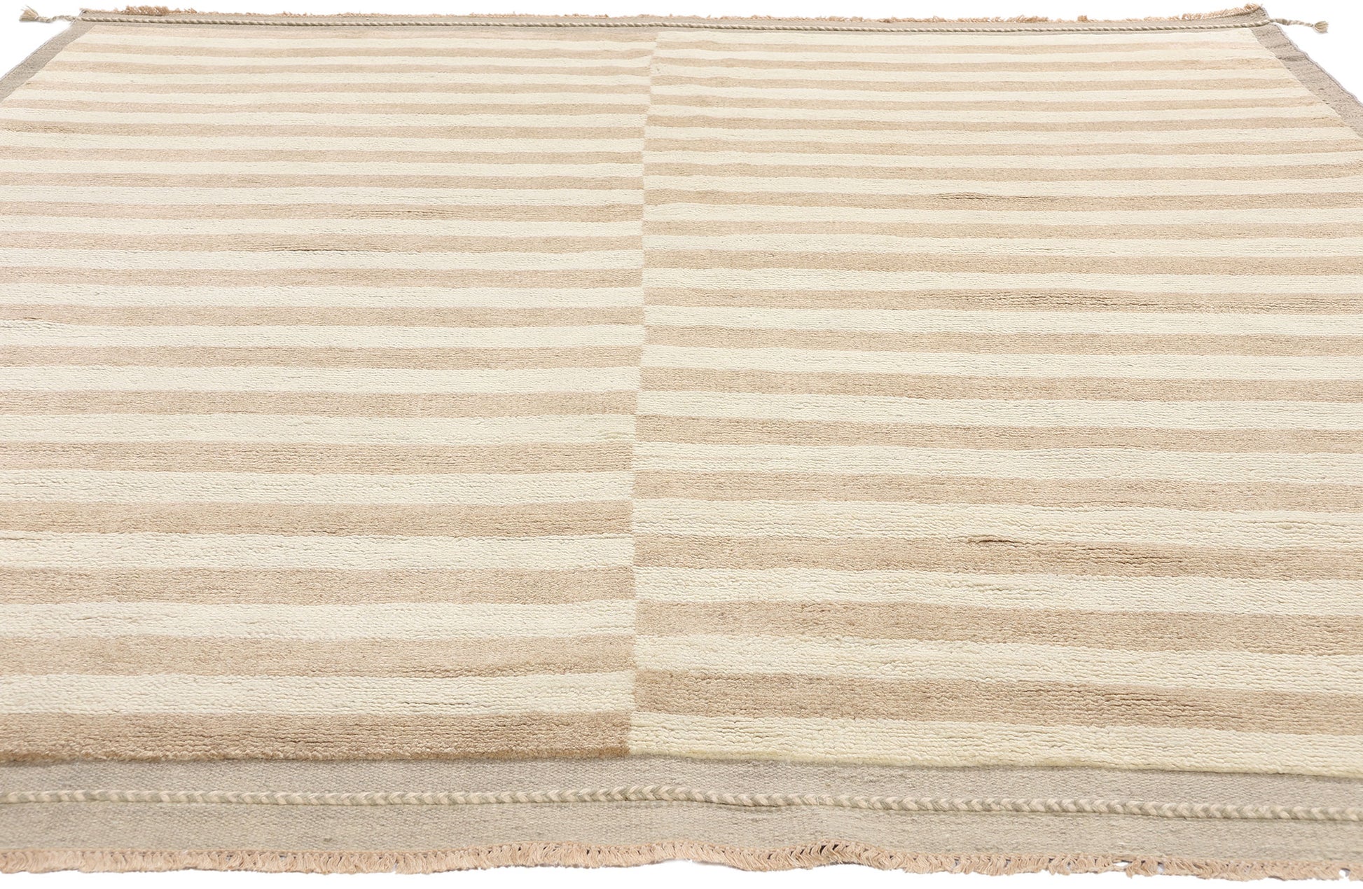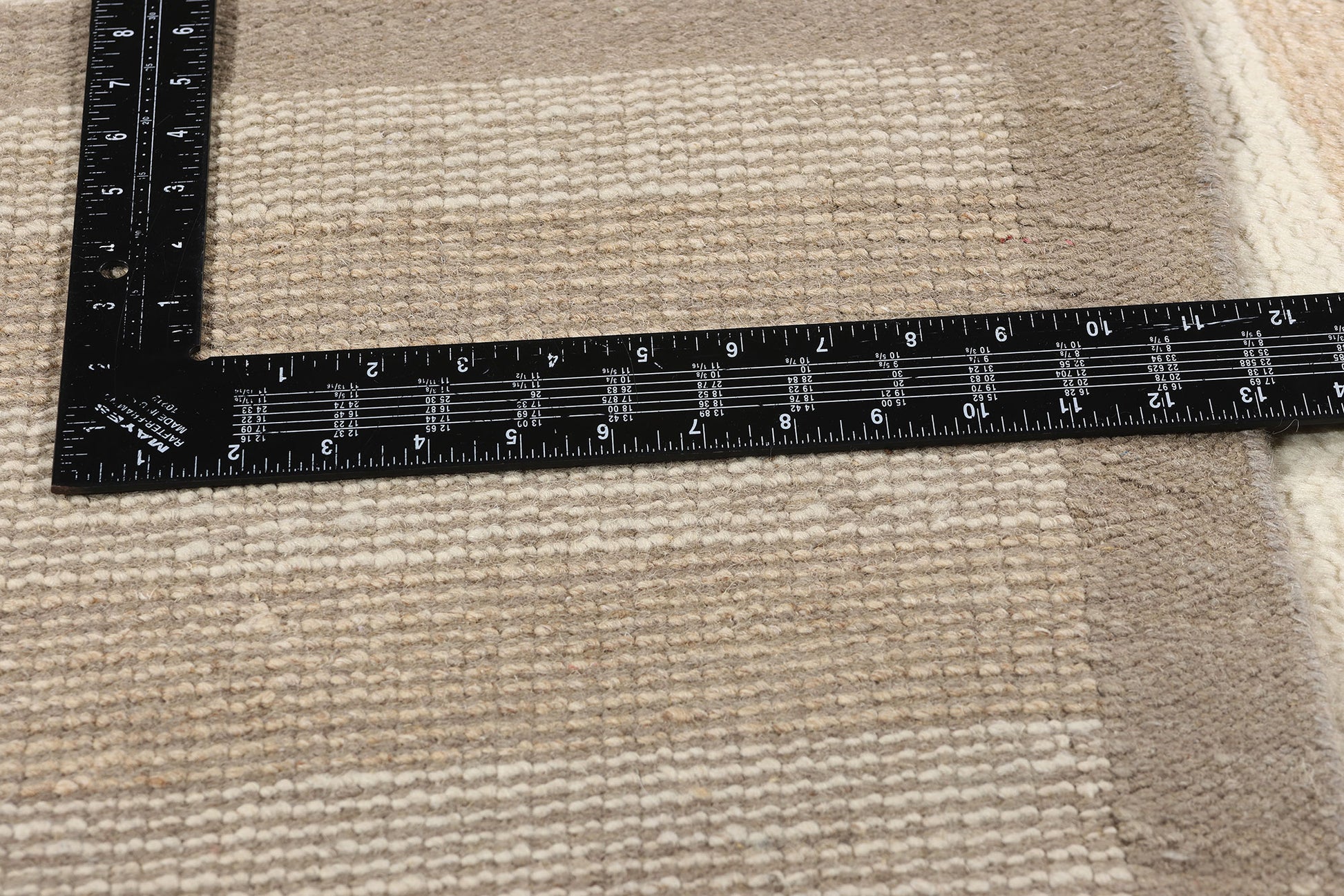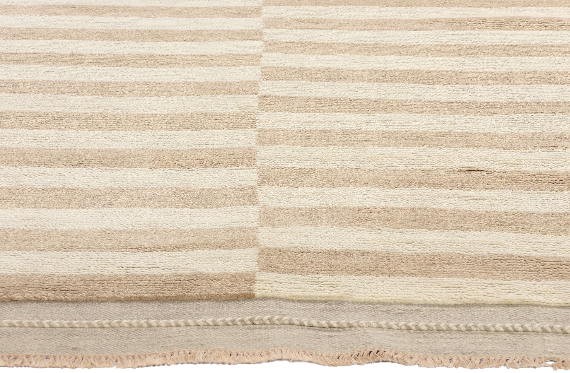 Embrace the serene beauty of simplicity with the Desert Lines Organic Modern Moroccan Rug. This hand-knotted wool Moroccan area rug showcases an elegant interplay of beige and tan horizontal bands, evoking the natural hues of sunlit sand and the neutral tones of a desert landscape. Its earth-tone striped pattern flows across the surface like a series of nomadic pathways, capturing the essence of a journey across vast, open spaces. The rug's minimalist design invites you to explore the subtle textures and organic variations inherent in its handcrafted Indian construction.