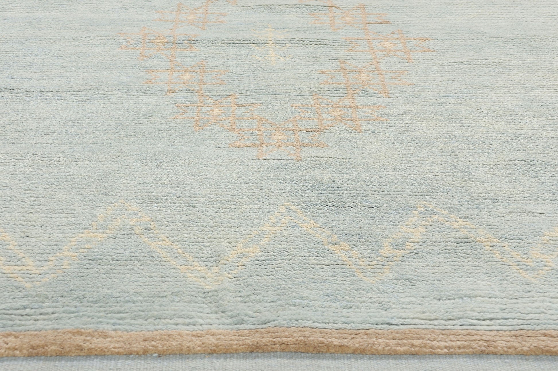 This hand-knotted wool Sahara Stars Modern Moroccan rug is a timeless piece that beautifully captures the ethereal beauty of desert landscapes under the night sky. The subtle yet enchanting design features eight-point star motifs set against a soft backdrop of light sky blue, creating a serene ambiance that radiates tranquility. The use of minimalist geometric lines adds a modern edge to this traditional Moroccan design, making it a versatile addition to both contemporary and classic interiors.