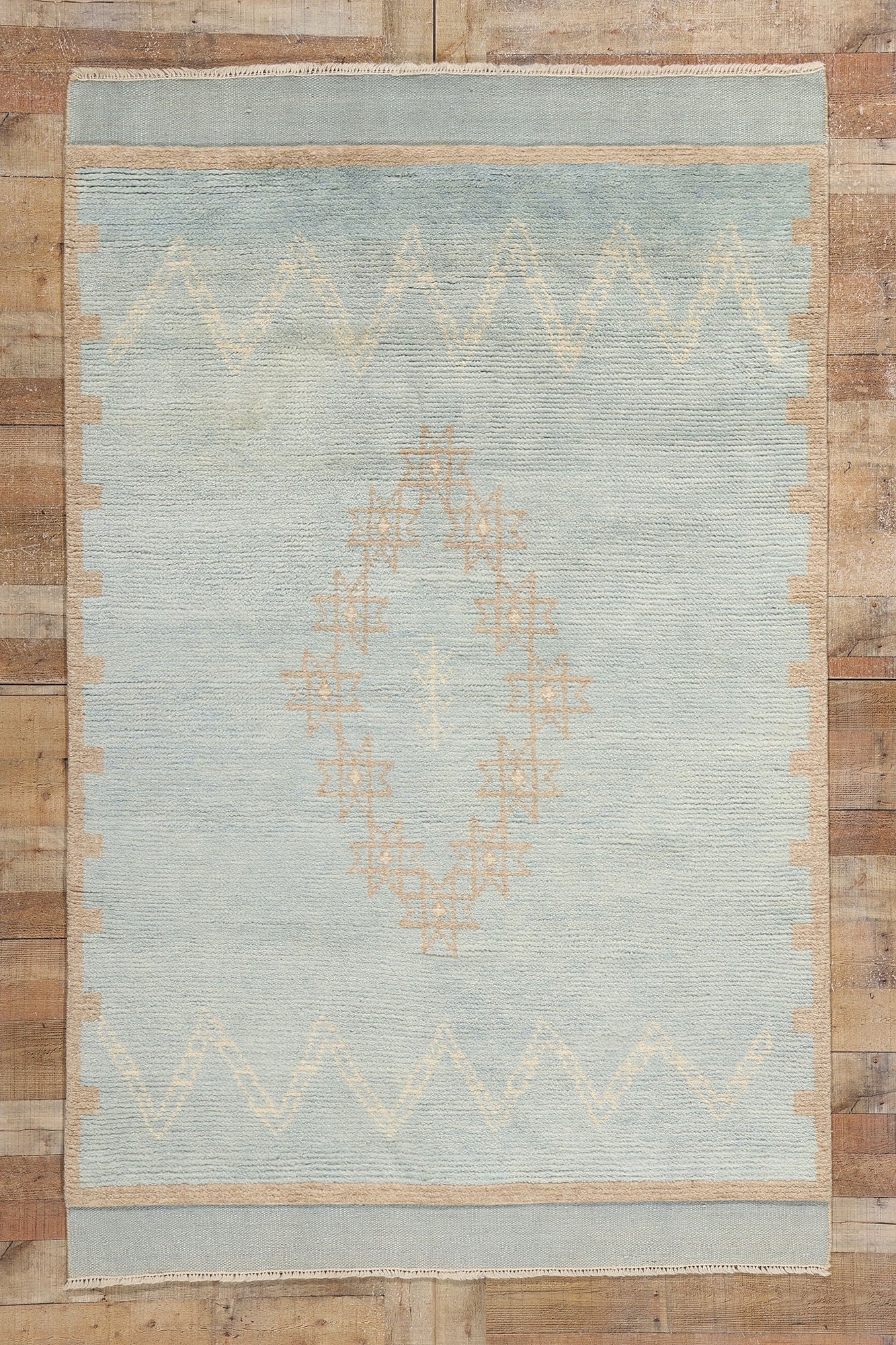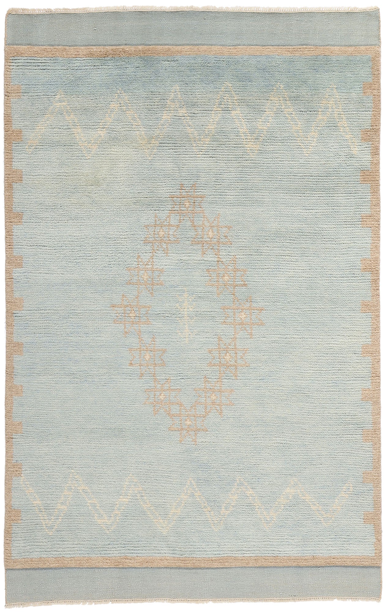 The Moroccan area rug's carefully chosen color palette, with its calming light blue field and gentle beige and tranquil taupe accents, evokes the expansive openness of a desert sky at dusk. The intricate central medallion, composed of delicate star shapes, adds a layer of celestial beauty, hinting at ancient symbolism and Moroccan craftsmanship. Surrounding the medallion, zigzag Chevron patterns recall the undulating dunes of the Sahara, offering a rhythmic visual flow that enhances the overall harmony of the design.