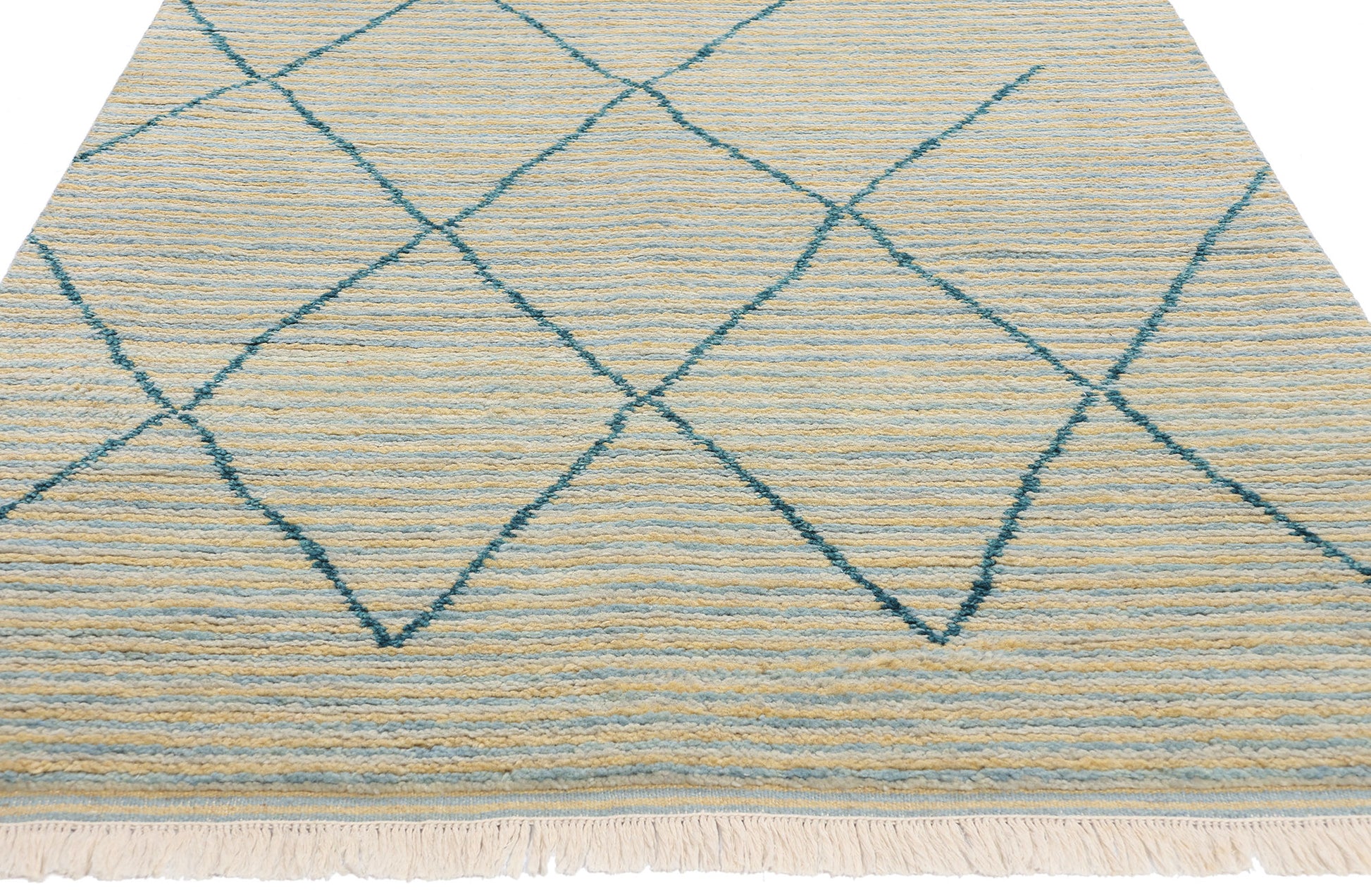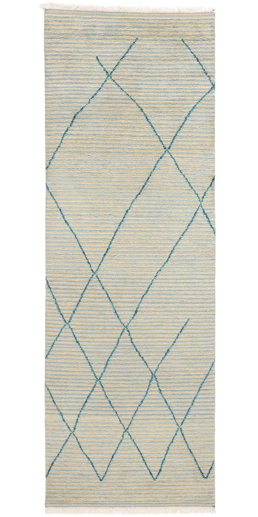 The Serene Strands Modern Moroccan rug runner is a captivating blend of tradition and modernity, designed to bring tranquility and sophistication to nearly any hallway or narrow space. Hand-knotted from high-quality wool, the Moroccan rug features a soothing palette of soft beige hues, accentuated by graceful strands of light blue lines that form an elegant lattice pattern. The understated color palette evokes a sense of calm and serenity, making it a perfect addition for those looking to create a peaceful, inviting atmosphere in their home.