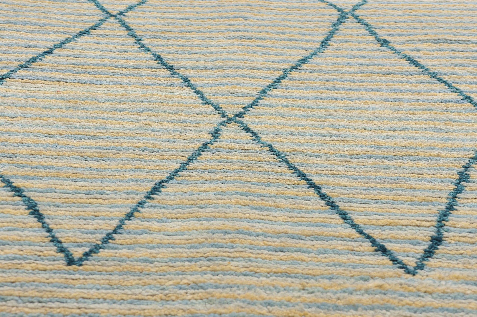 Each cerulean line of the lattice is thoughtfully woven to create a rhythmic, flowing design reminiscent of ripples on a serene water surface or the gentle sway of coastal grasses in the breeze. The pattern is at once simple and intricate, capturing the essence of Moroccan artistry while offering a contemporary aesthetic that effortlessly complements modern and minimalist interiors. The interplay of beige and blue hues creates a subtle visual contrast, adding depth and character without overpowering the space.