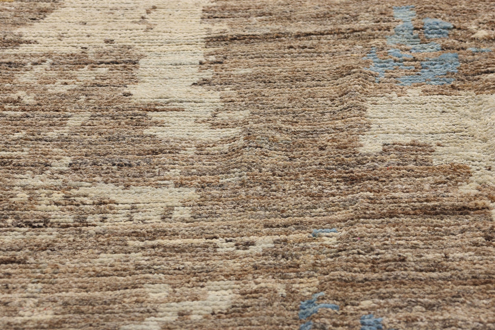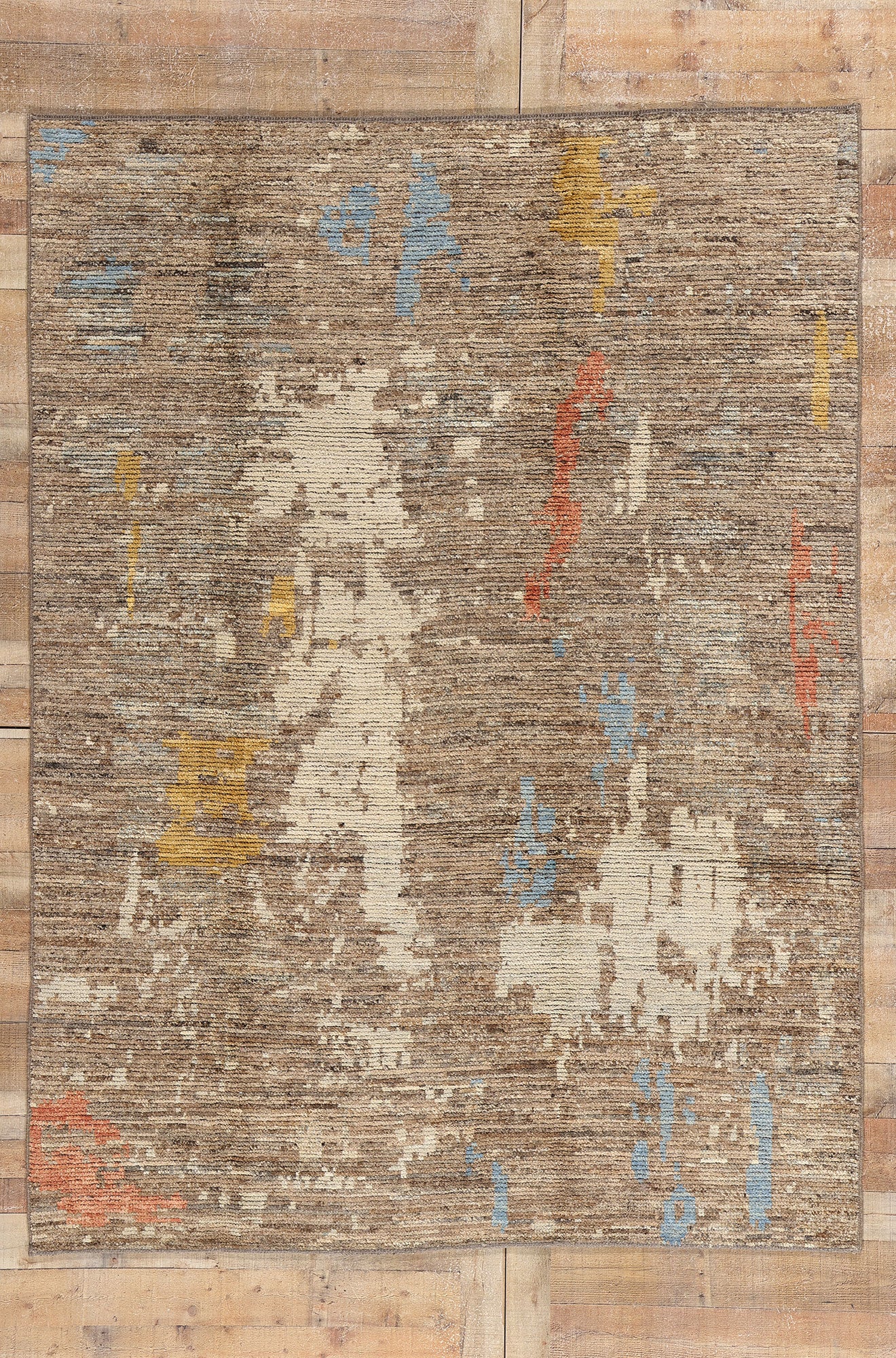 This hand-knotted wool Modern Desert Brushstrokes Moroccan rug from Pakistan is a striking work of art that captures the essence of desert landscapes through the fluidity of color and form. The mesmerizing earthy tones of the background, rich in shades of taupe and brown, provide a grounding foundation, while bursts of vibrant blue, yellow, and terra cotta red create a stunning contrast, evoking the splendor of desert sunsets and the organic beauty of nature. The brushstroke-inspired striations across the surface of the Moroccan area rug evoke a sense of energy and movement, adding depth and intrigue to the design.