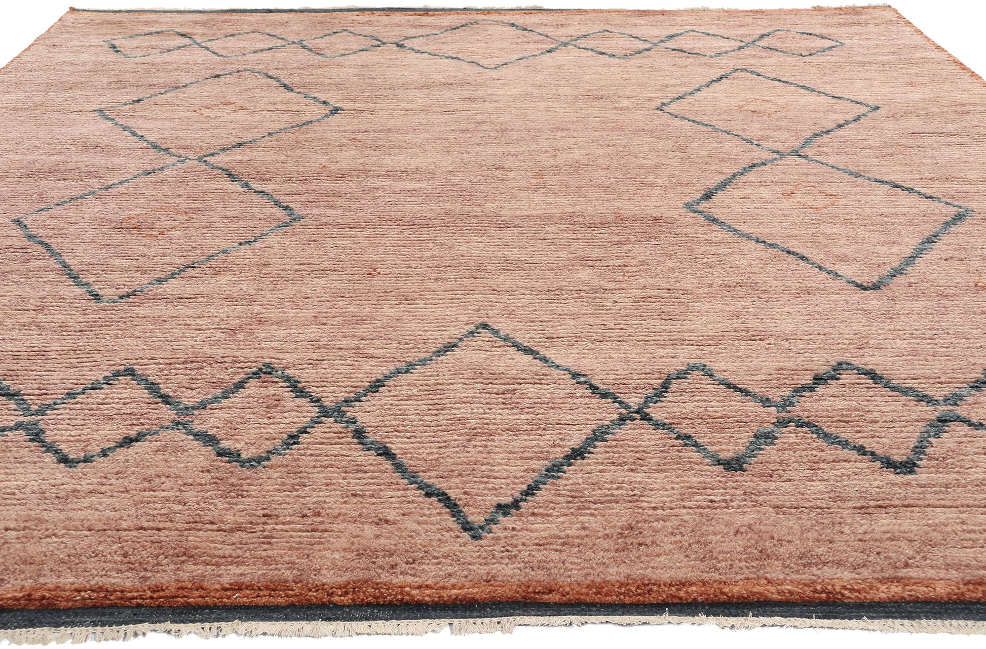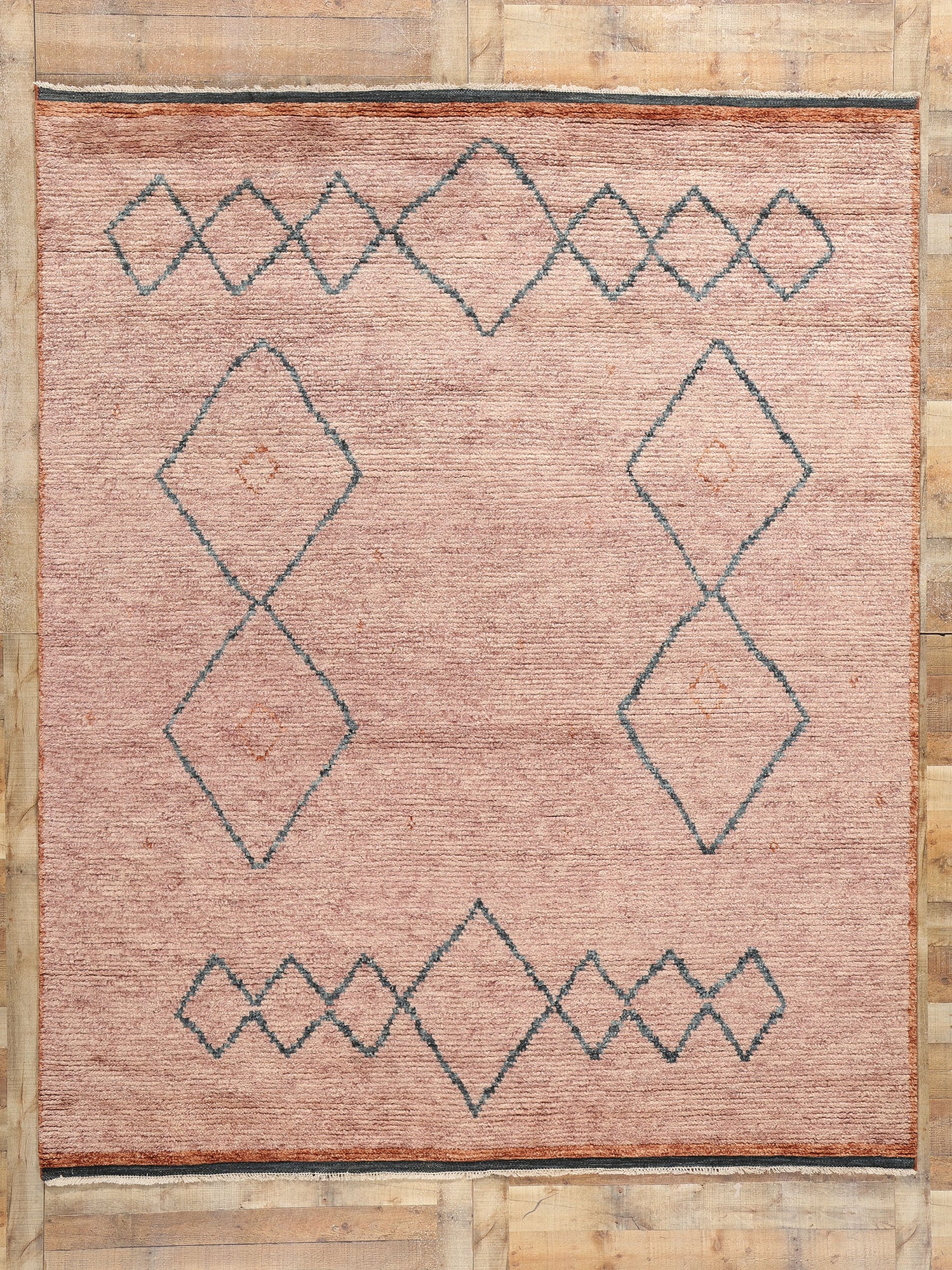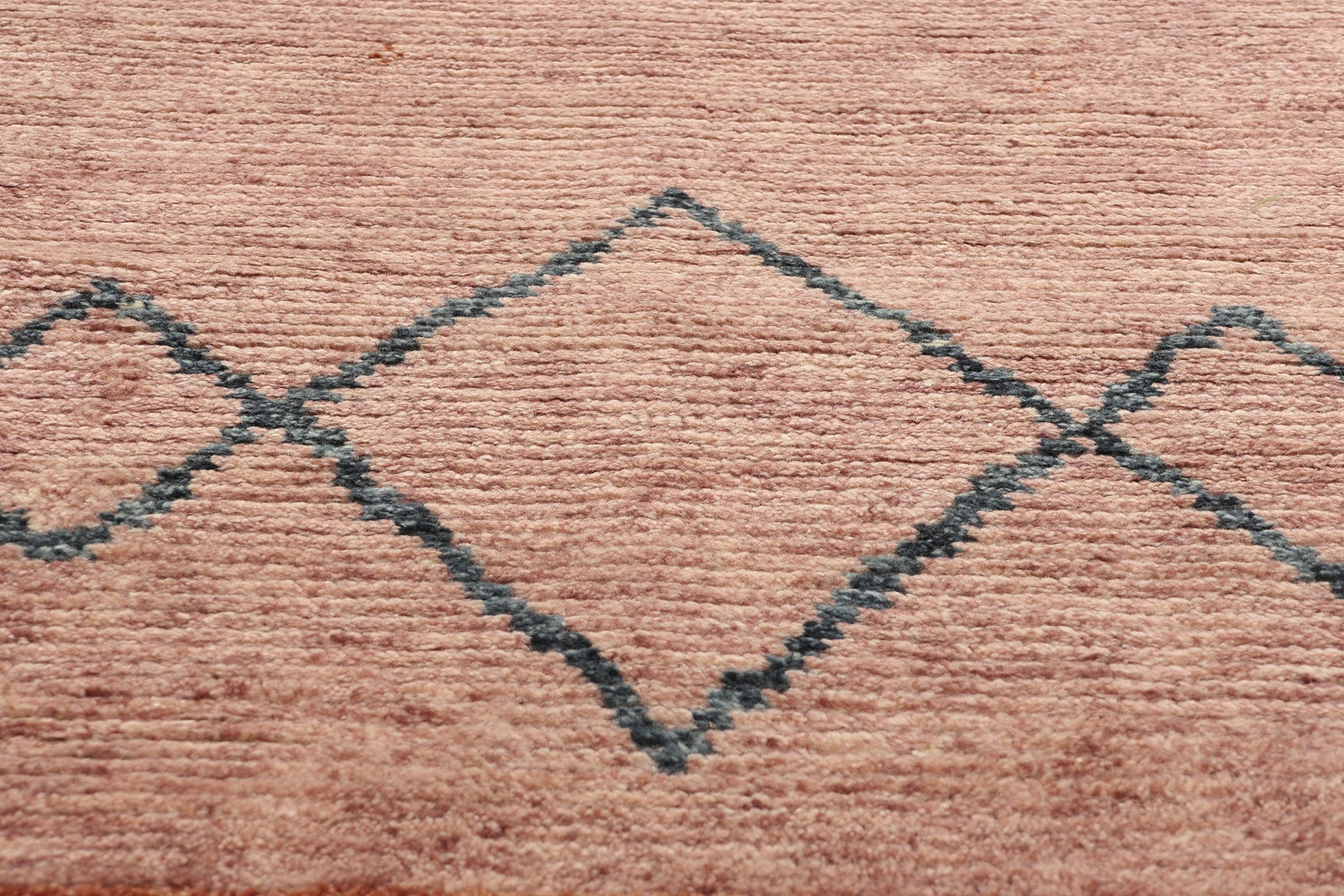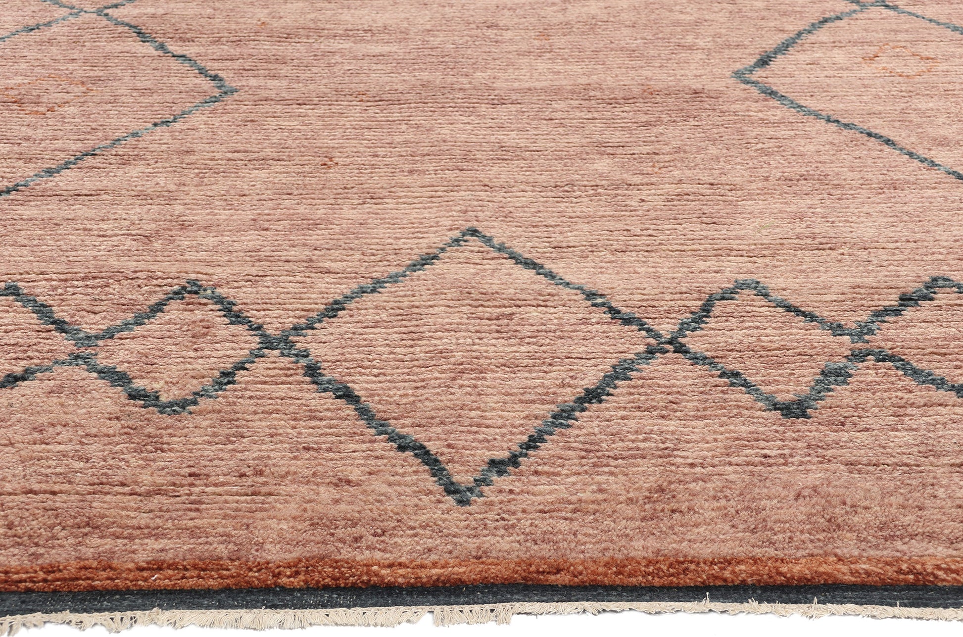 This hand-knotted wool Desert Blush Modern Pink Moroccan rug embodies a delicate fusion of earthy rose tones and contemporary elegance, capturing the serene essence of a modern desert landscape. The soft, earthy pink backdrop is both warm and inviting, evoking a sense of calm and tranquility that seamlessly blends into nearly any space. Its color palette, inspired by the subtle hues of a desert sunset, adds a touch of organic warmth that resonates with the natural beauty cherished in Organic Modern and Boho Chic interiors.
