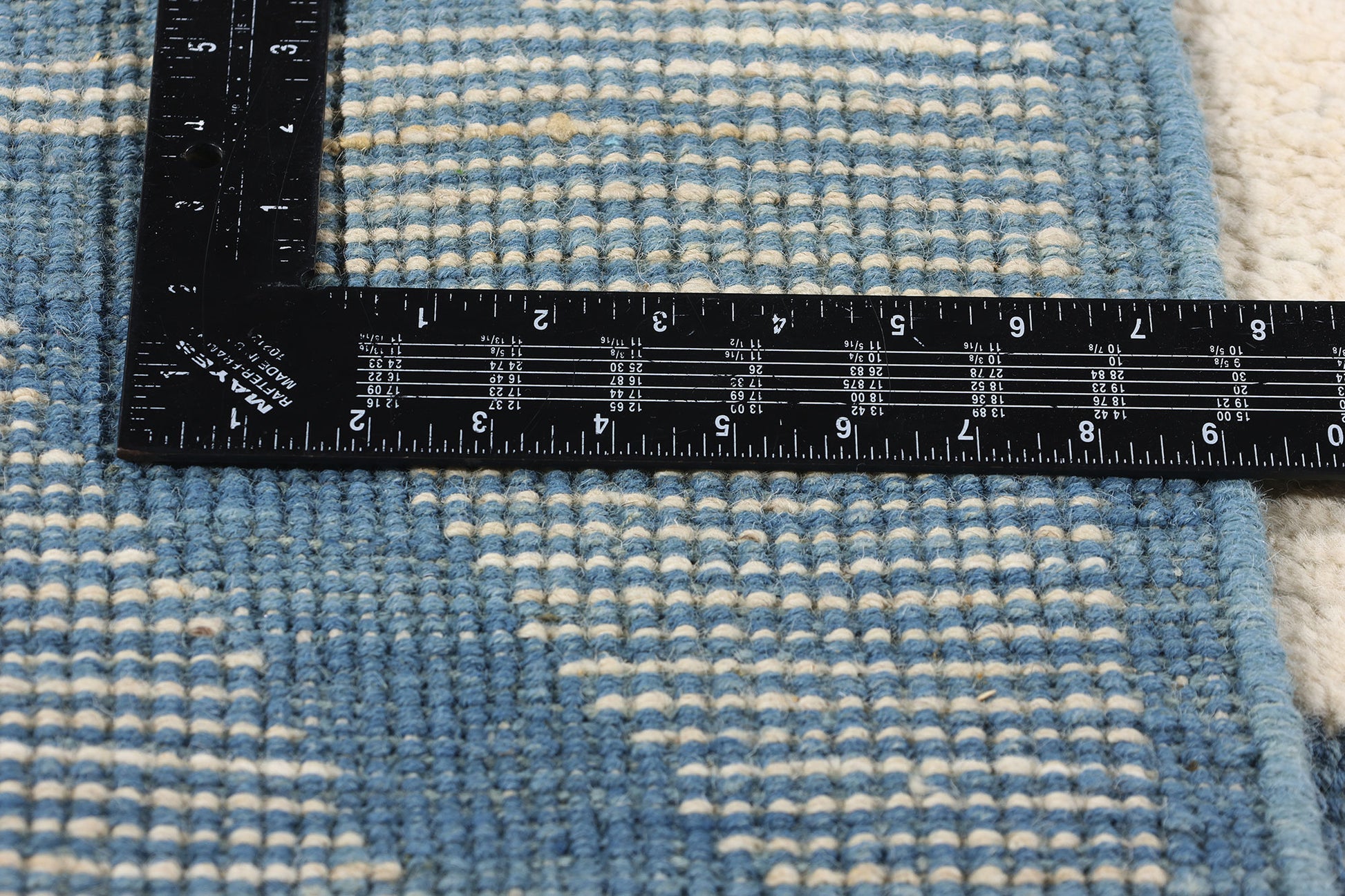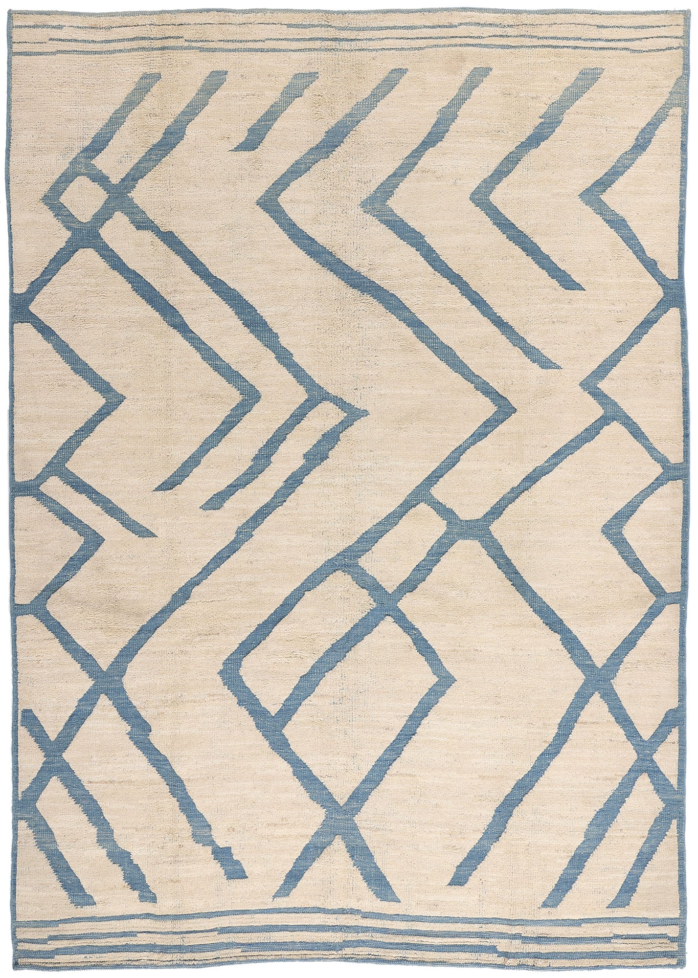 This hand-knotted wool Modern Abstract Flow Moroccan rug, crafted in Pakistan, is a stunning exploration of line and form. The flowing, angular lines in soft blue contrast beautifully with the light beige background, creating a sense of motion and fluidity. These lines, seemingly spontaneous, traverse the surface with graceful abandon, forming abstract shapes that evoke the natural flow of water, wind, and energy. The rug’s design captures the essence of modern minimalism while maintaining a connection to organic shapes that remind one of nature’s rhythmic patterns.