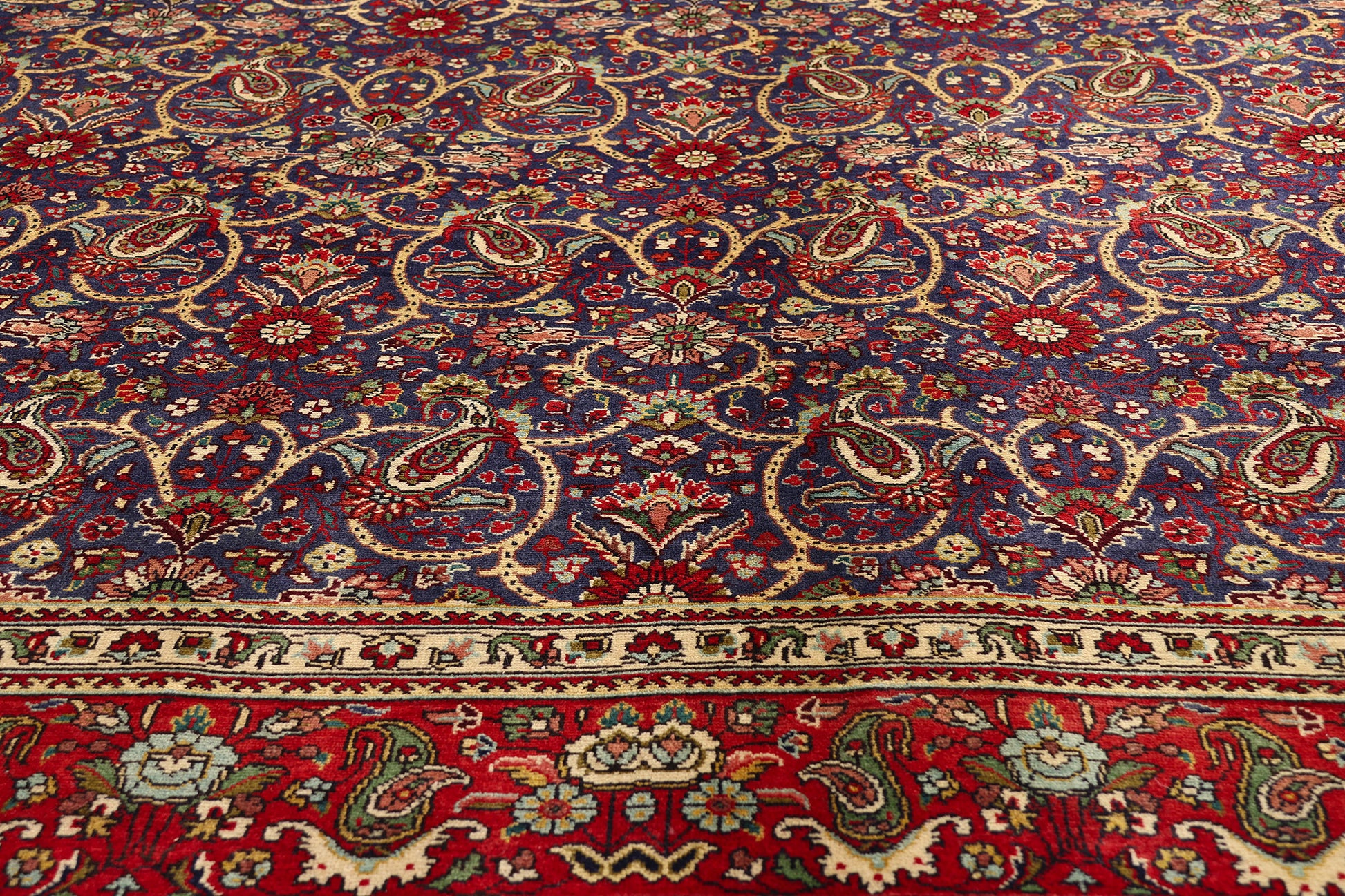 Framing this intricate orchestration is a rich red border adorned with boteh blossoms, a classic symbol of divine flame and perpetual growth. Flanked by inner and outer ivory floral meander guard bands, this exquisite work of art is balanced and complete, echoing the classical proportions and philosophical harmony that have long made these exclusive Tabriz weavings the jewels of royal courts and discerning collectors alike.