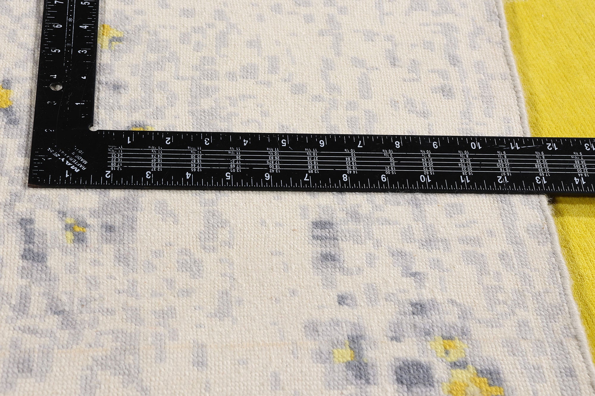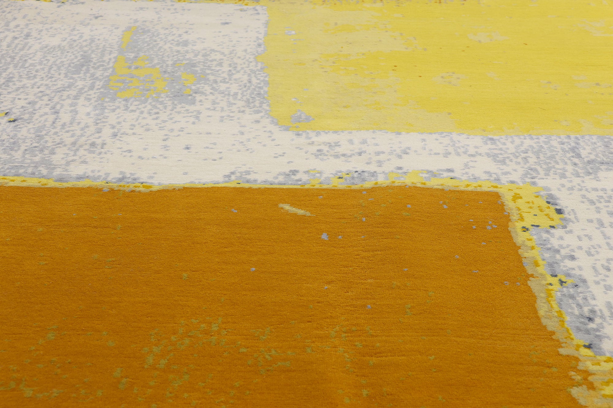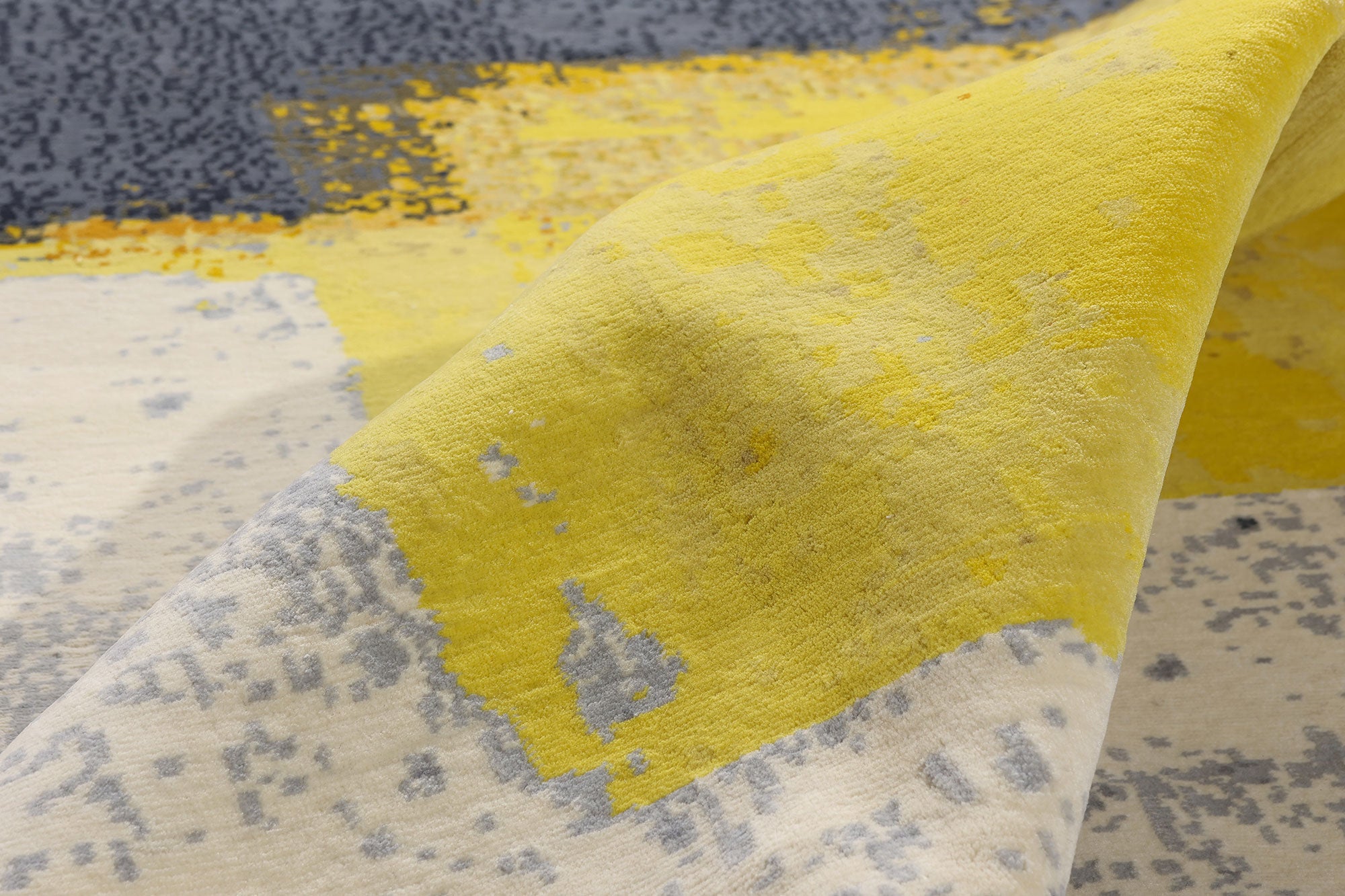 A bold exploration of color, form, and movement, this hand-knotted wool and silk contemporary rug transcends the boundaries of traditional weaving and enters the realm of fine art. Its asymmetrical block pattern—executed in striking shades of saffron, gold, ivory, slate, and obsidian—evokes the spontaneity of Abstract Expressionism, while the structural weight of its forms recalls the disciplined geometry of Cubist composition. This is not merely a rug, but a canvas of woven pigment, a statement piece designed for those who see their interiors as extensions of their personal gallery.