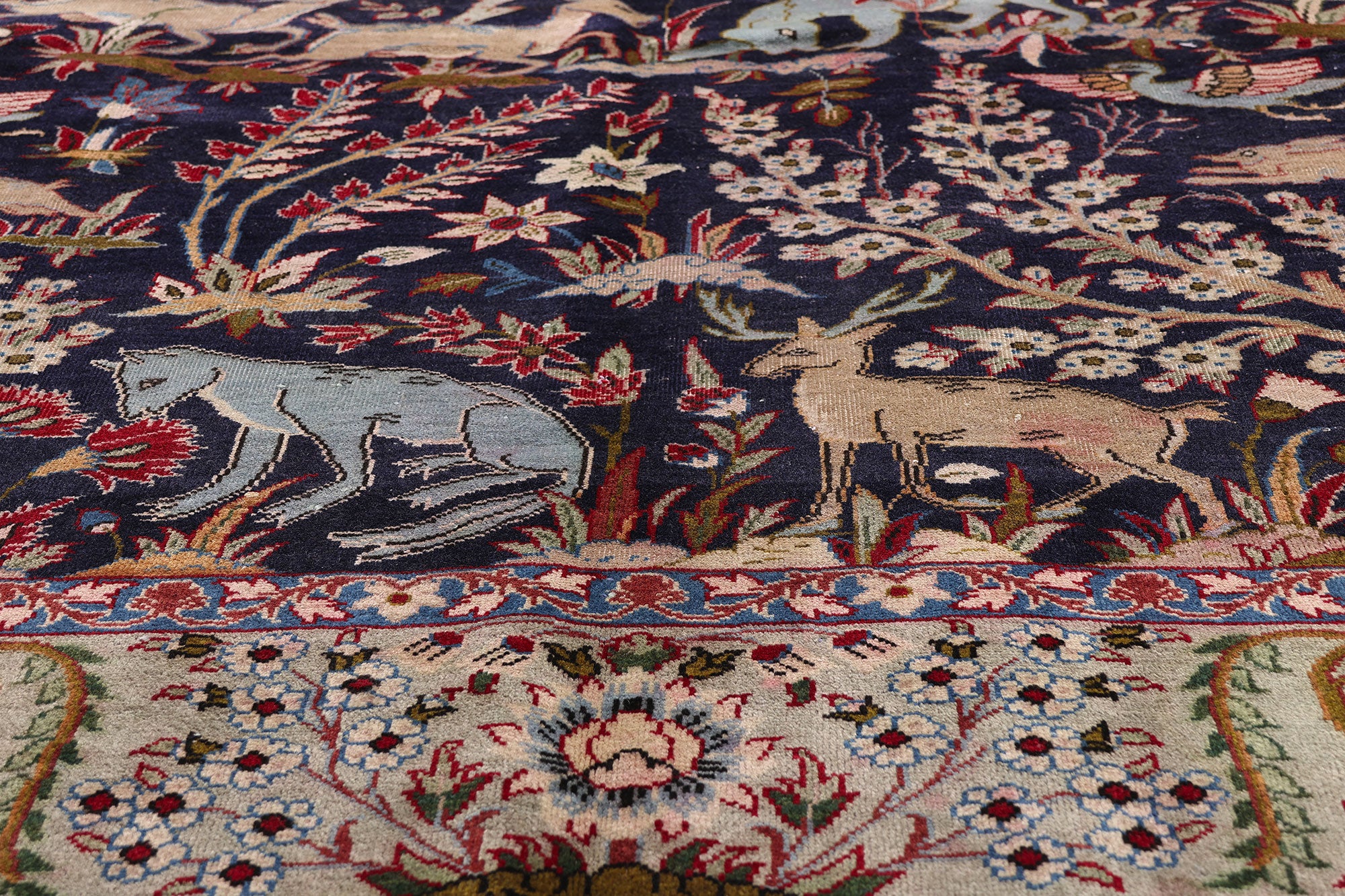 The sumptuous border, rendered with a painter’s sensitivity, creates an elegant frame of repose — a sanctuary of design enclosing the vigor of the hunt. Weeping willow trees drape along its expanse, interspersed with tender florals and avian motifs that mirror the serenity of Persian garden iconography. The light-green frame, flanked by inner and outer floral meander guard bands, offers both contrast and calm, much like the gilded margins of an illuminated manuscript. Each whimsical detail — from the curvature of a vine to the posture of a bird — reflects a deep understanding of rhythm, balance, and grace, revealing a weaver whose vision transcended the technical into the poetic.