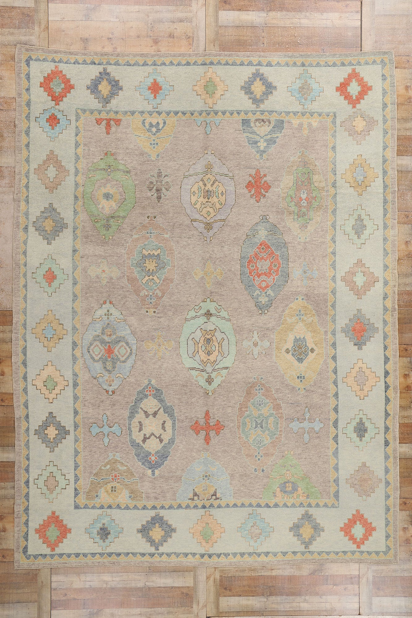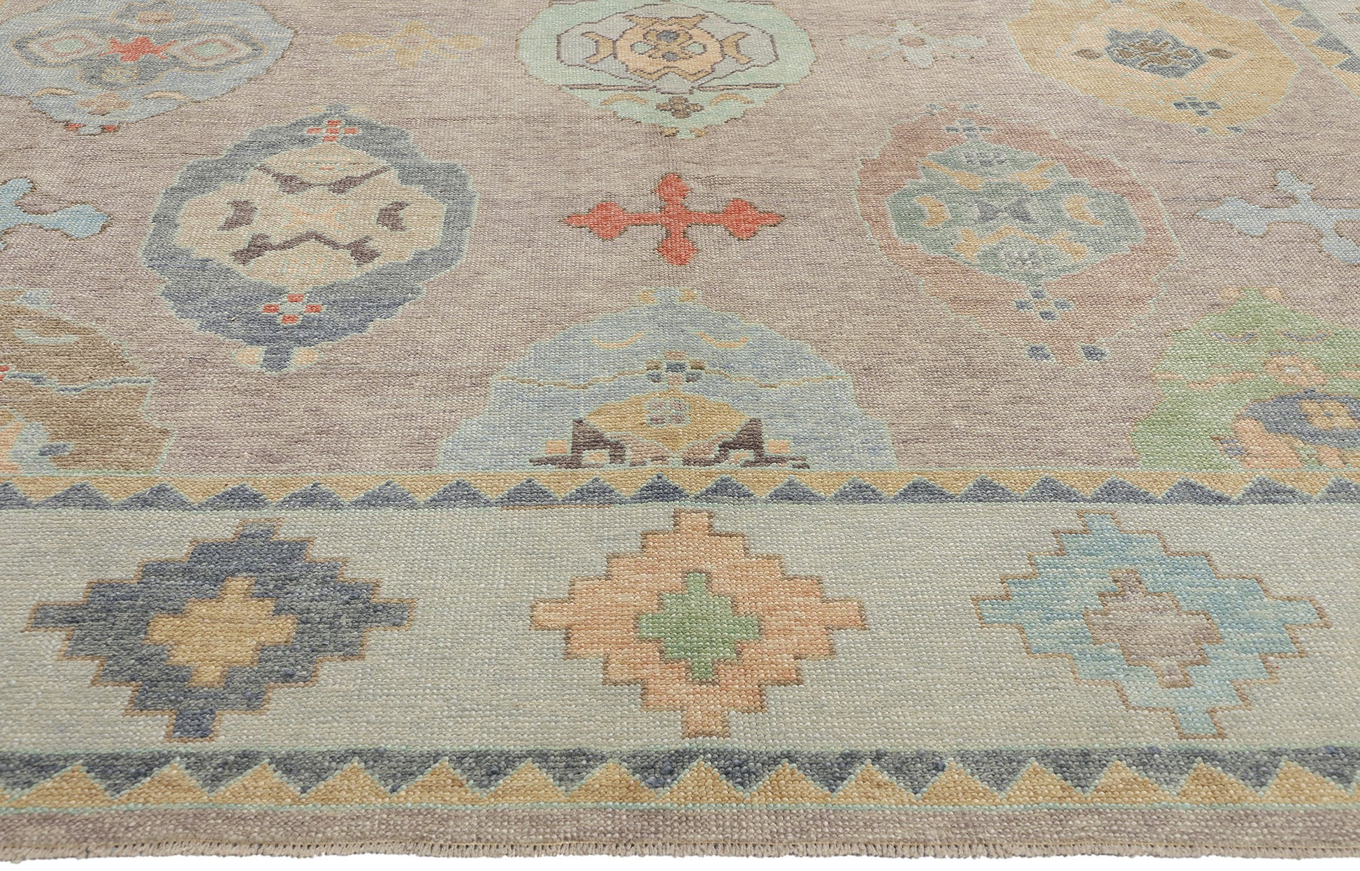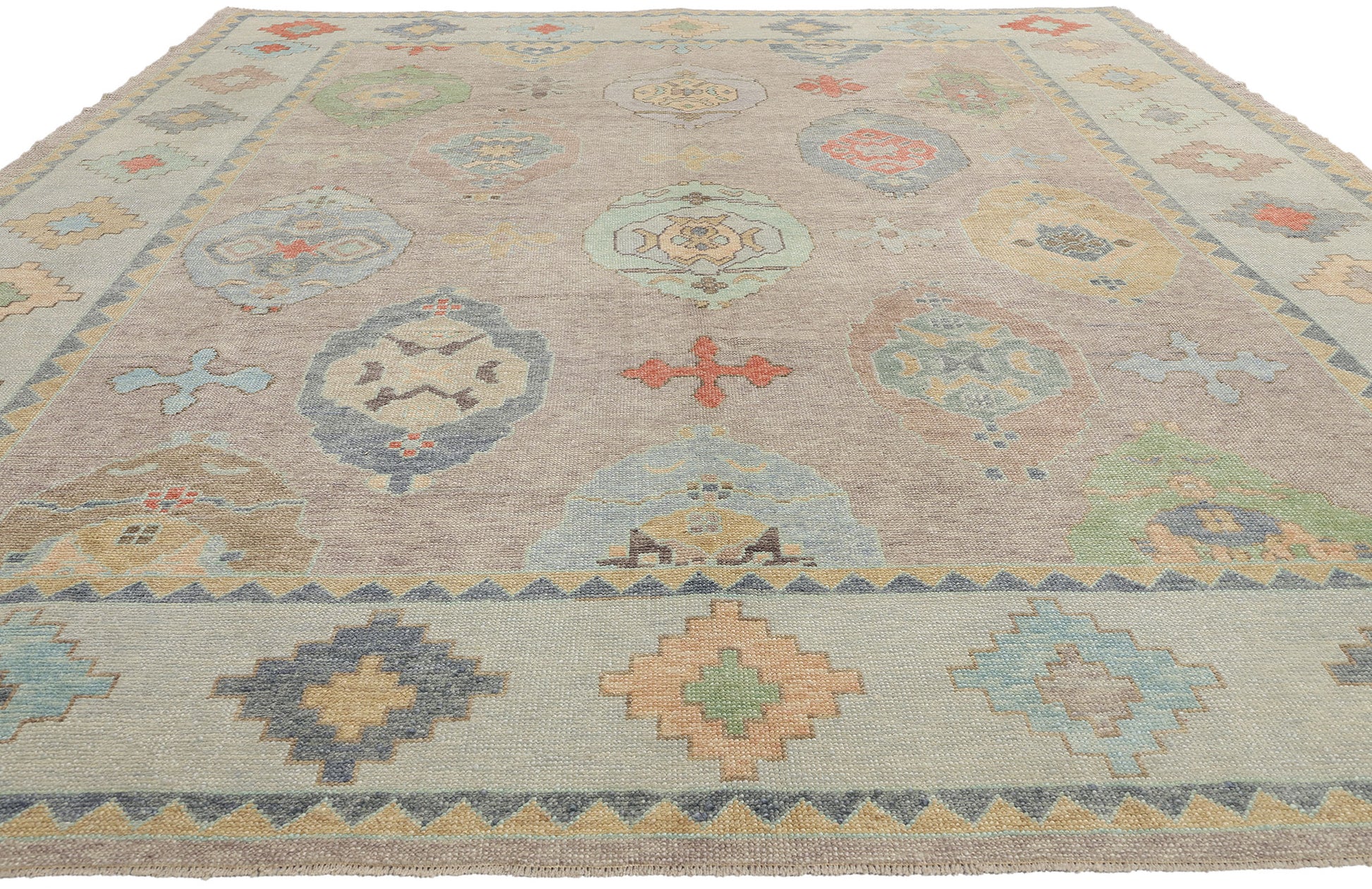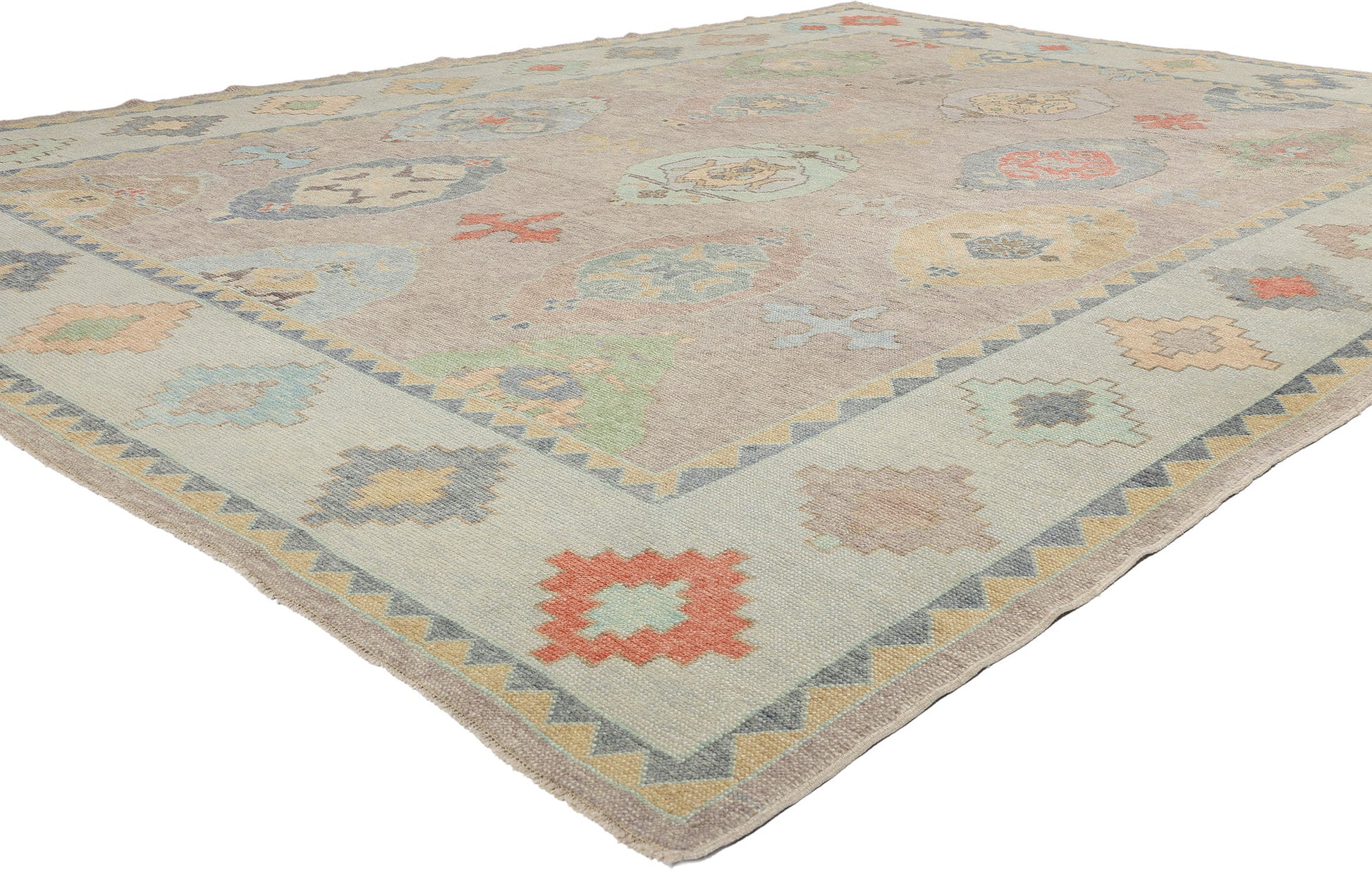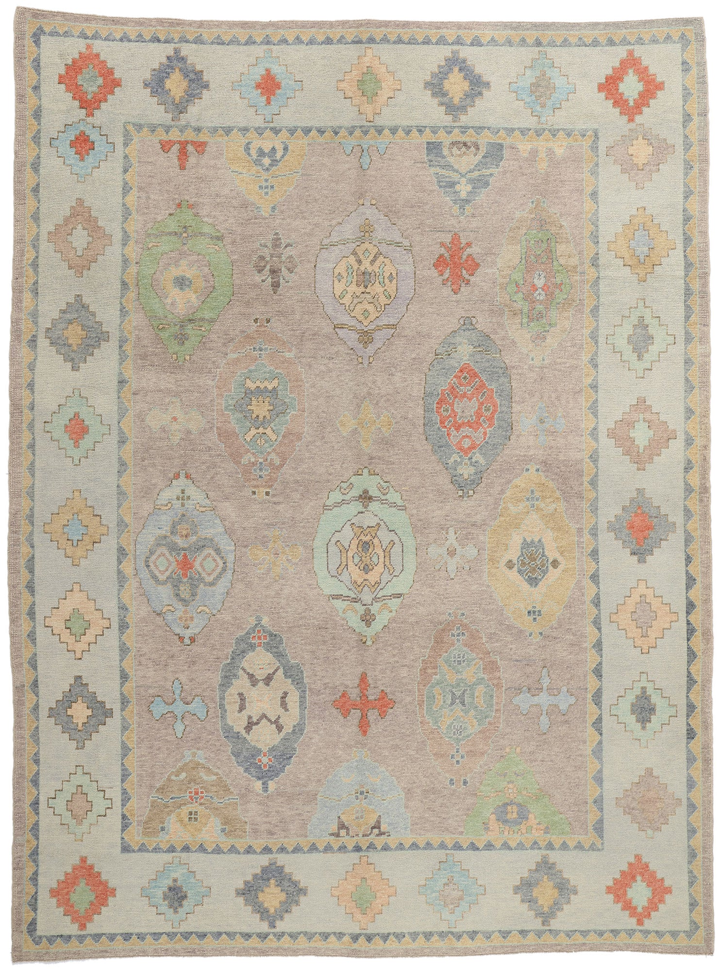 Framing the central field is a beautifully articulated border that amplifies the motifs found within. The border features a rhythmic sequence of stepped diamond medallions, all rendered in the same soft and lively color palette. This geometric border not only serves to enclose the central pattern but also acts as a narrative extension of it, reflecting the interplay between tradition and modernity inherent in Oushak weaving. The zigzag sawtooth inner and outer guard bands lend a hint of movement, adding a sense of continuity to the overall design.