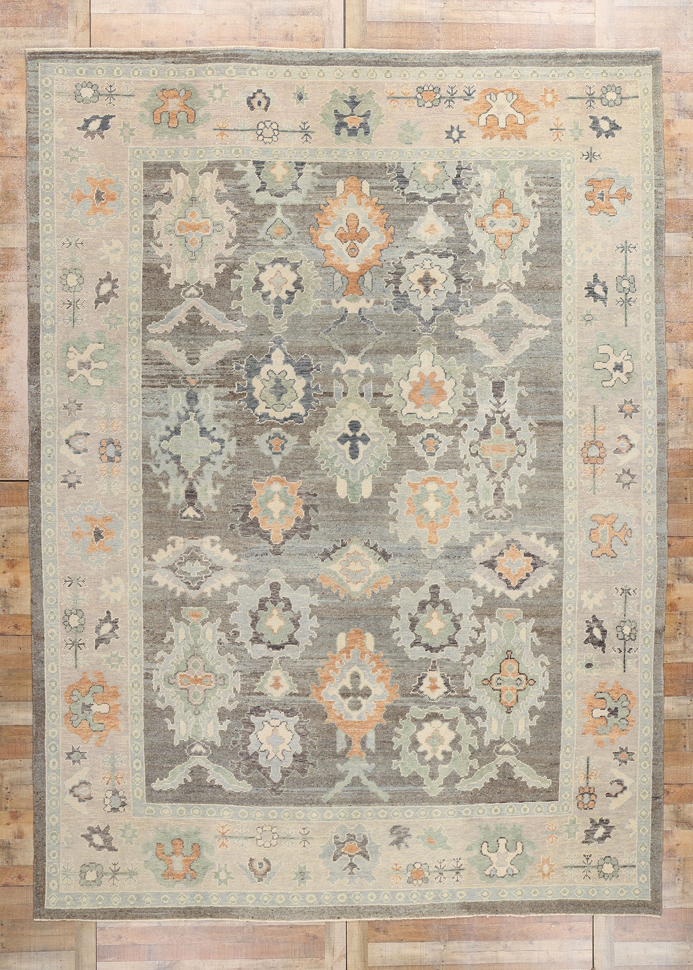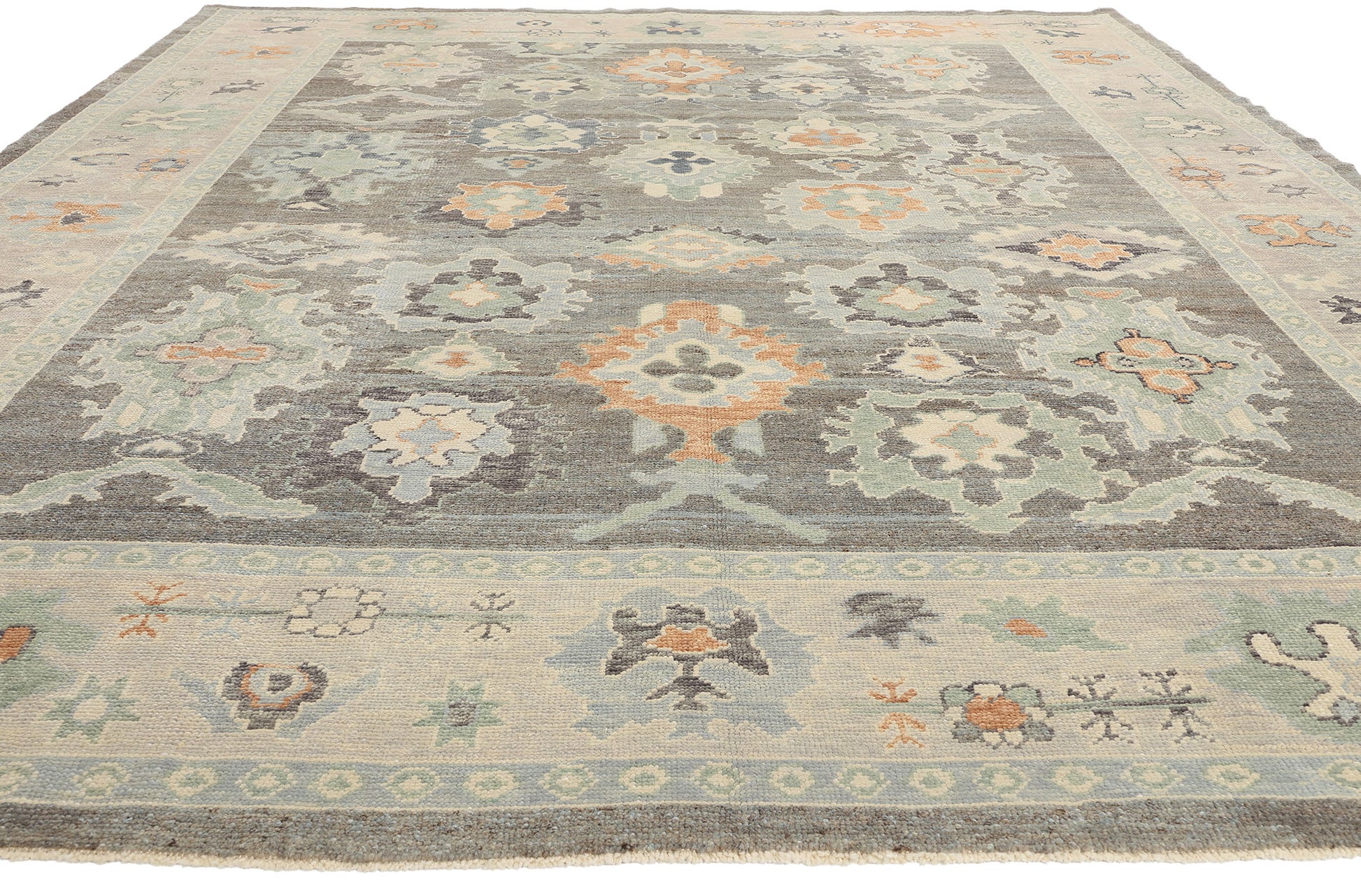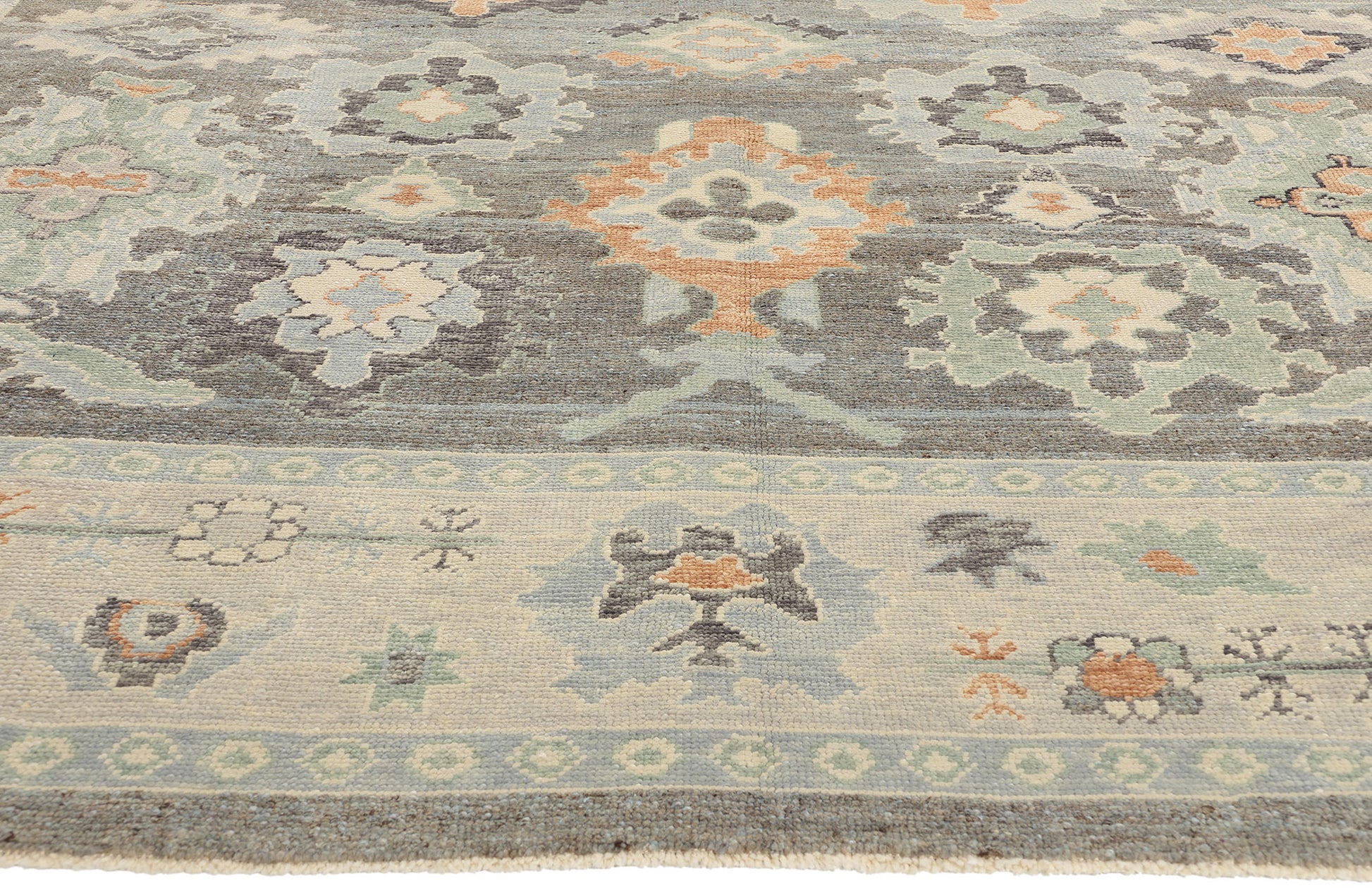 This modern Turkish Oushak rug, with its blend of historical motifs and contemporary color palette, is an exemplary piece for those who appreciate the art of rug making and the beauty of nuanced design. It fits effortlessly into various decor styles, from traditional to more eclectic settings, bringing a touch of historical elegance and a breath of botanical freshness to any living space. Its light and airy feel, combined with its sophisticated design details, make it a timeless piece that enhances the beauty and warmth of home interiors.