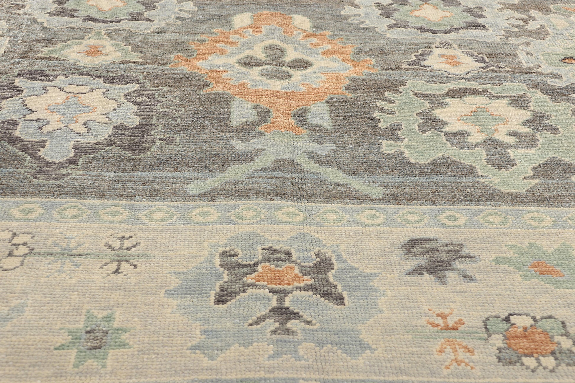 The main decorative border encircling the Oushak rug features a lavender-gray background, offering a gentle contrast to the gray field. This border is intricately detailed with palmettes and is flanked by an inner and outer light sky blue geometric guard border. These borders not only frame the central pattern but also enhance the overall aesthetic, providing a structured yet elegant edge to the fluid designs within.