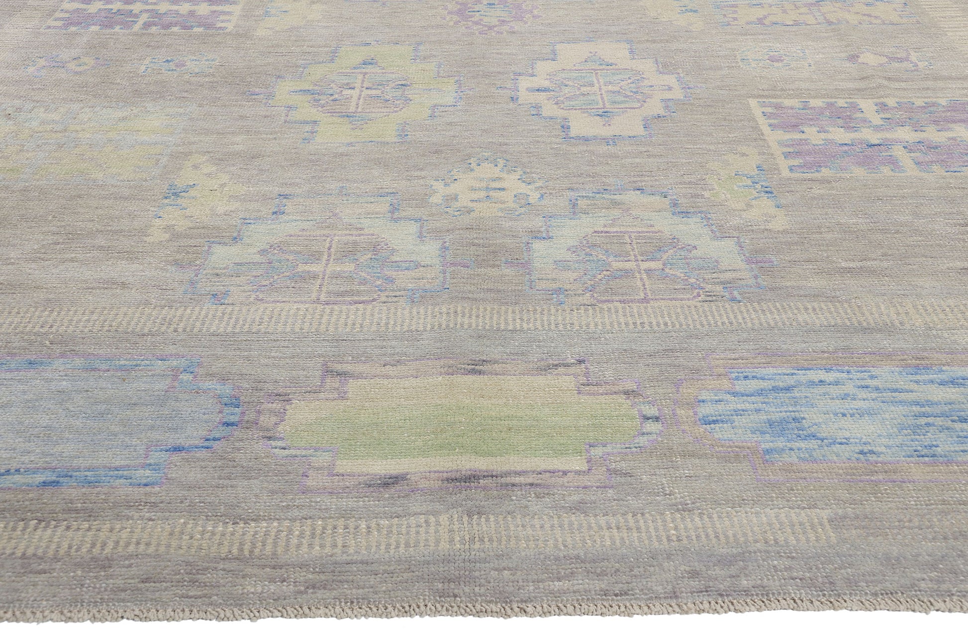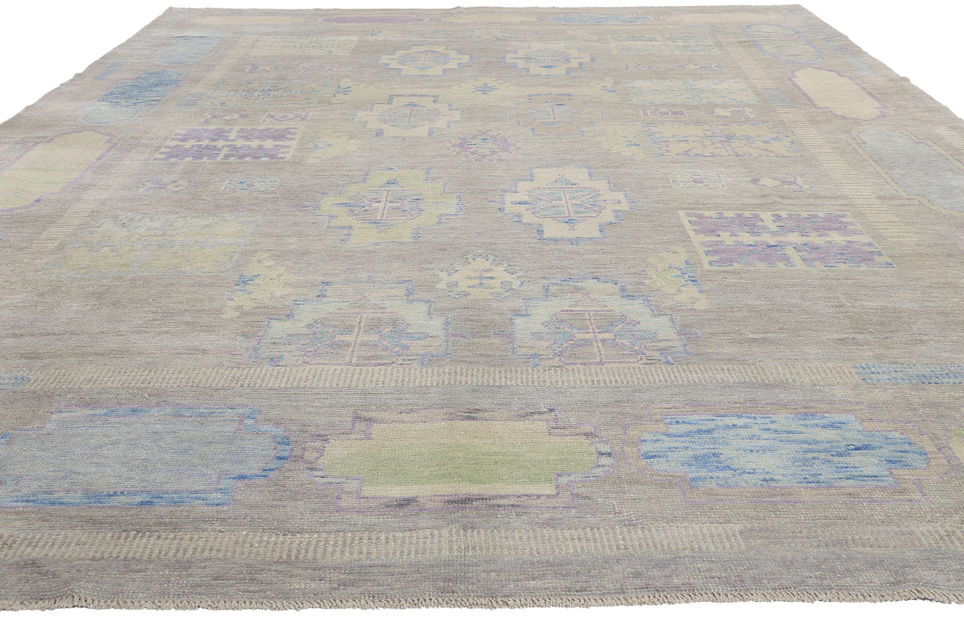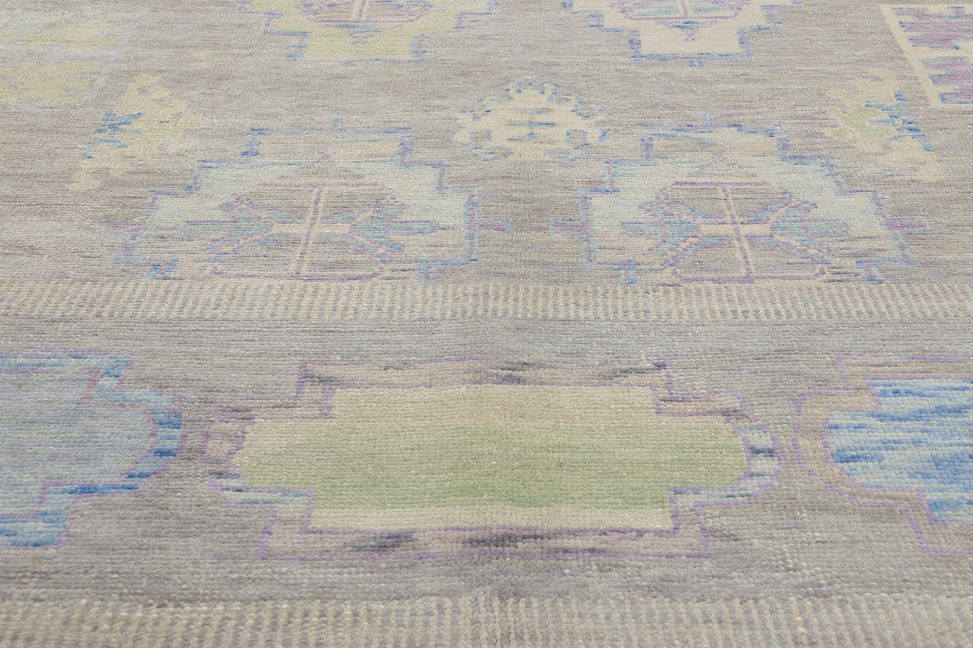 This hand-knotted wool modern Turkish Oushak rug captures the essence of contemporary elegance while drawing inspiration from the tribal and boho chic aesthetic. The soft, lavender gray field serves as a serene canvas for the intricate arrangement of geometric and tribal motifs rendered in pastel shades of lavender, sky blue, light green, and champagne. These delicate colors and striking patterns create a sophisticated interplay of form and hue, bringing a sense of lightness and intrigue to nearly any space.