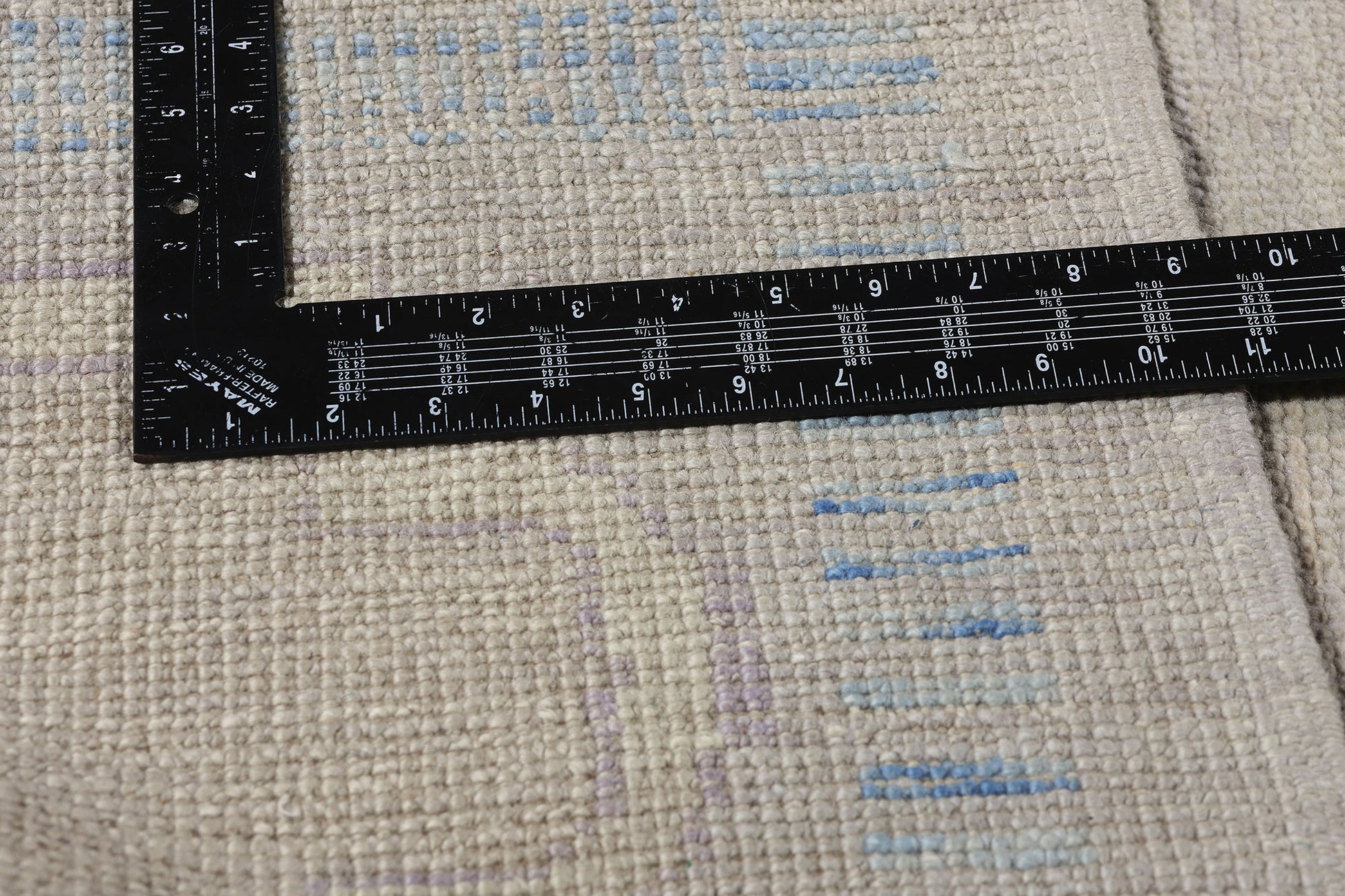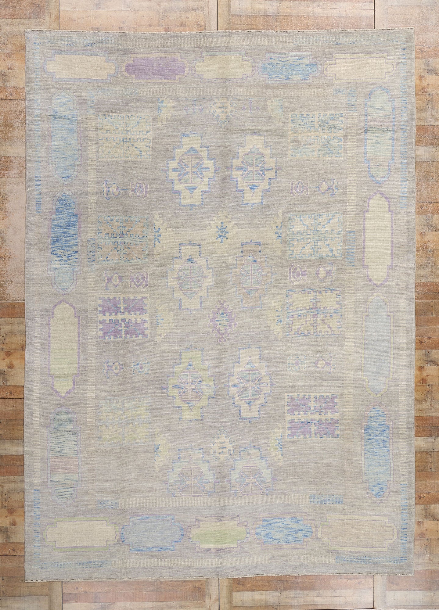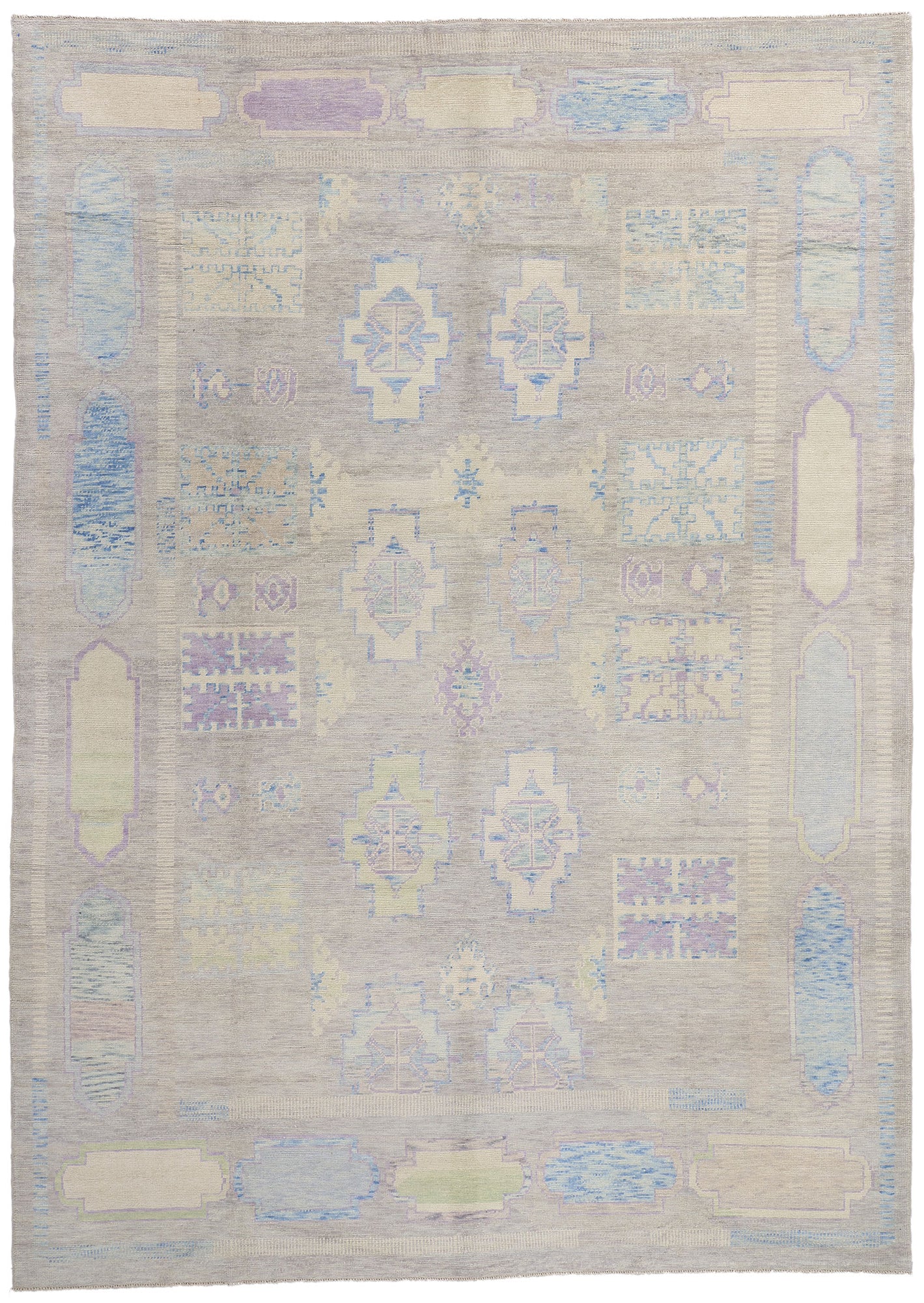 This hand-knotted wool modern Turkish Oushak rug captures the essence of contemporary elegance while drawing inspiration from the tribal and boho chic aesthetic. The soft, lavender gray field serves as a serene canvas for the intricate arrangement of geometric and tribal motifs rendered in pastel shades of lavender, sky blue, light green, and champagne. These delicate colors and striking patterns create a sophisticated interplay of form and hue, bringing a sense of lightness and intrigue to nearly any space.