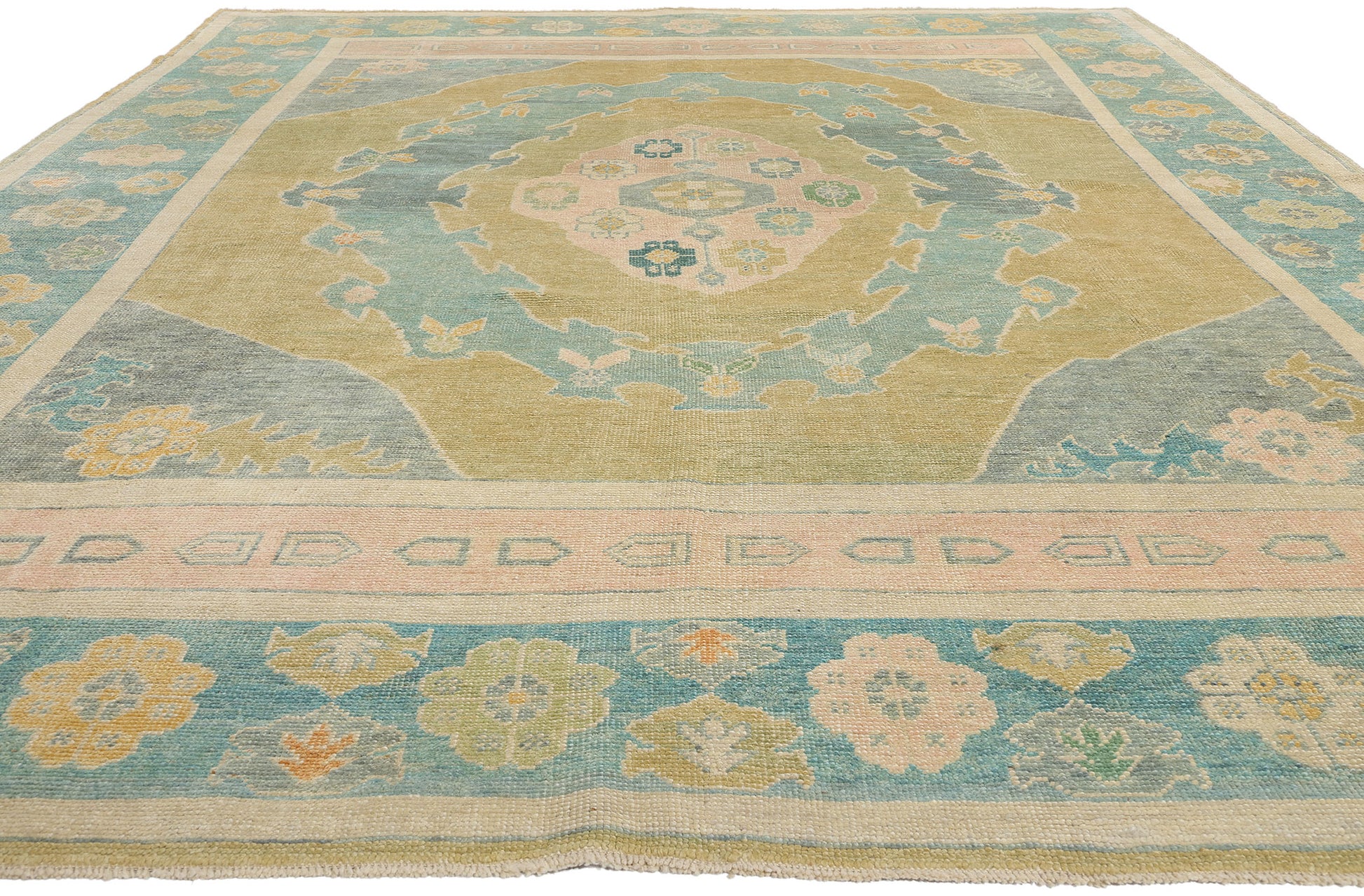 This hand-knotted wool modern Turkish Oushak rug is a stunning representation of timeless elegance and skilled craftsmanship, featuring a captivating medallion pattern at its heart. The central medallion, a softly hued oval motif, floats effortlessly against a field of cerulean blue and golden green, evoking a sense of serenity and regal charm. Its intricate floral embellishments, delicately woven in shades of pastel pink, peach, and blue, recall the classical motifs of traditional Turkish artistry while imbuing the Oushak rug with a contemporary flair.