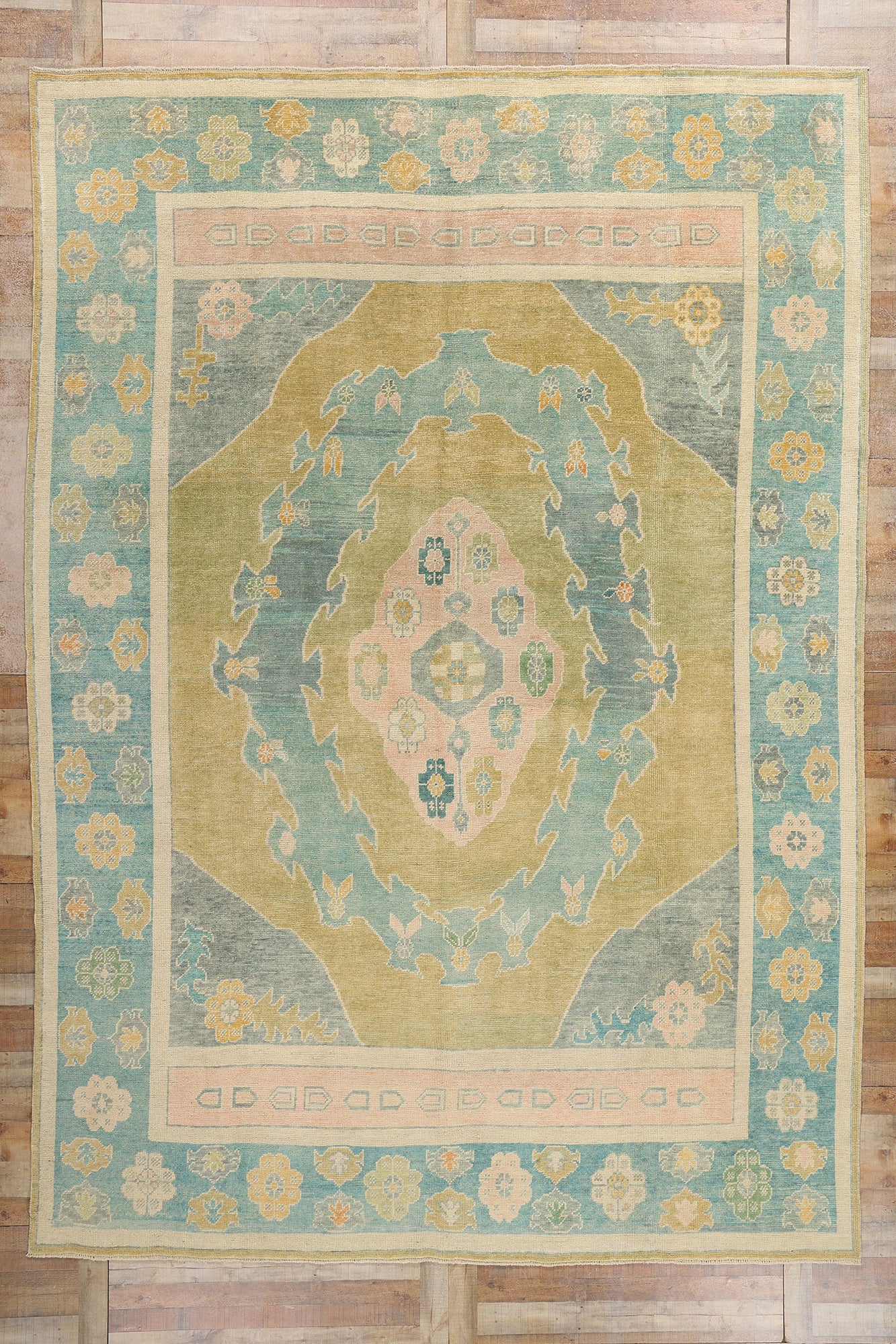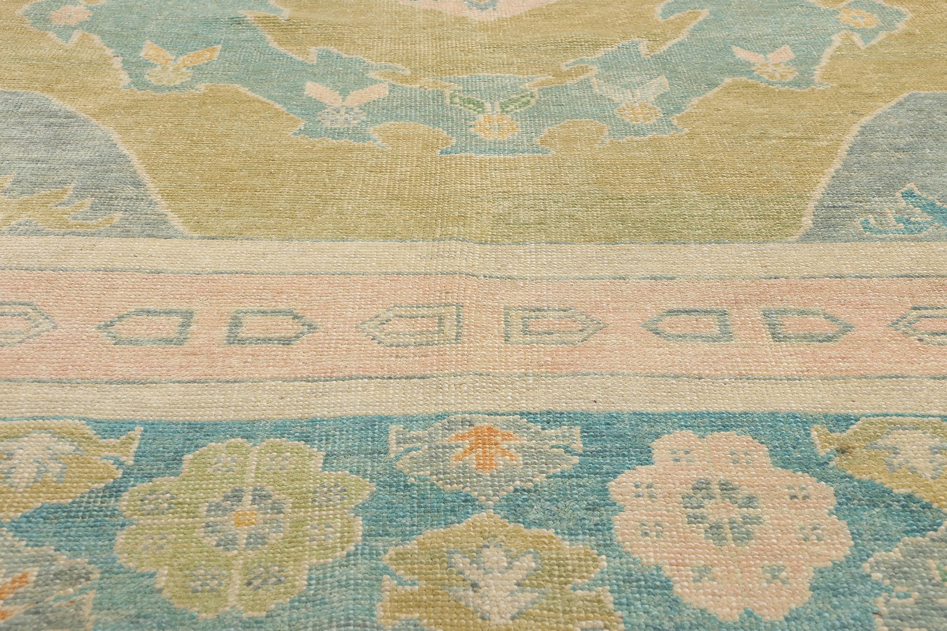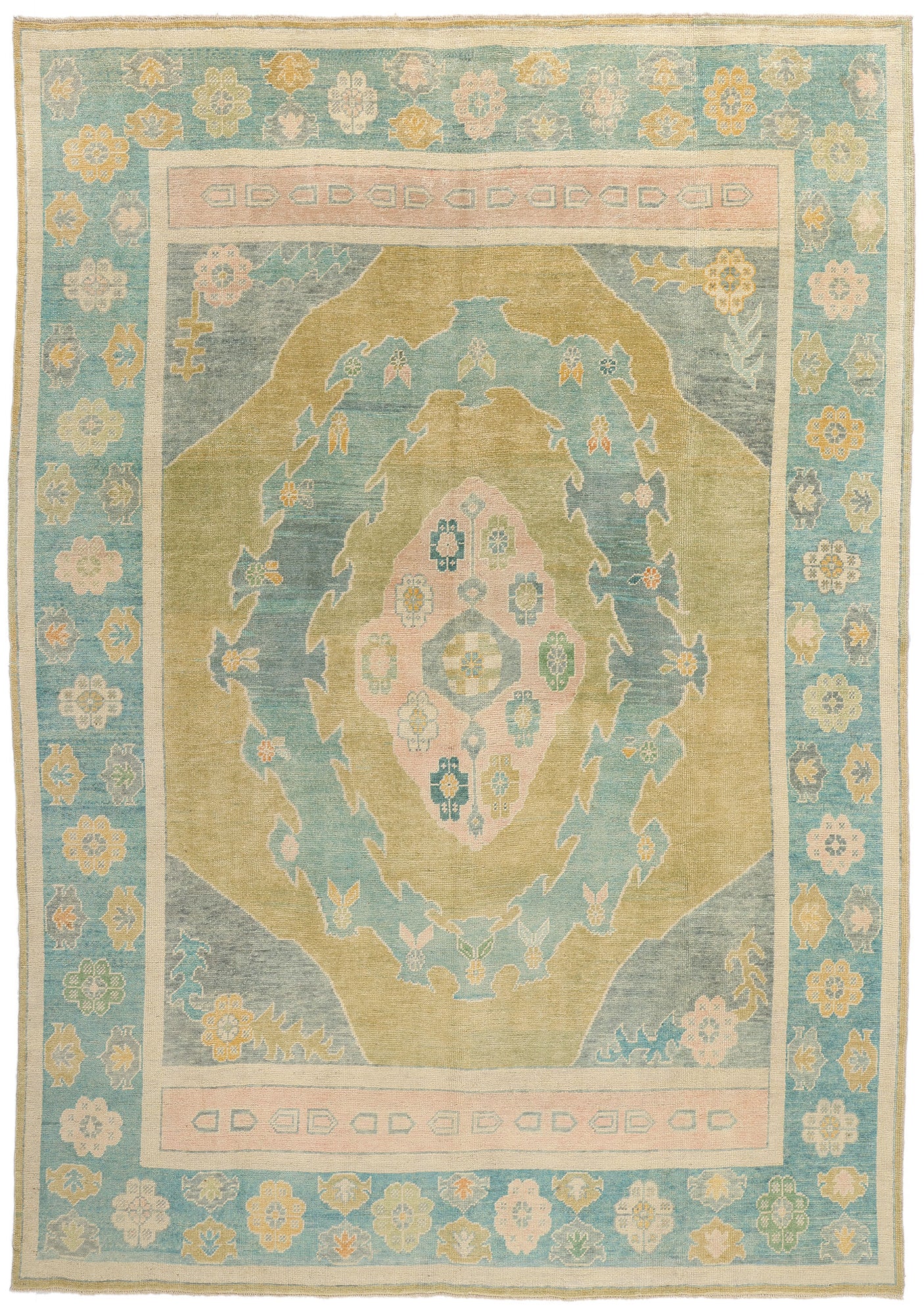 Enclosing the enchanting composition is a meticulously woven border that enhances the overall design with its own rich narrative. Floral rosettes and geometric elements are arranged in a continuous sequence, providing a frame that grounds the design and accentuates the central medallion’s prominence. The subtle interplay of colors in the border mirrors the hues of the main field, creating a cohesive and balanced appearance. Small blossoms and delicate tendrils weave throughout, reflecting the artistry and precision characteristic of Oushak weaving traditions.