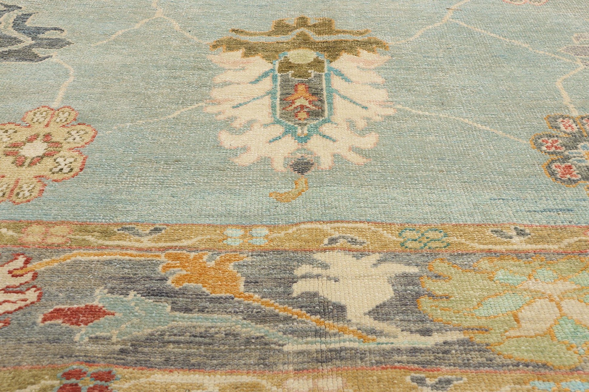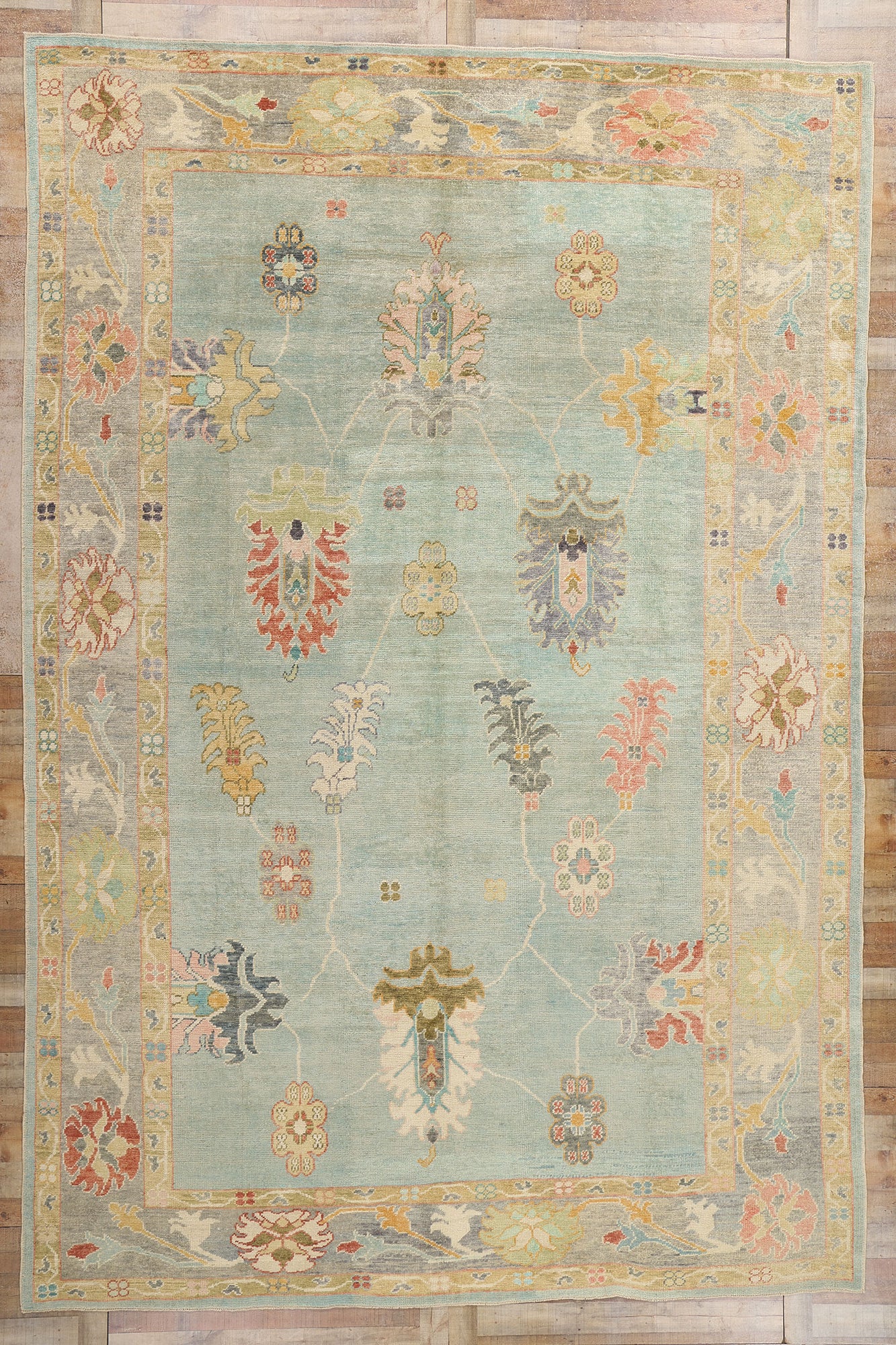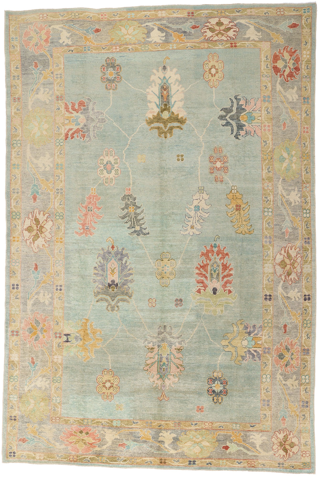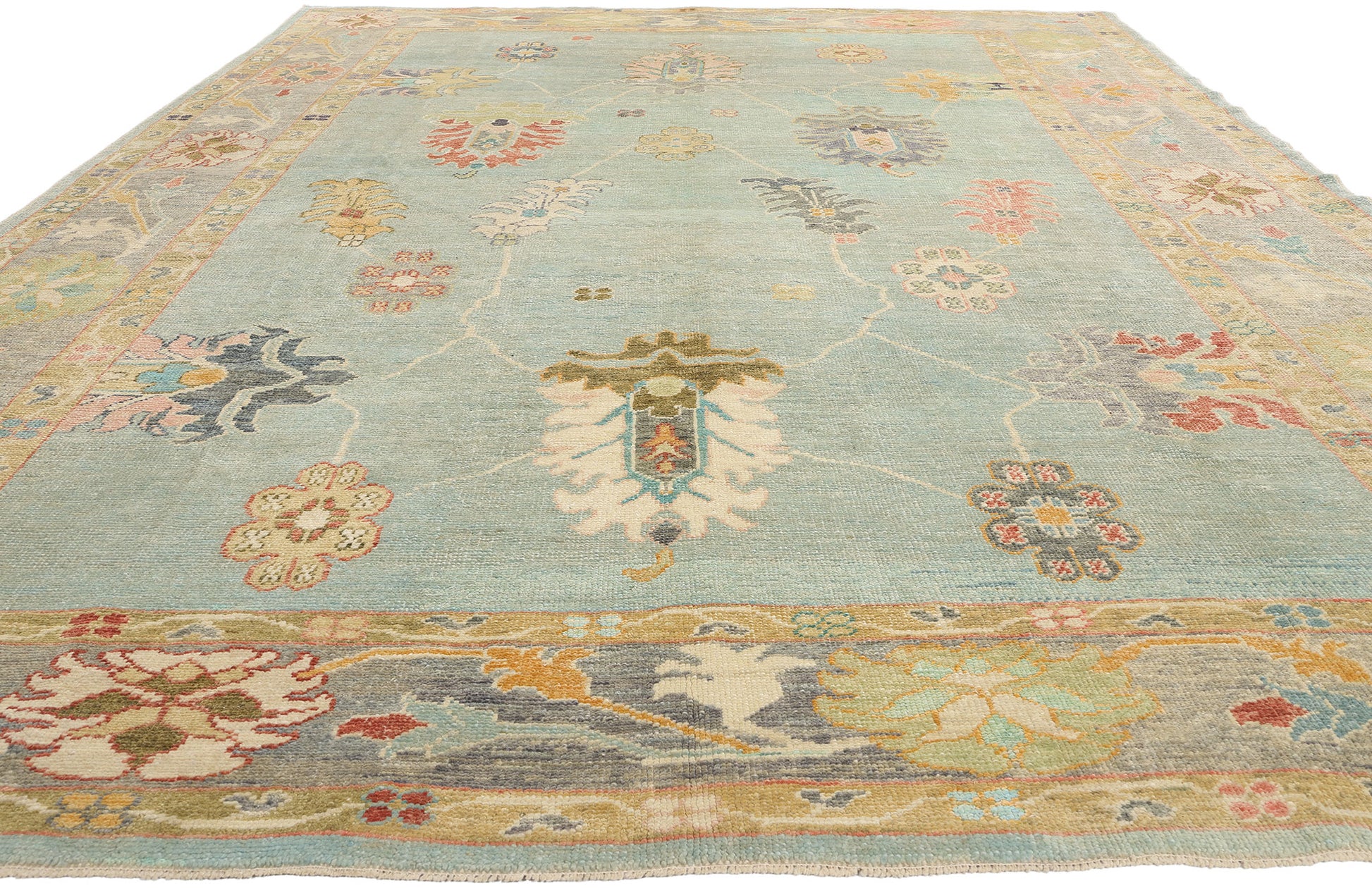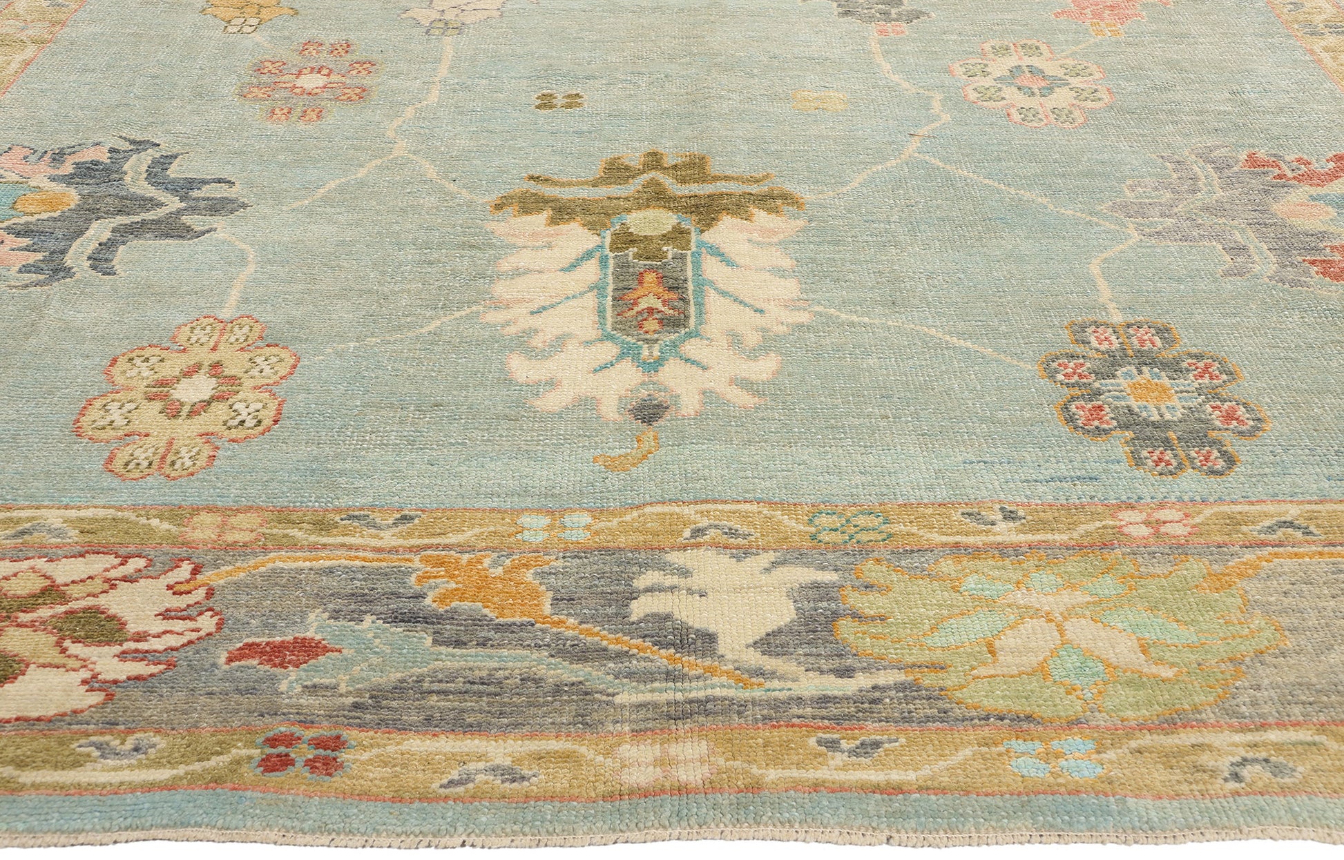 The large lotus motifs anchor the composition, symbolizing purity, renewal, and the enduring beauty of nature. The surrounding lilies, rosettes, and blossoms are thoughtfully arranged to create a harmonious balance of size, shape, and color. The subtle yet rich palette—featuring shades of beige, celadon greens, pale teal blues, and warm pinks—enhances the Oushak rug’s ethereal beauty without overpowering its delicate intricacy. This interplay of hues and forms reflects the artisan’s dedication to preserving the essence of traditional Turkish artistry while infusing it with a fresh, modern sensibility.