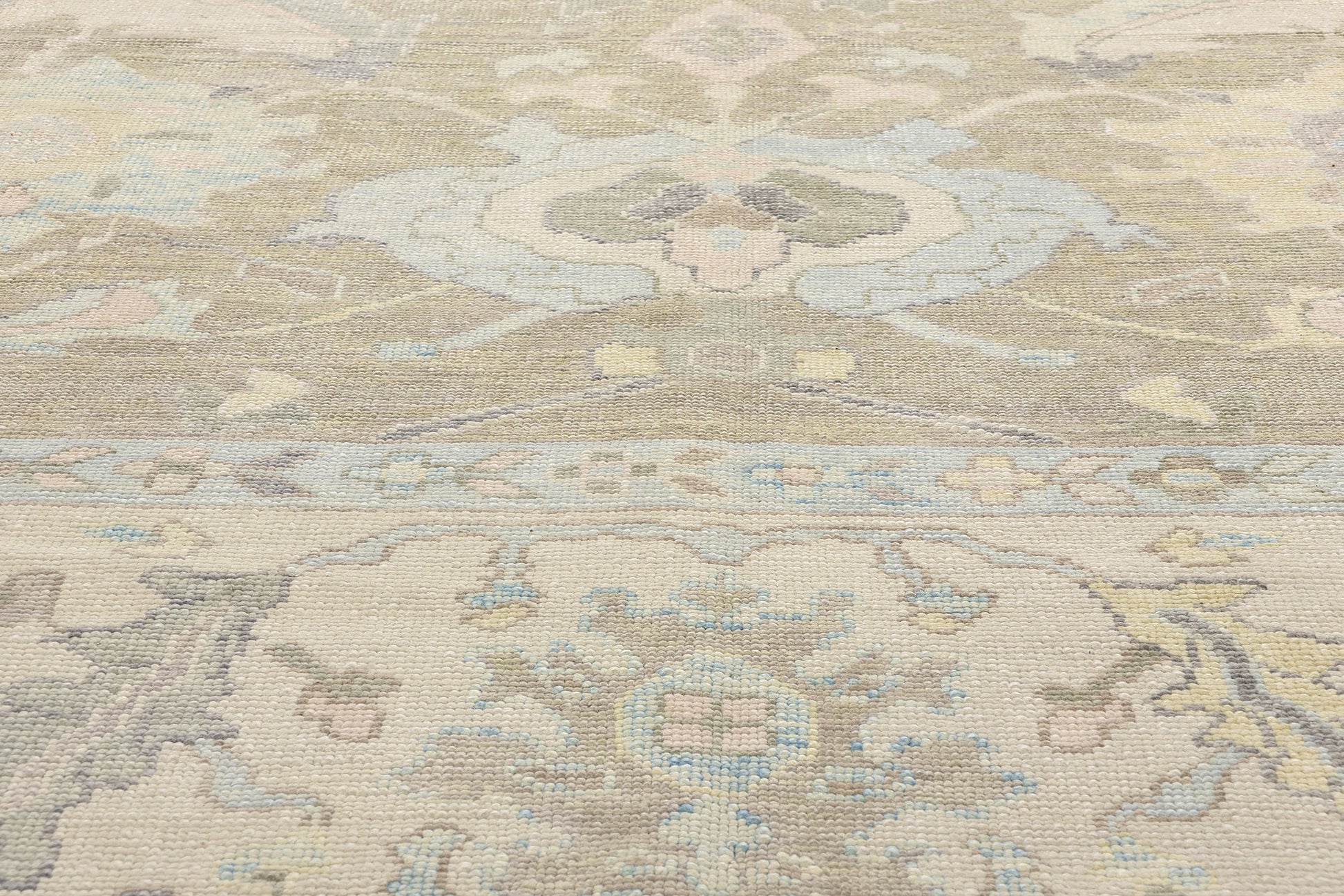 Perfect for transitional and modern interiors, this Turkish Oushak rug effortlessly bridges the gap between traditional craftsmanship and contemporary design. Its neutral tones and Biophilic motifs make it a versatile choice for living rooms, dining areas, or bedrooms, adding warmth and character to nearly any space. With its timeless elegance and meticulous attention to detail, this woven wonder is more than just a decorative element—it is a celebration of artistry, culture, and the enduring beauty of handwoven textiles.