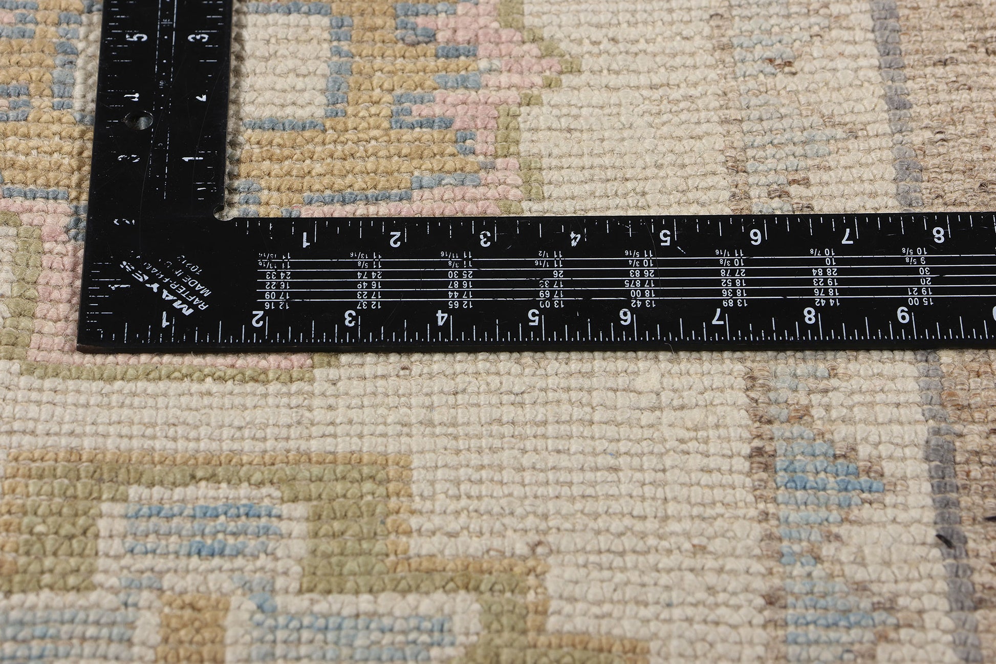 The rug is framed with a sophisticated border of cross motifs, symbolizing balance and protection, flanked by an inner and outer sawtooth guard band. These intricate details provide a subtle yet impactful frame, enhancing the composition's structure while echoing the organic patterns within the central field. The sawtooth guard bands, a nod to traditional Turkish rug design, offer a touch of heritage that complements the Oushak rug’s modern aesthetic.