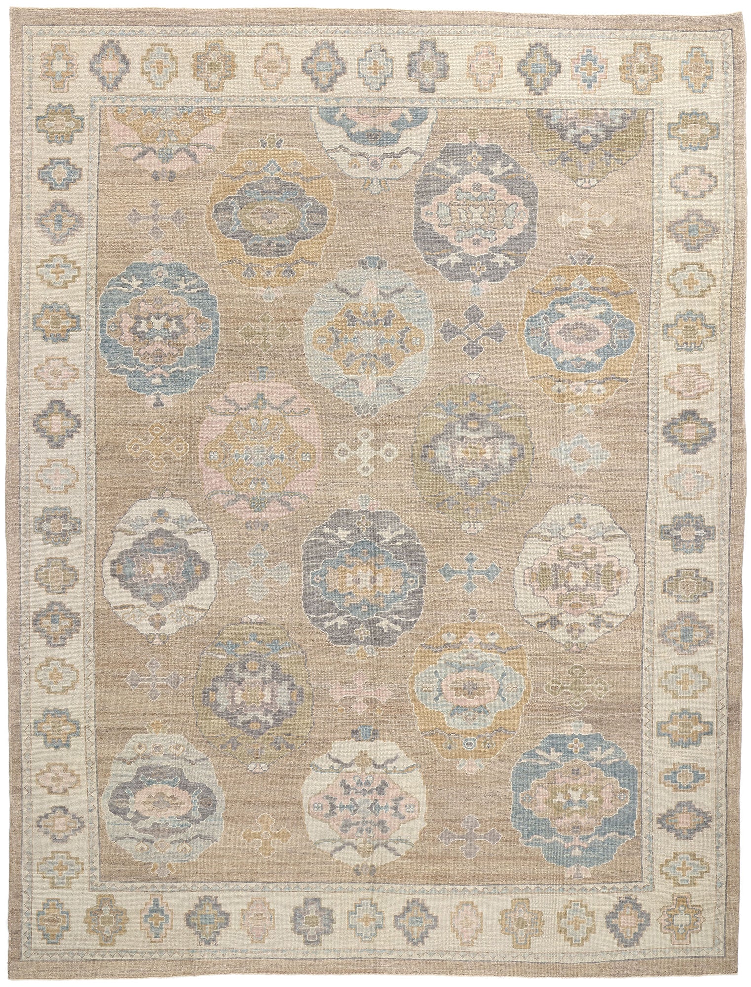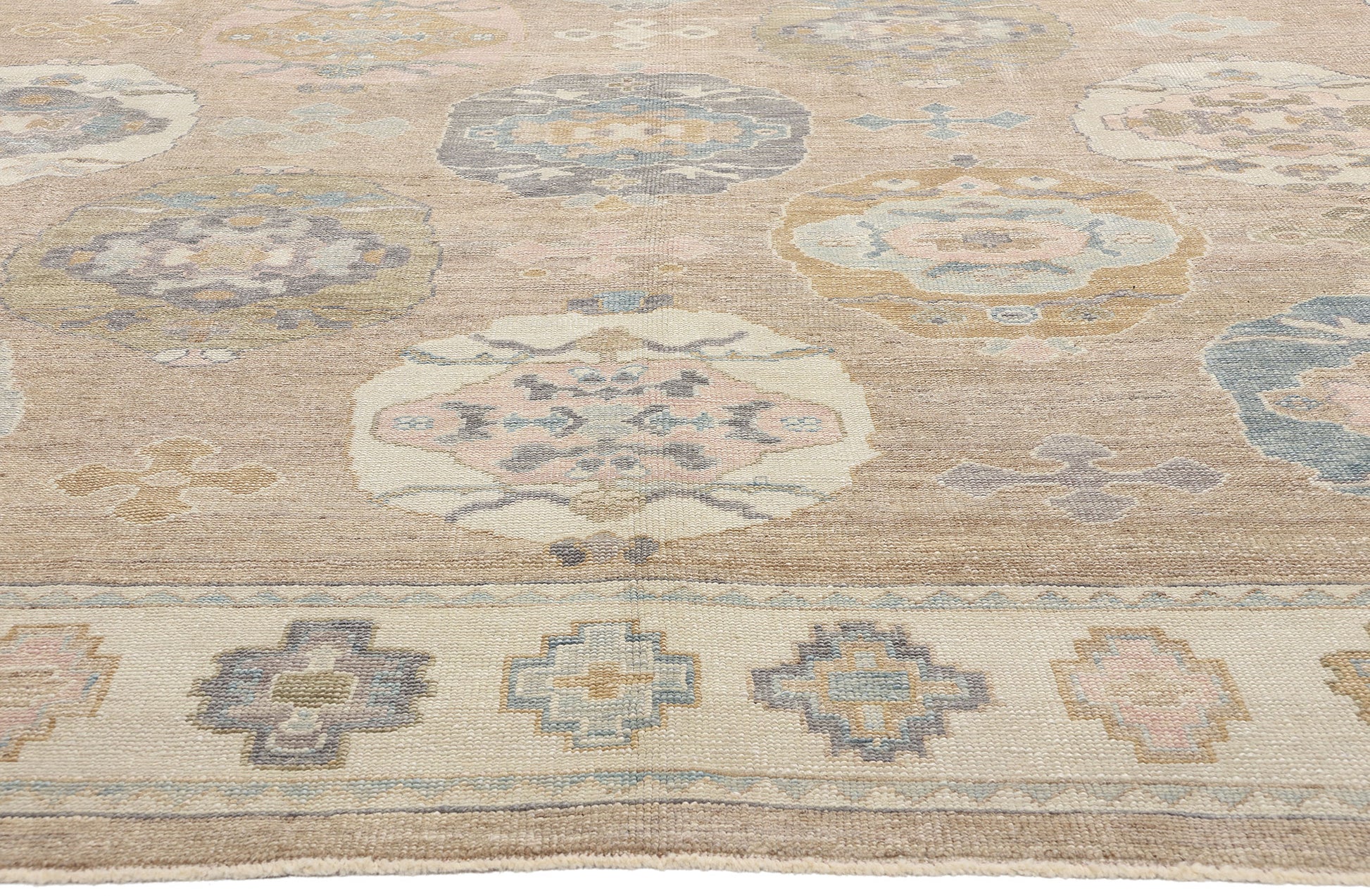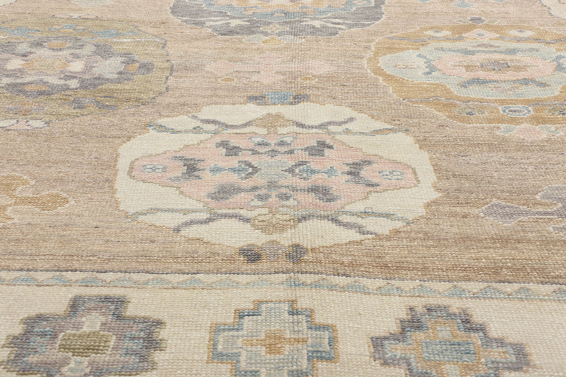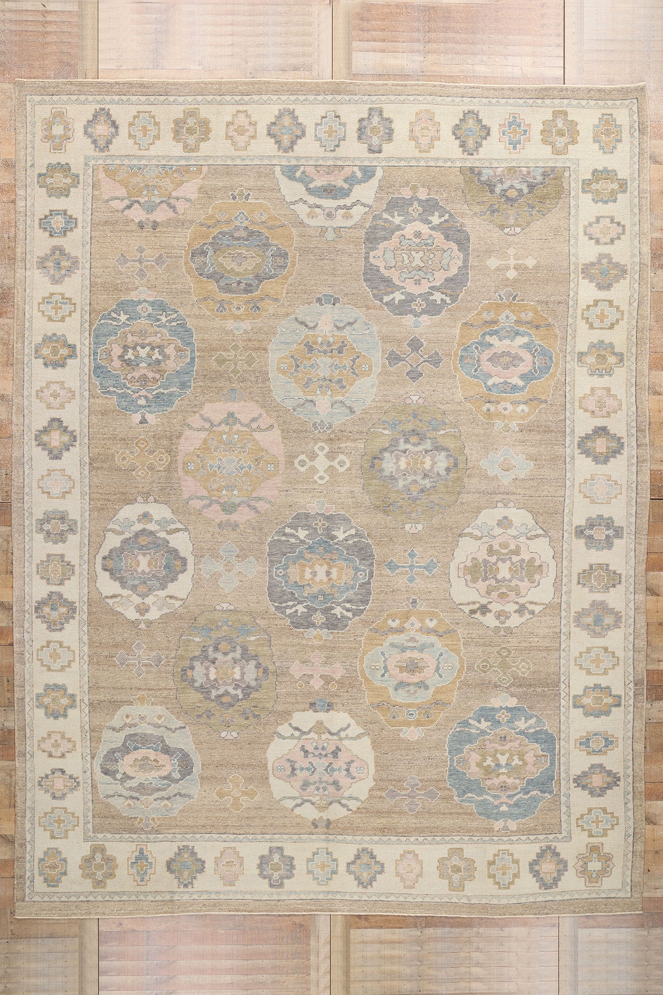 The soft earth-tone colors of this modern Oushak rug, ranging from soft beige and tranquil taupe to light blues and pastel pinks, further enhance its serene quality. The harmonious palette draws from the Shibui design philosophy, emphasizing simplicity and understated beauty. Each medallion and motif is meticulously crafted, showcasing the artistry and skill of Anatolian weavers, while the gentle color transitions add depth and texture to the overall design.