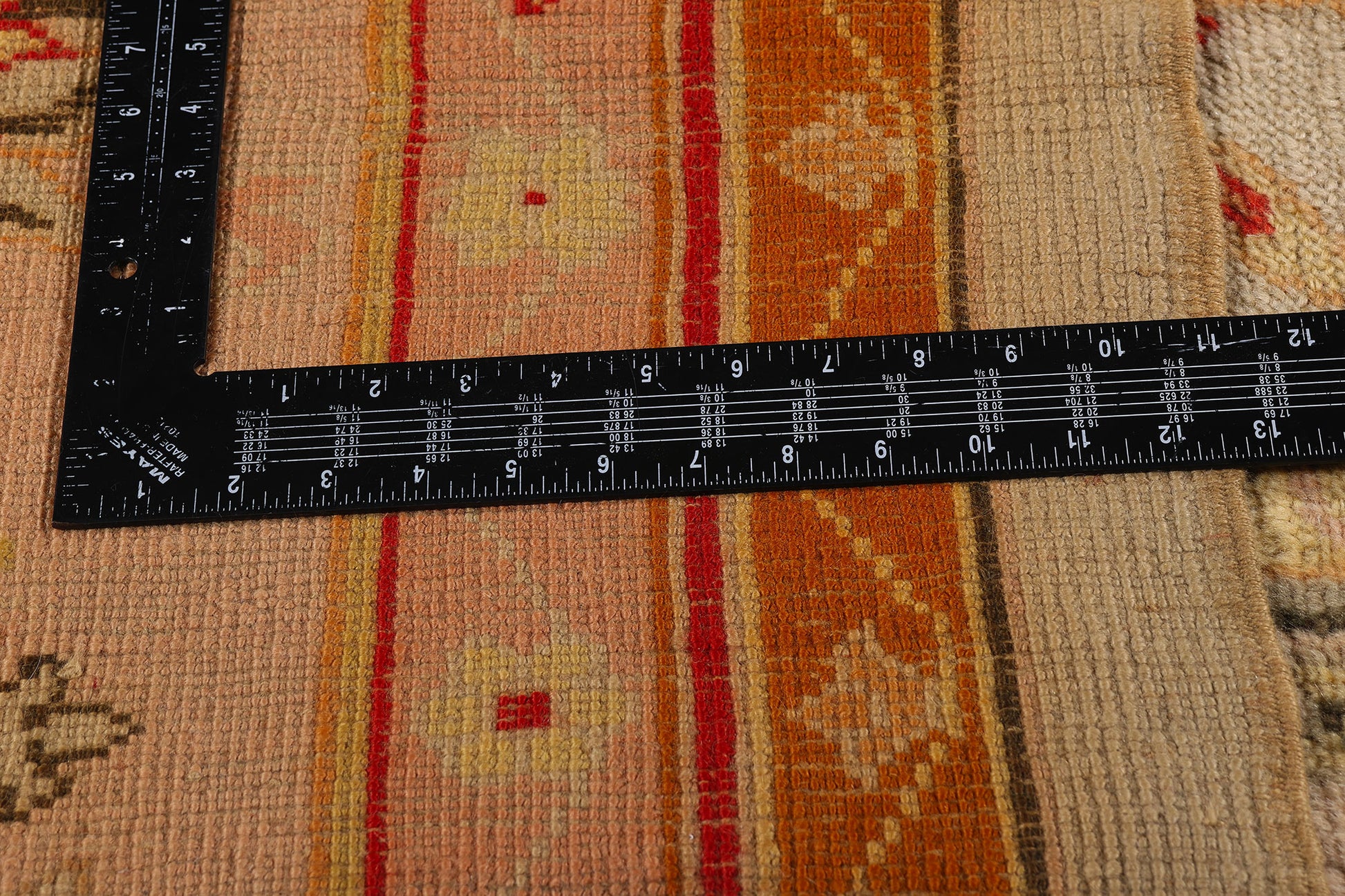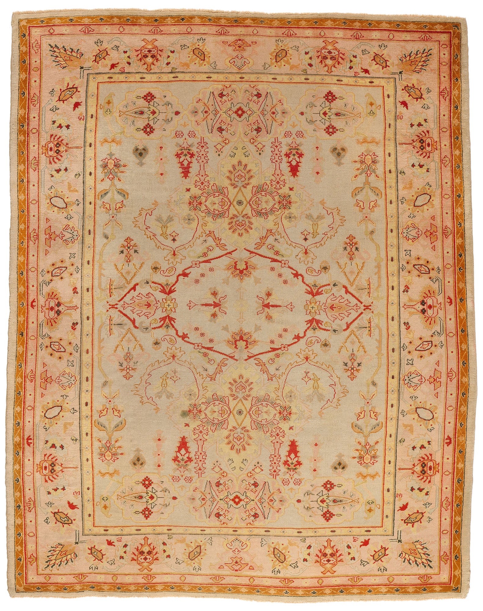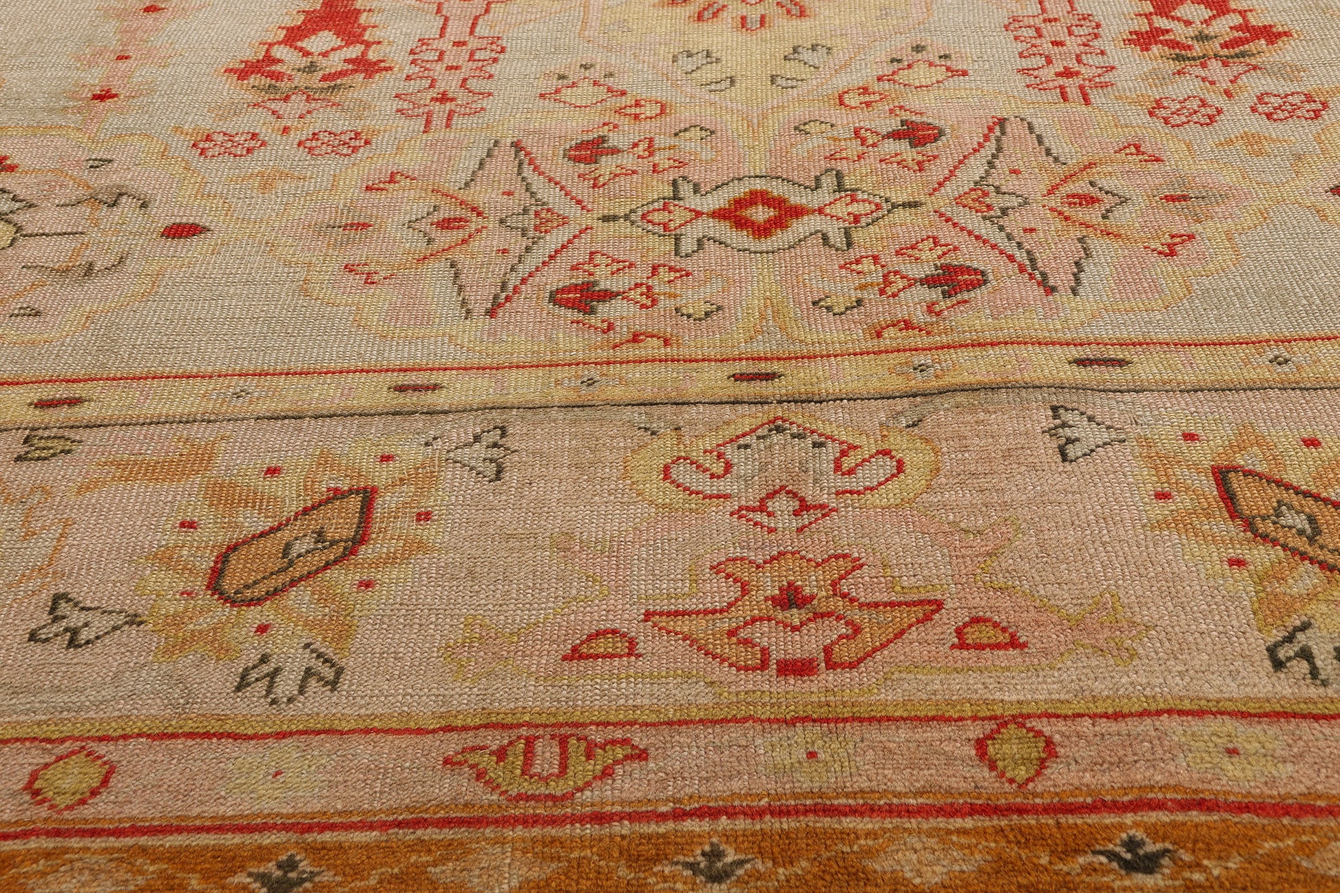 In its palette of muted saffron, cochineal red, sand, apricot, and gentle pinks with pops of faded black, this Late 19th Century Oushak rug captures the ephemeral beauty of an Anatolian sunset dissolving into stone and dust. It is a work that transcends ornamentation, functioning instead as a living chronicle—each knot a syllable, each bloom a stanza. From its lively field to its lyrical border, this Turkish masterpiece is not merely a textile, but a landscape of memory, grace, and ancestral rhythm preserved in wool.