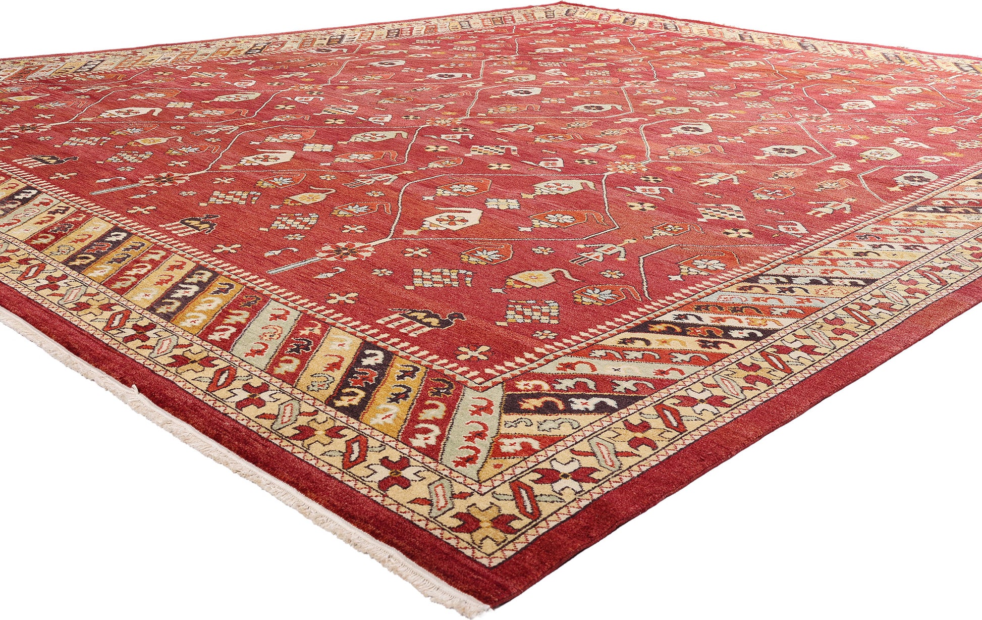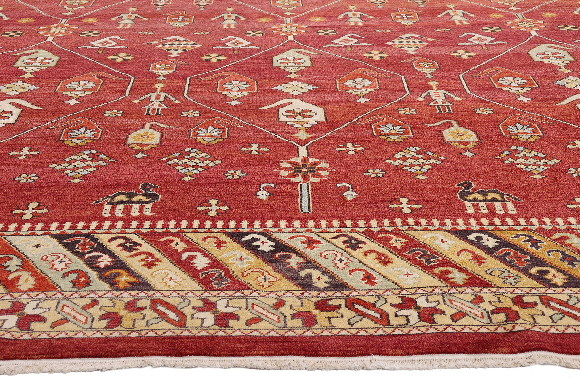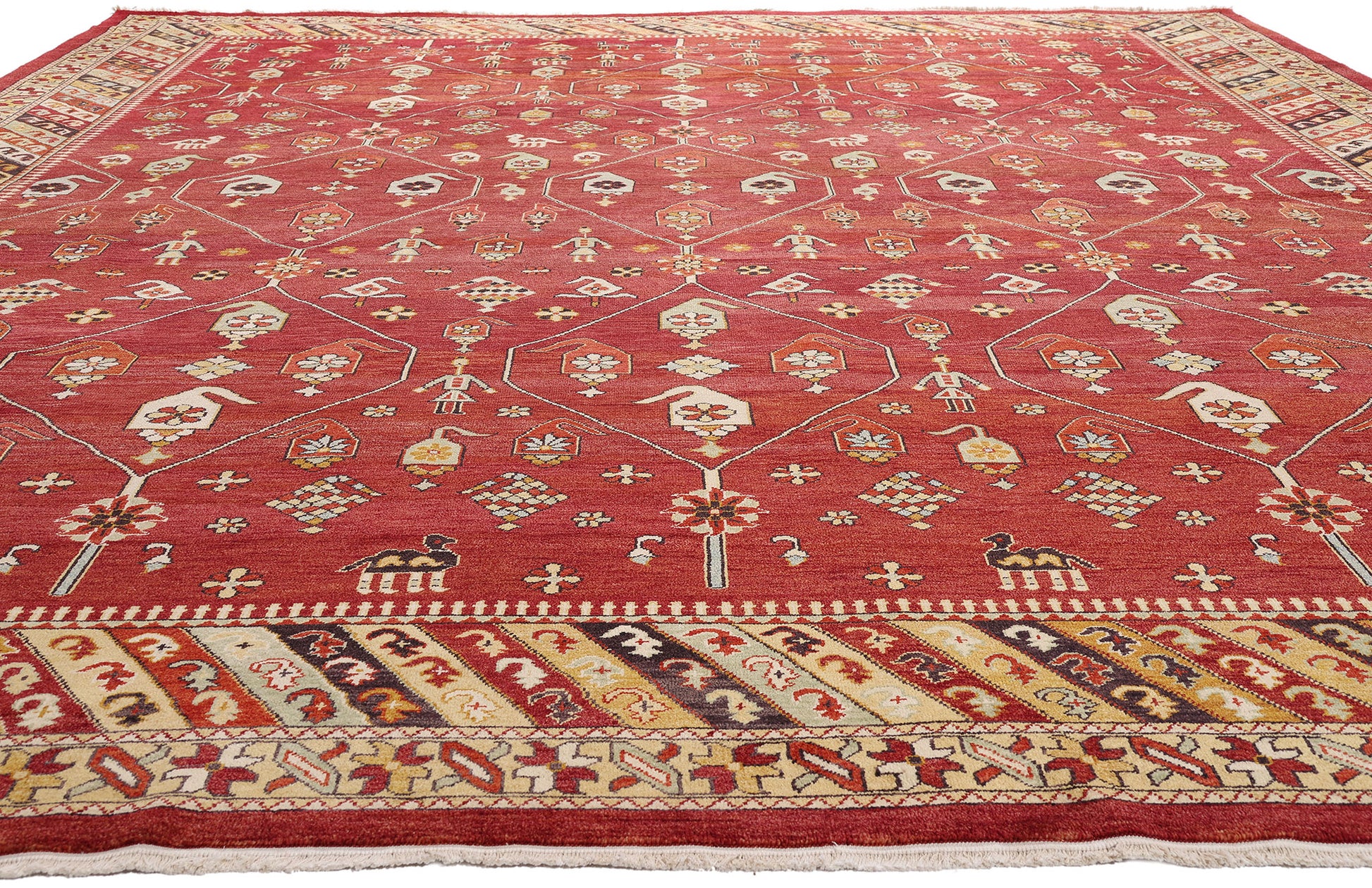 Radiating with a palette as curated as a haute couture collection, this hand-knotted wool antique Turkish Oushak rug exudes a rarefied charm that feels both timeless and evocative. The red field—deep and resonant like lacquered leather—acts as a bold stage for a lyrical choreography of symbols. Fine ivory lines sweep across the composition in a poised lattice framework, their intersections adorned with rosettes that glisten like bespoke jewelry accents. Within this refined geometry unfolds an eclectic procession of motifs: boteh forms shimmer like ancestral emblems, while dogs, camels, and human figures lend a folkloric grandeur that elevates the rug into a narrative tapestry of mystique and meaning.