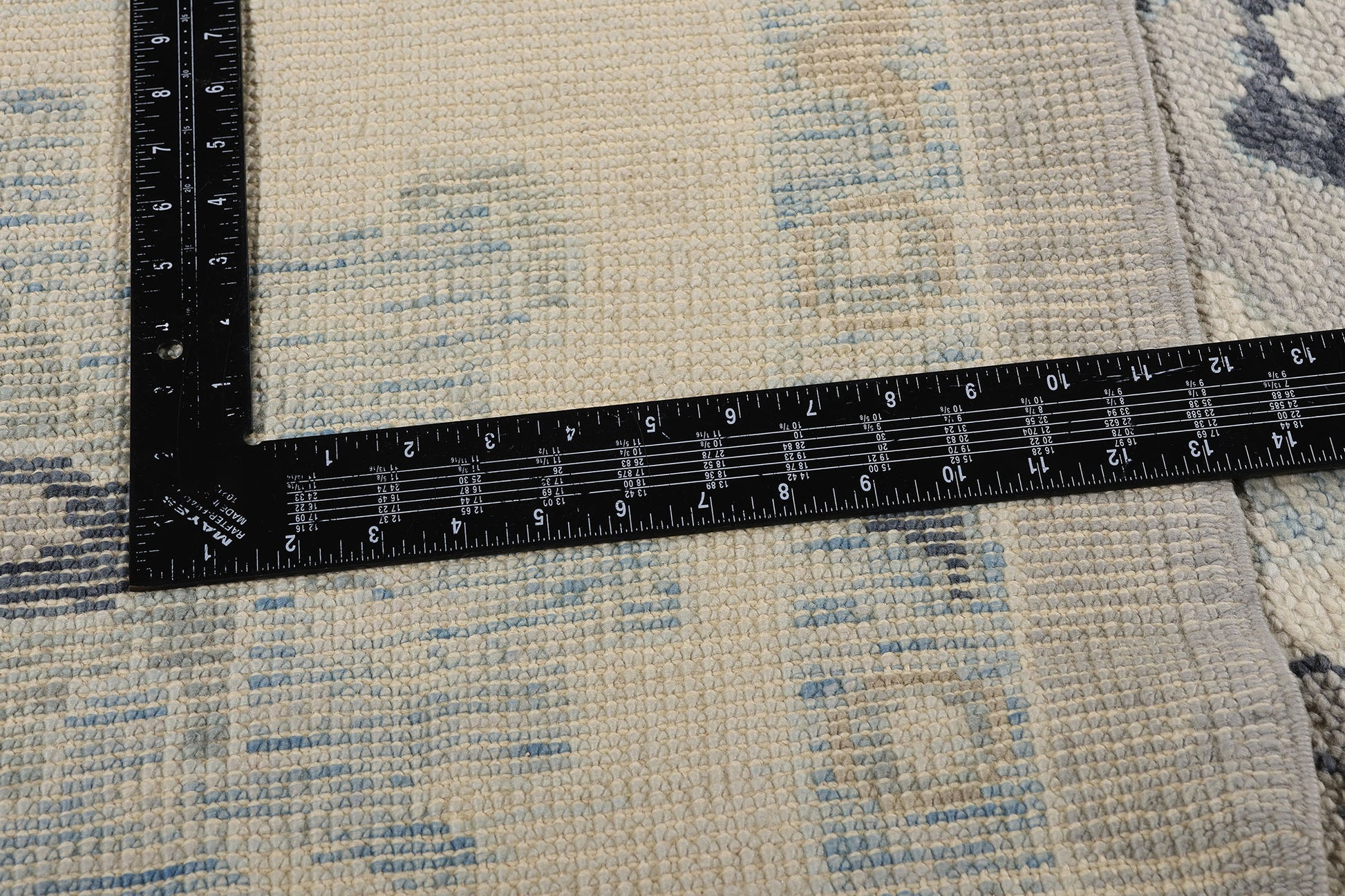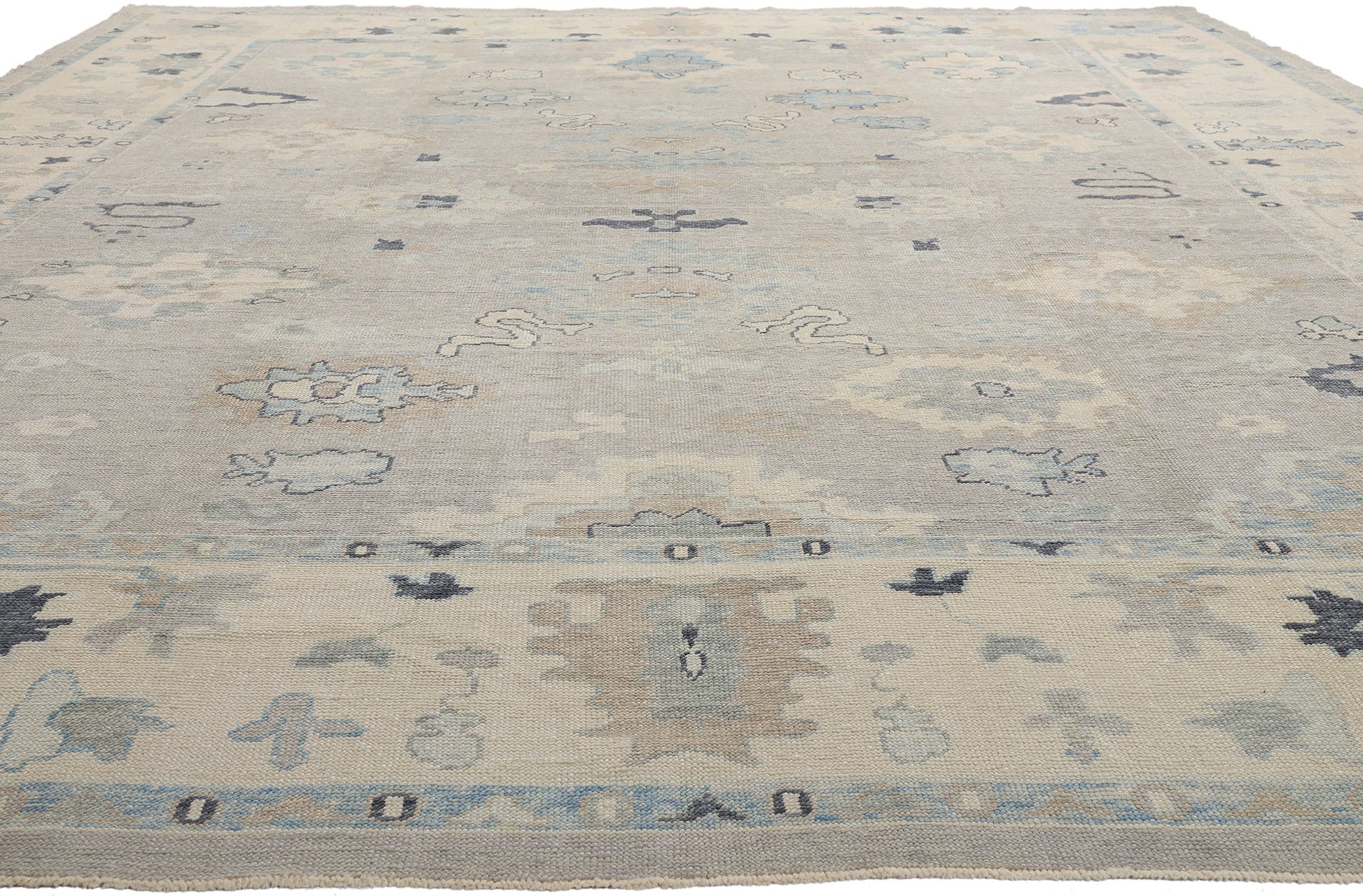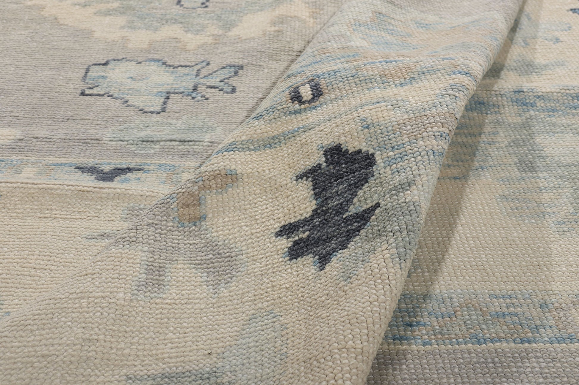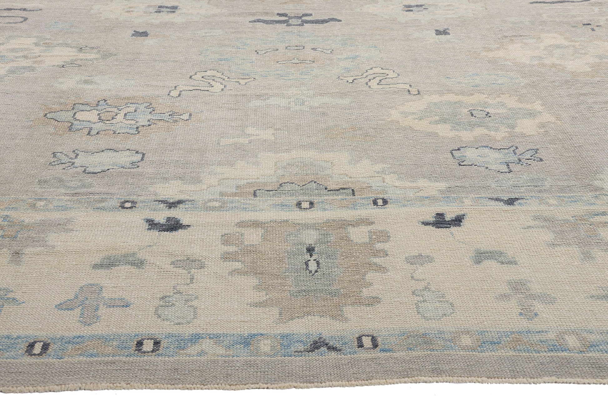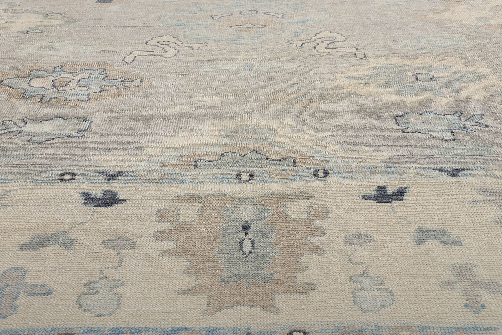 With its quiet elegance and subtle grandeur, this hand knotted wool modern Turkish Oushak rug embodies the timeless allure of Anatolian craftsmanship interpreted through a contemporary, minimalist lens. A soft gray field becomes the canvas for an allover pattern composed of abstracted botanical forms, elemental palmettes, stylized rosettes, amorphous cloudband motifs, and esoteric tribal emblems. Each motif appears suspended, gently scattered across the surface like relics of ancient iconography drifting through a morning mist. The design is unified not by symmetry, but by rhythm—each shape balanced delicately in relation to its neighbors, creating a field of dreamlike cohesion.