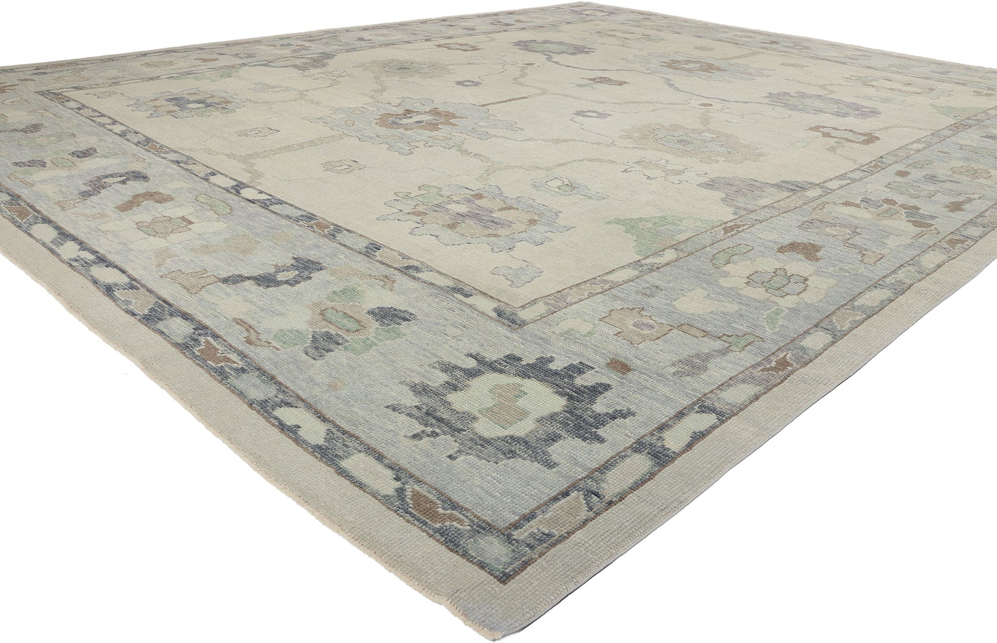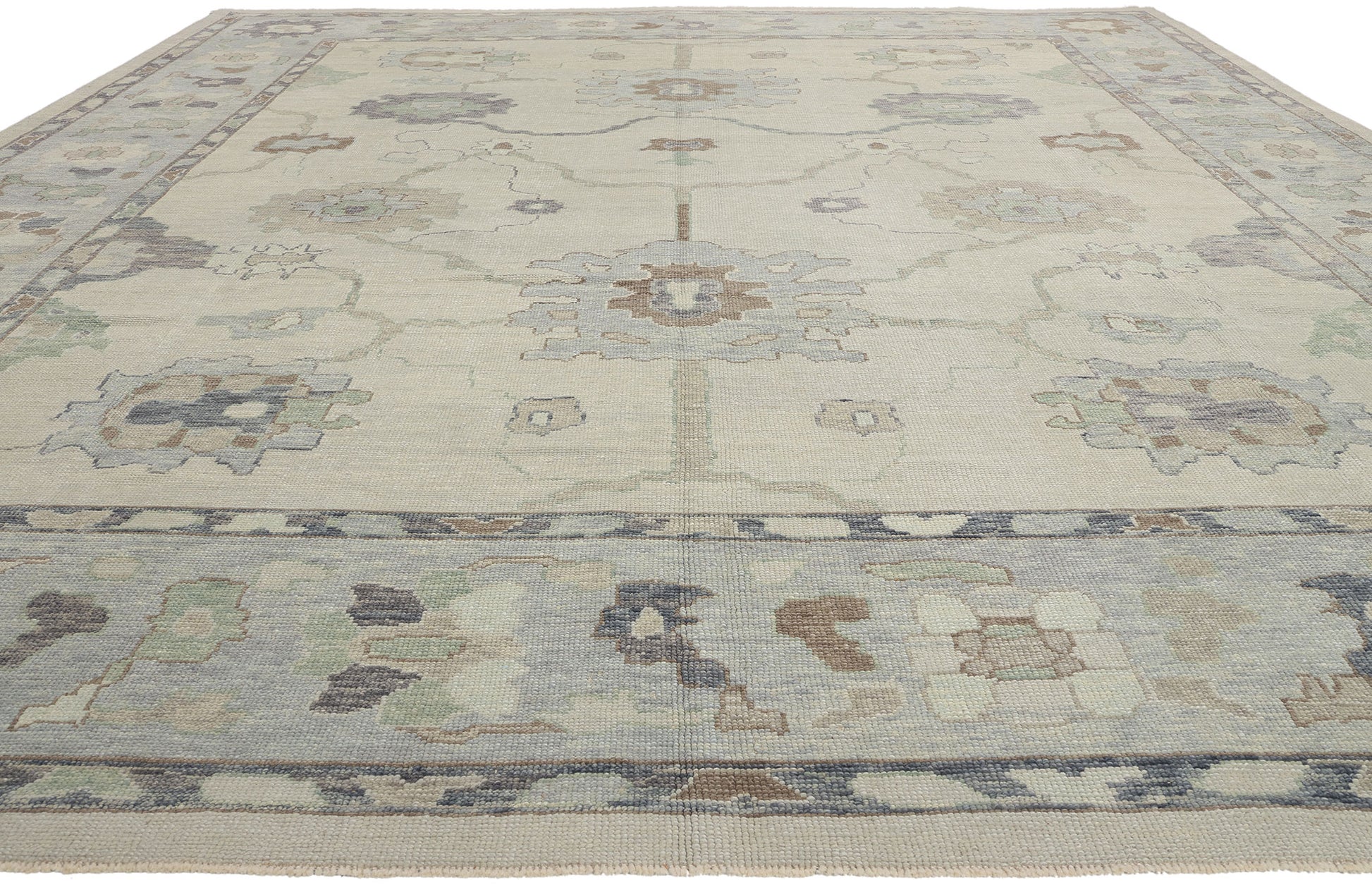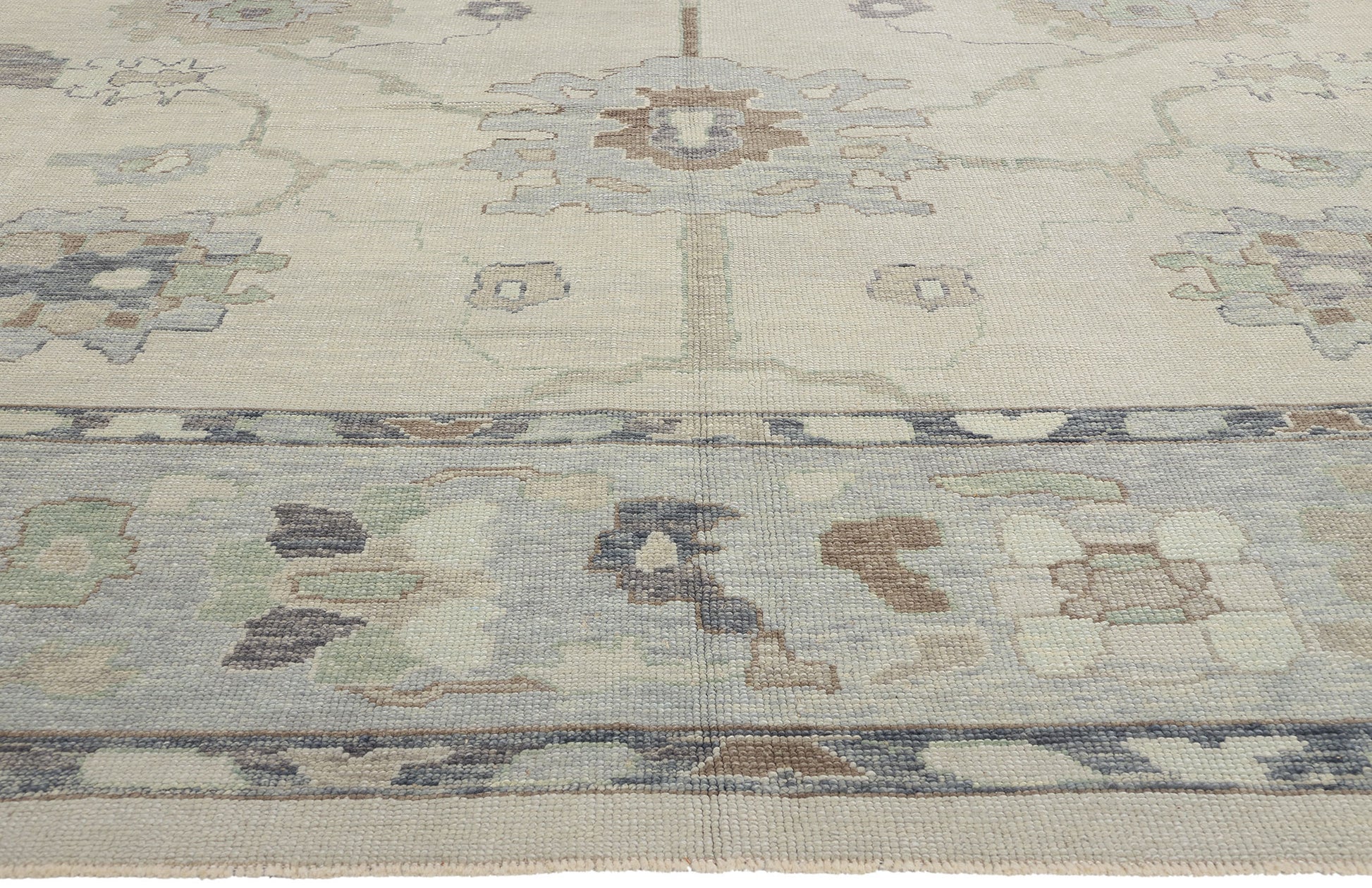 The design of this modern Oushak rug strikes a balance between tradition and innovation, with motifs that nod to historical influences while embracing a fresh, modern aesthetic. Large palmettes and organic shapes anchor the composition, radiating outwards in a symmetrical and harmonious pattern. Delicate vine tendrils and smaller organic elements connect these motifs, creating a flowing tableau that invites closer examination. The subtle interplay of colors, including hints of pale blue, taupe, and sage green, adds depth and dimension to the otherwise neutral palette, enhancing the visual appeal of the Oushak rug without overwhelming the senses.