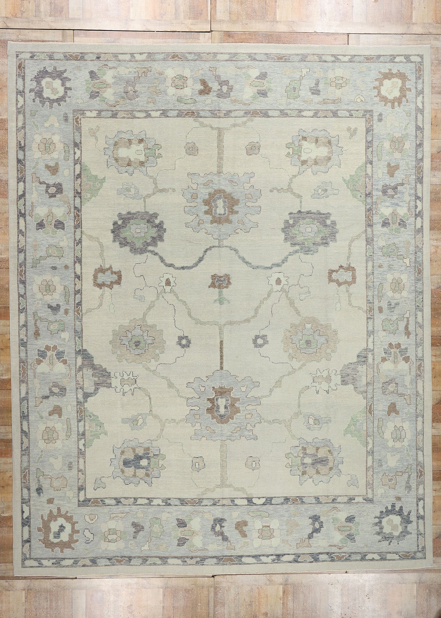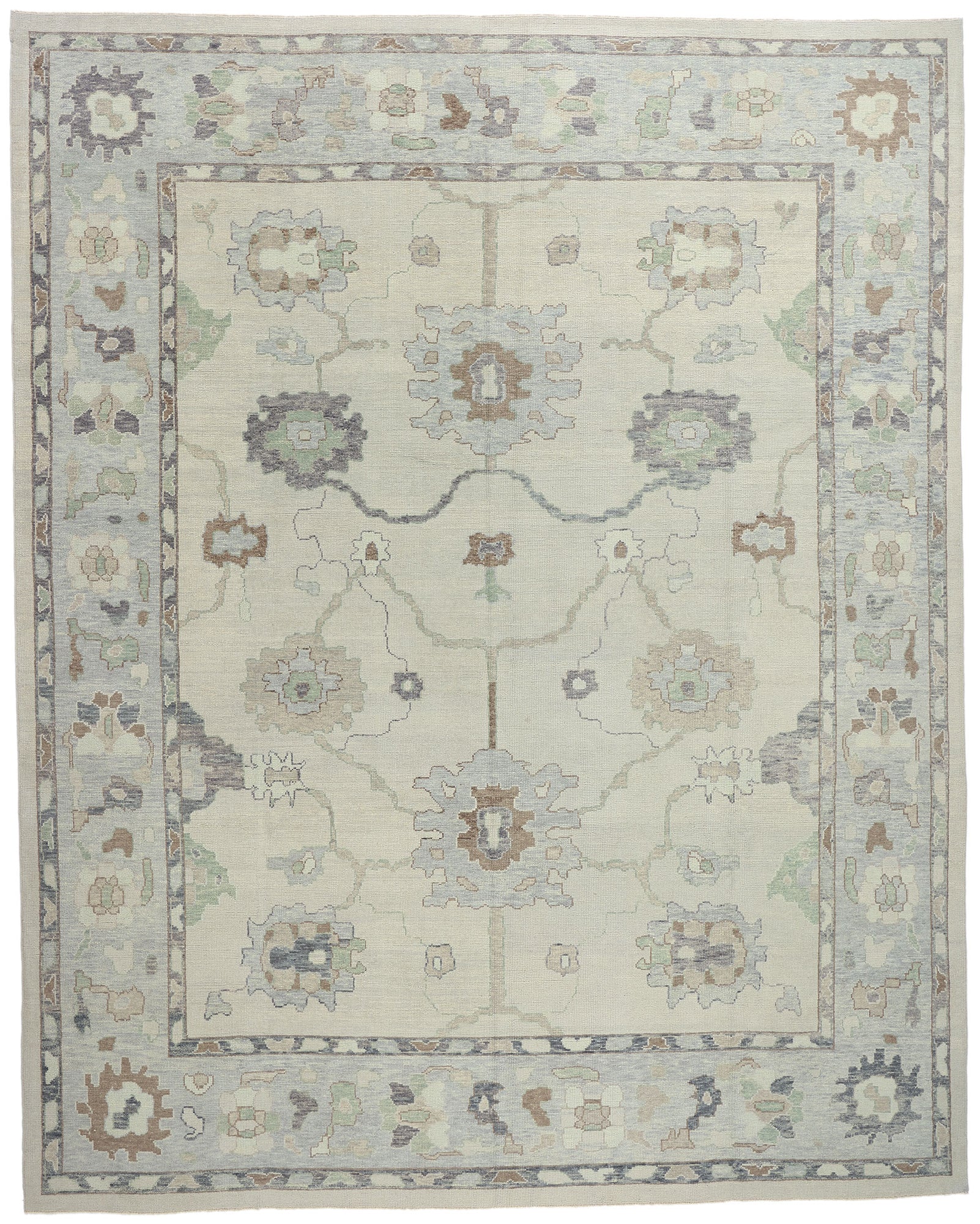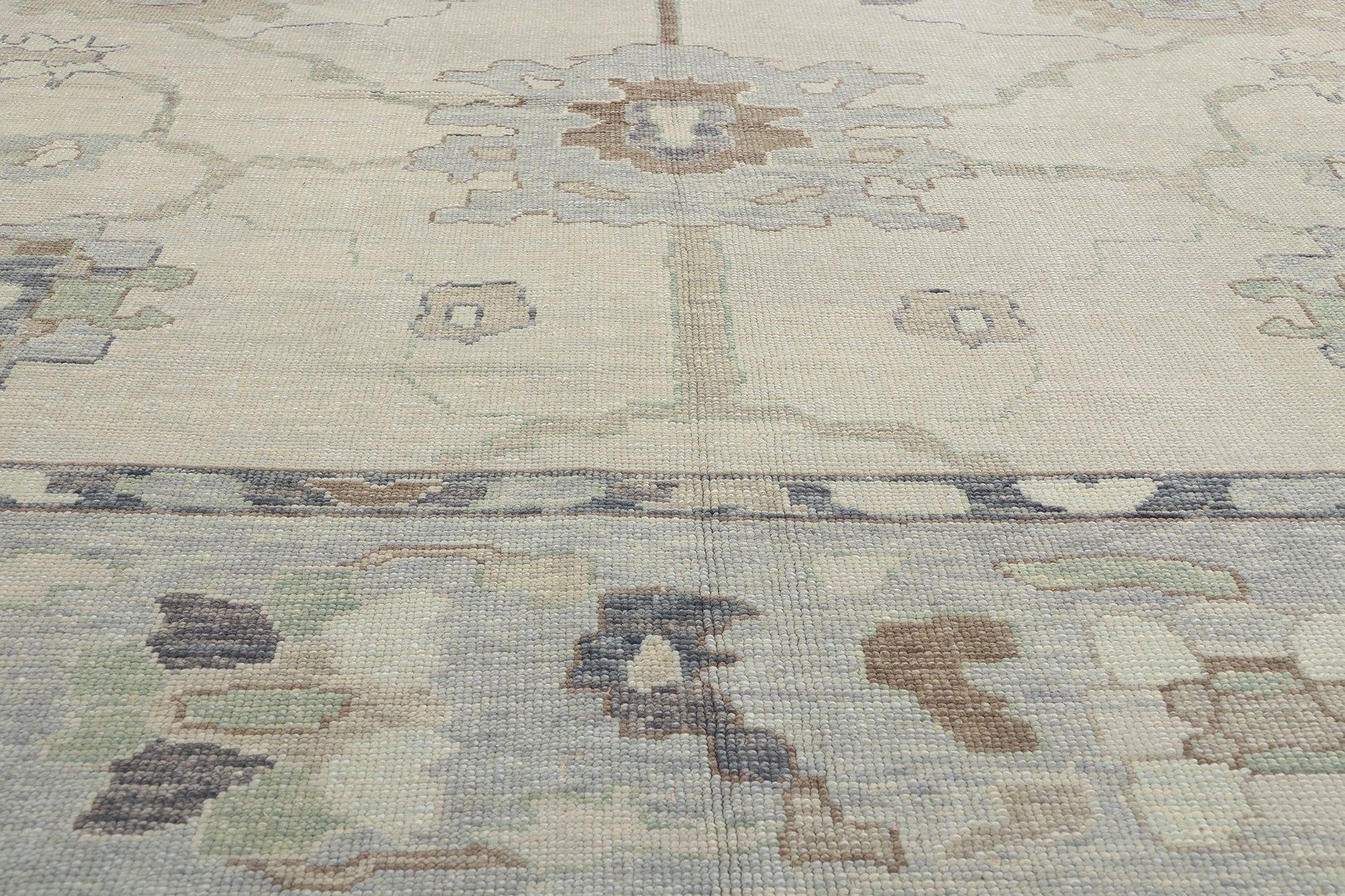 The design of this modern Oushak rug strikes a balance between tradition and innovation, with motifs that nod to historical influences while embracing a fresh, modern aesthetic. Large palmettes and organic shapes anchor the composition, radiating outwards in a symmetrical and harmonious pattern. Delicate vine tendrils and smaller organic elements connect these motifs, creating a flowing tableau that invites closer examination. The subtle interplay of colors, including hints of pale blue, taupe, and sage green, adds depth and dimension to the otherwise neutral palette, enhancing the visual appeal of the Oushak rug without overwhelming the senses.