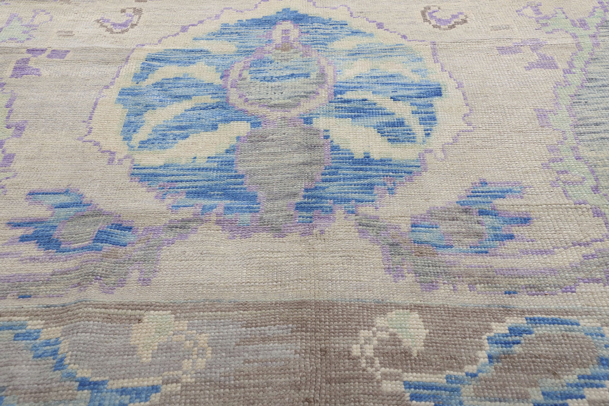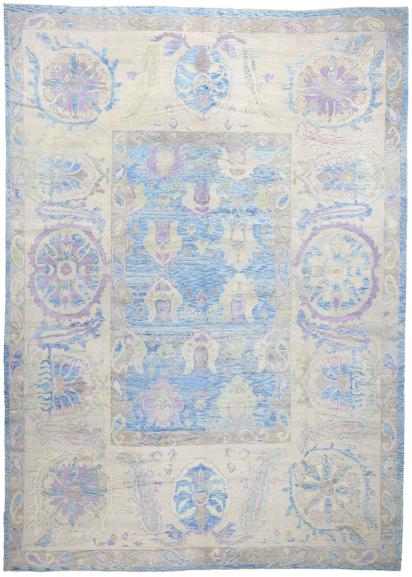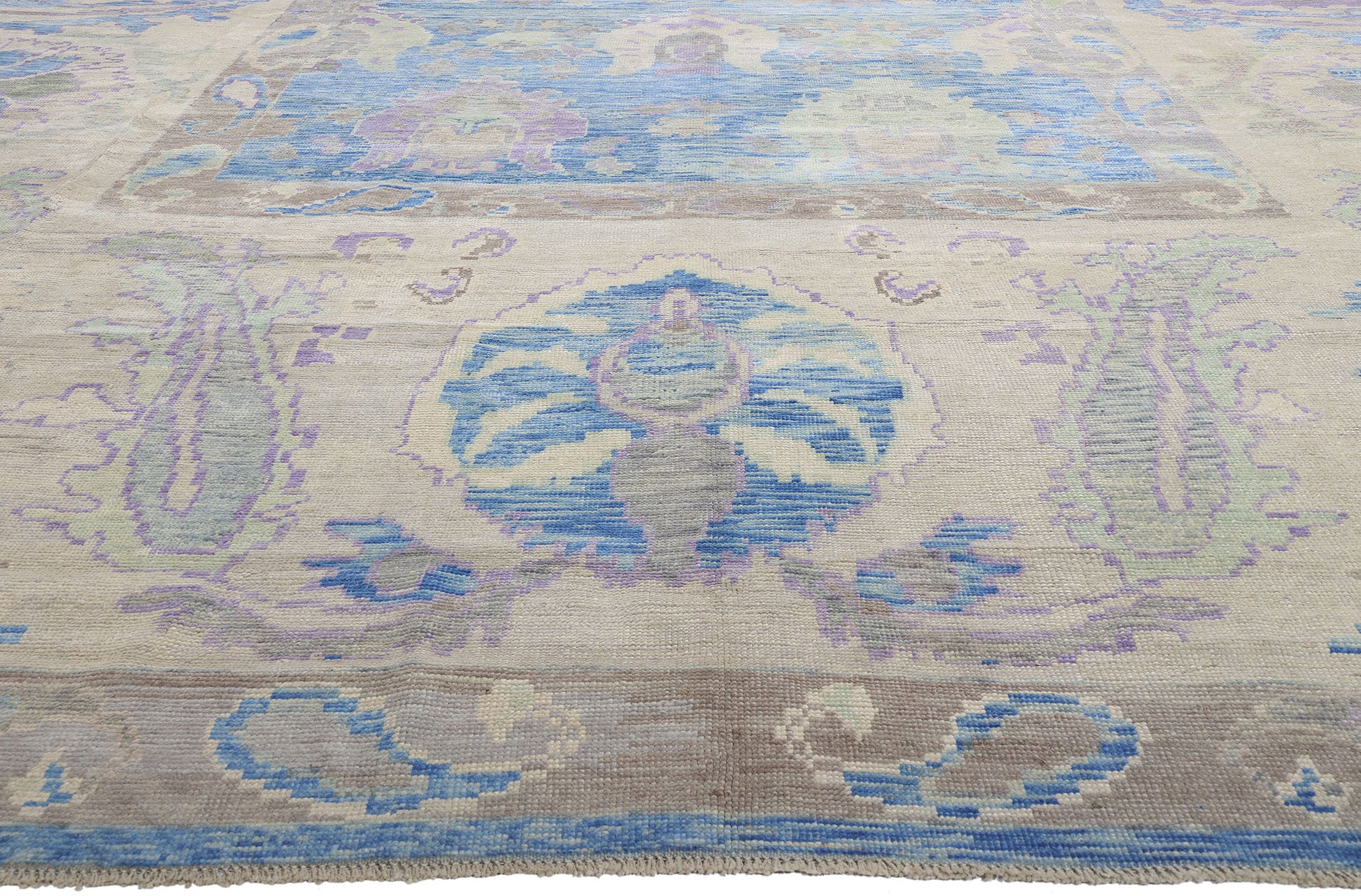 Encircling the central field is a wide border that complements the overall design with its intricate boteh, pomegranate motifs, and sinuous rosette patterns. The use of soft pastel tones in the border creates a seamless transition from the central field, enhancing the Oushak rug’s cohesive aesthetic. Subtle touches of lavender and beige interweave with the botanical elements, echoing the palette of the interior design and emphasizing the artisanal craftsmanship inherent in Oushak weaving traditions.