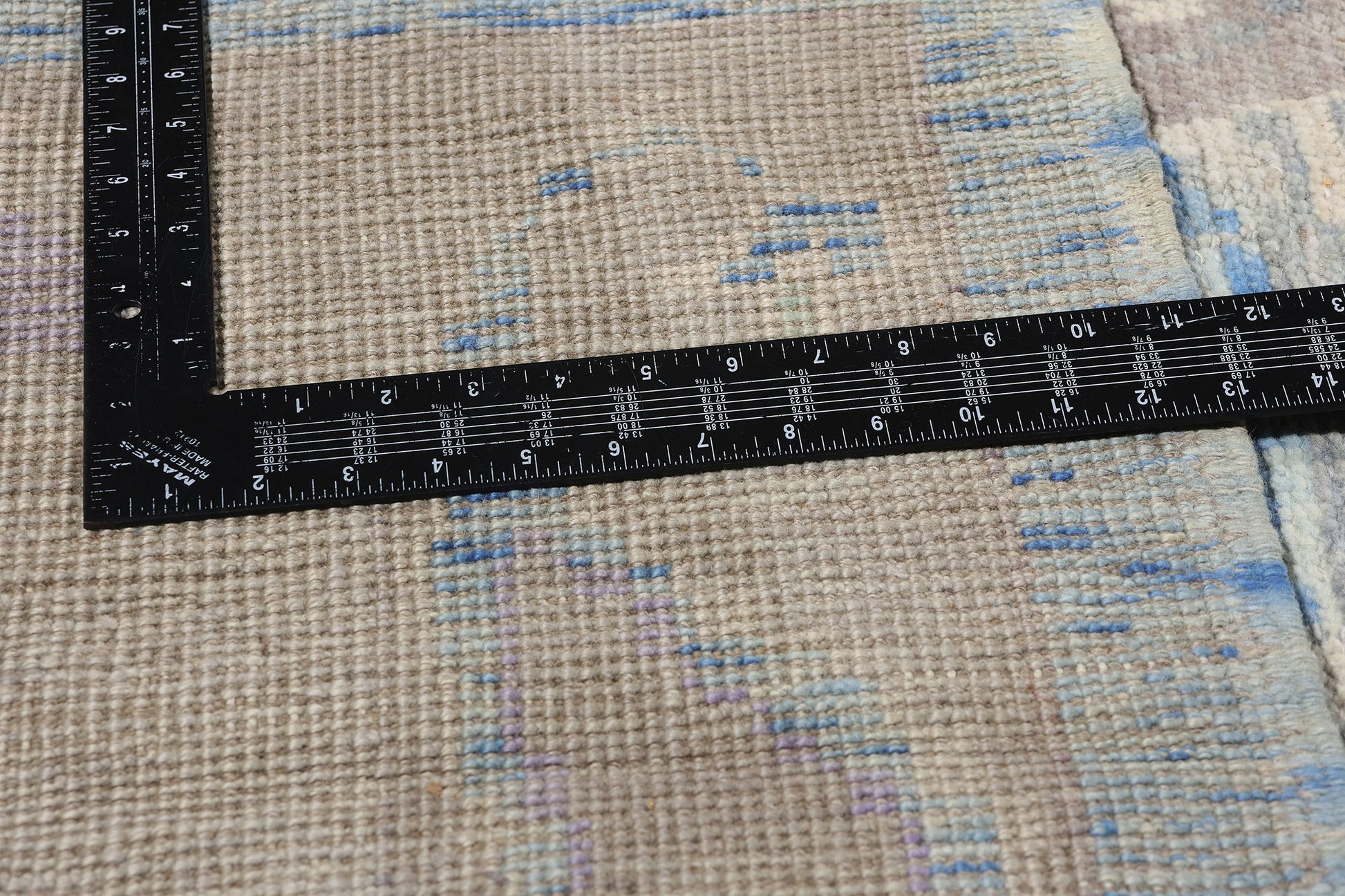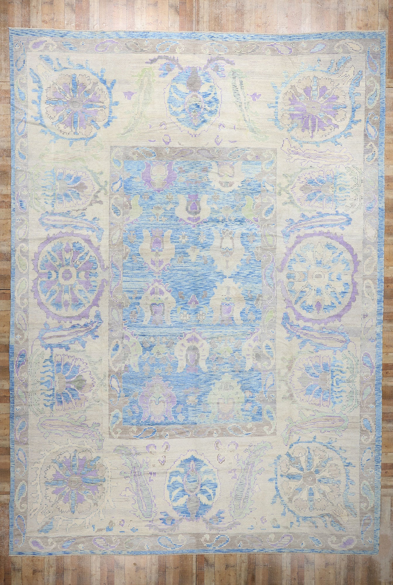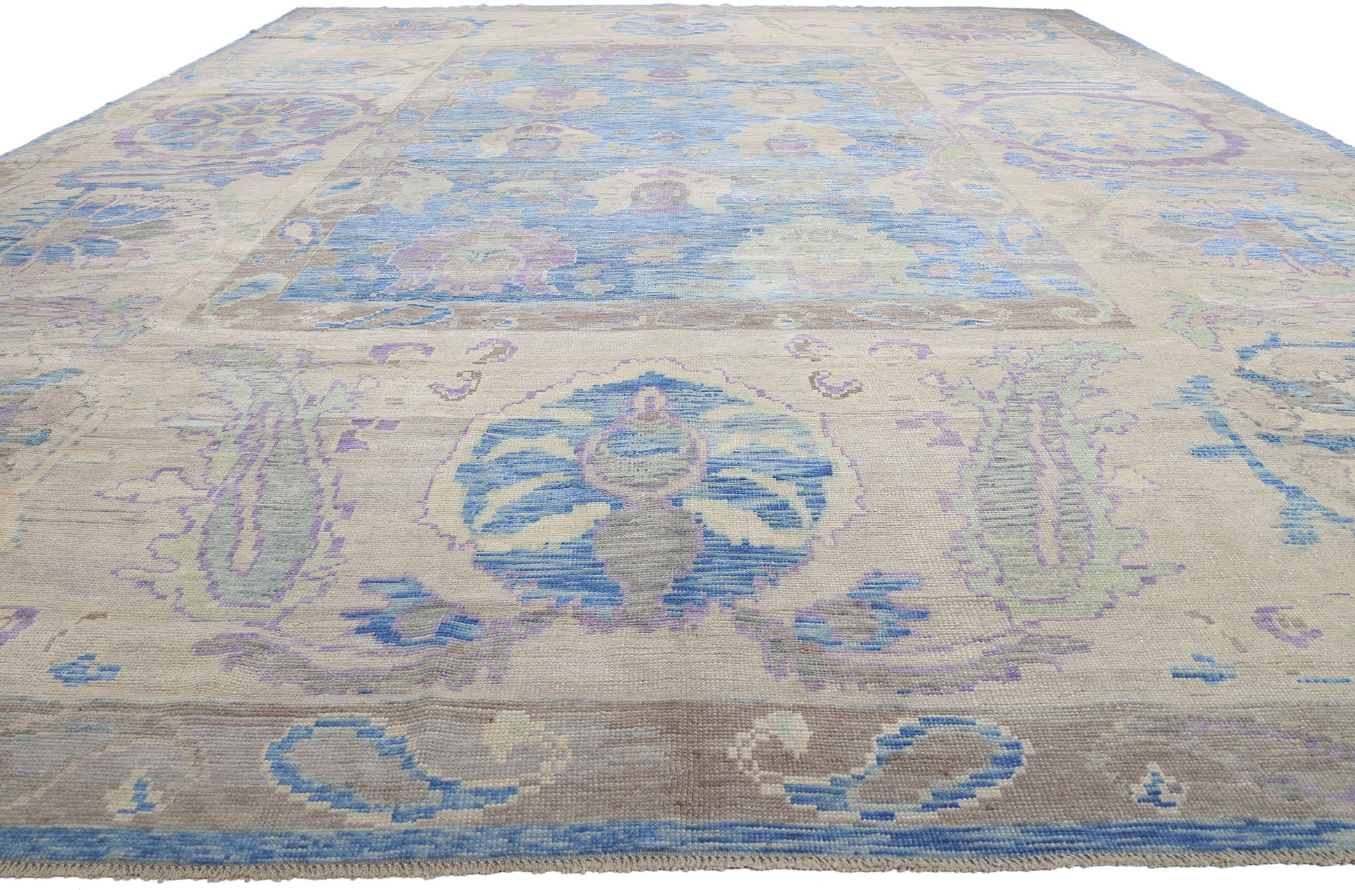 Encircling the central field is a wide border that complements the overall design with its intricate boteh, pomegranate motifs, and sinuous rosette patterns. The use of soft pastel tones in the border creates a seamless transition from the central field, enhancing the Oushak rug’s cohesive aesthetic. Subtle touches of lavender and beige interweave with the botanical elements, echoing the palette of the interior design and emphasizing the artisanal craftsmanship inherent in Oushak weaving traditions.
