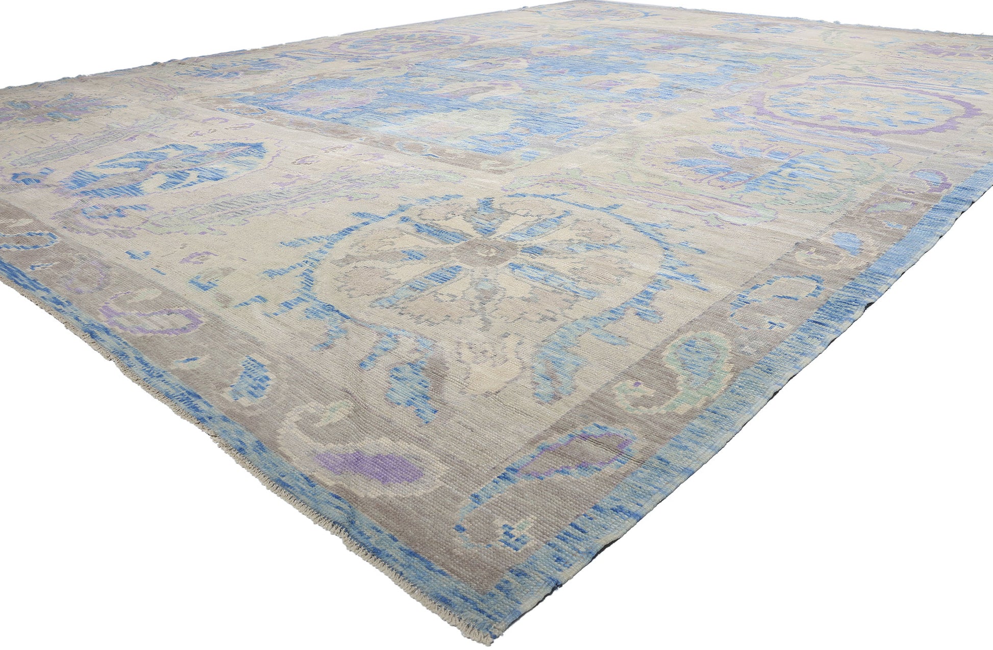 This exquisite hand-knotted wool modern Turkish Oushak rug captures the timeless elegance of Anatolian craftsmanship while infusing it with a contemporary aesthetic. Its serene palette of sky blues, lavender, gracious grays, and soft beige evokes a sense of tranquility, reminiscent of a clear morning sky reflected in calm waters. The Oushak rug’s expansive dimensions and airy color scheme make it a statement piece, ideal for both grand spaces and settings that seek to balance traditional charm with modern sophistication.