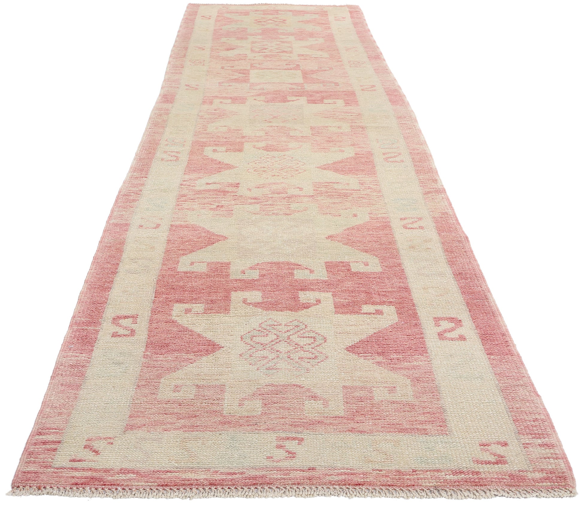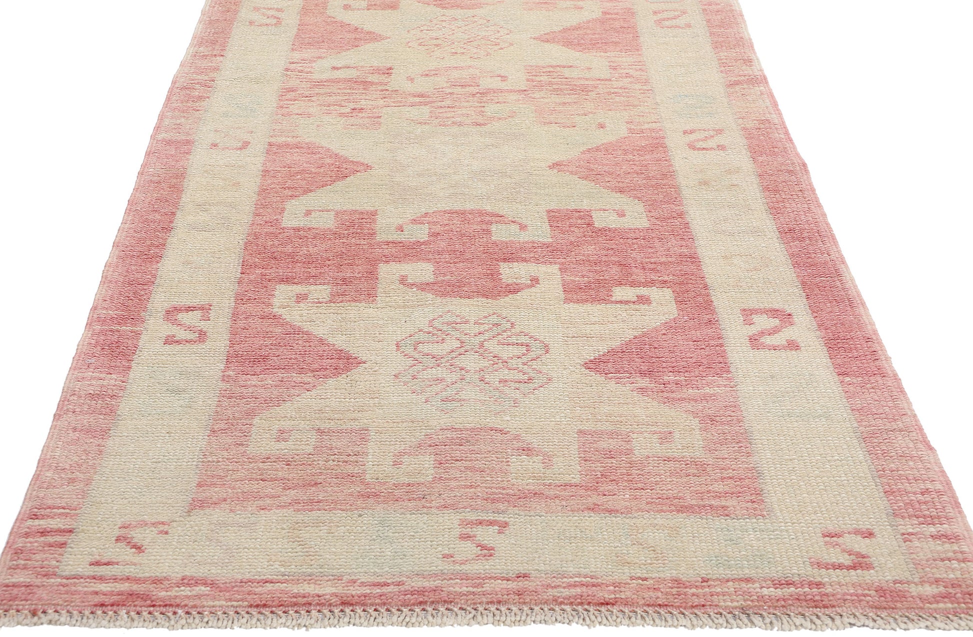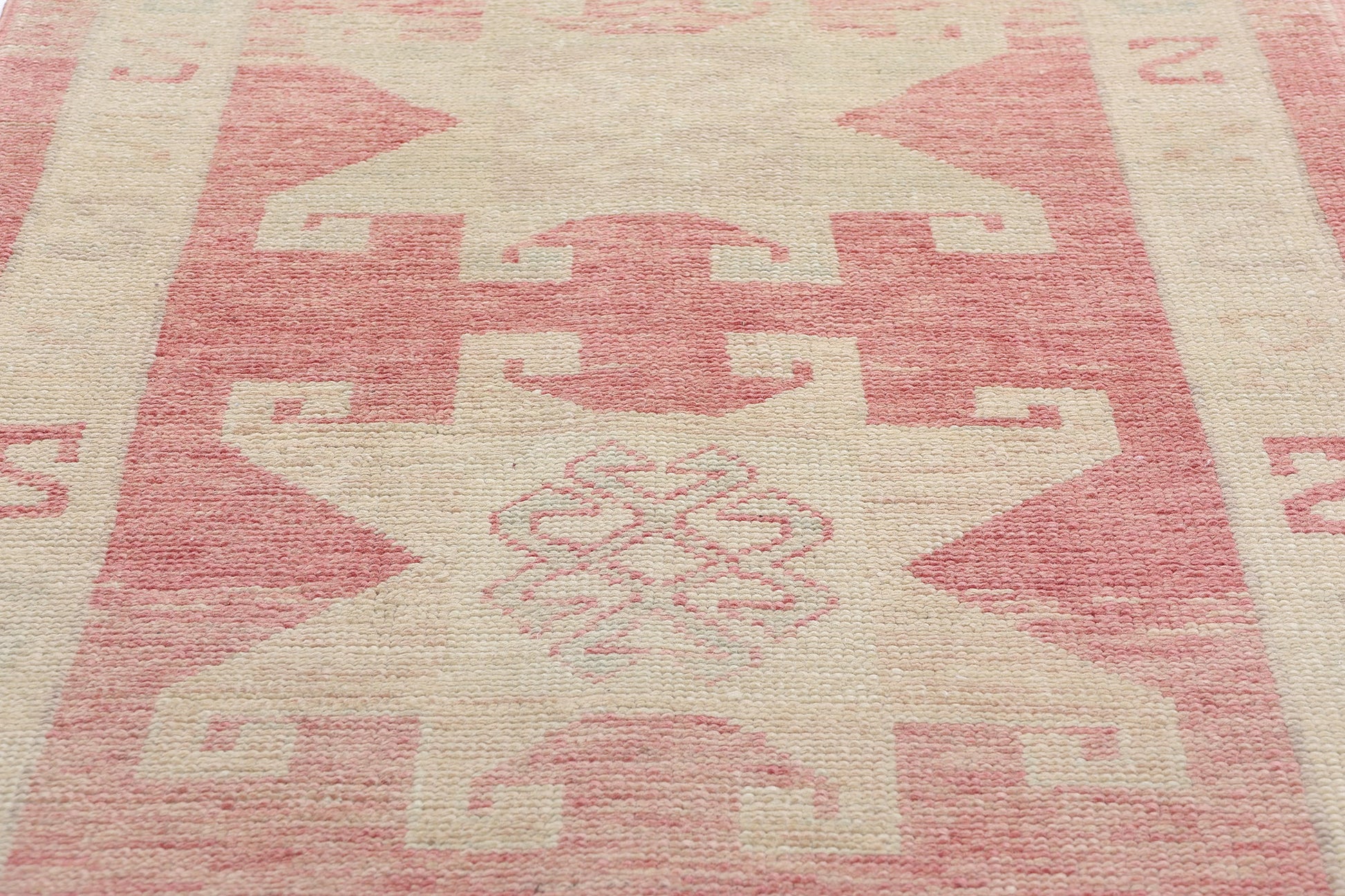 This hand-knotted wool modern Turkish Oushak rug runner beautifully showcases the artistry of Anatolian weaving, seamlessly blending traditional motifs with contemporary sophistication. The Oushak runner features a striking arrangement of geometric medallions, inspired by Turkish patterns that have endured for centuries. Set against a softly abrashed pink background, the delicate tonal variations and neutral accents create a harmonious balance of warmth and serenity. Its clean design and understated palette offer a modern take on classic Oushak aesthetics, making it an ideal addition to both traditional and modern interiors.