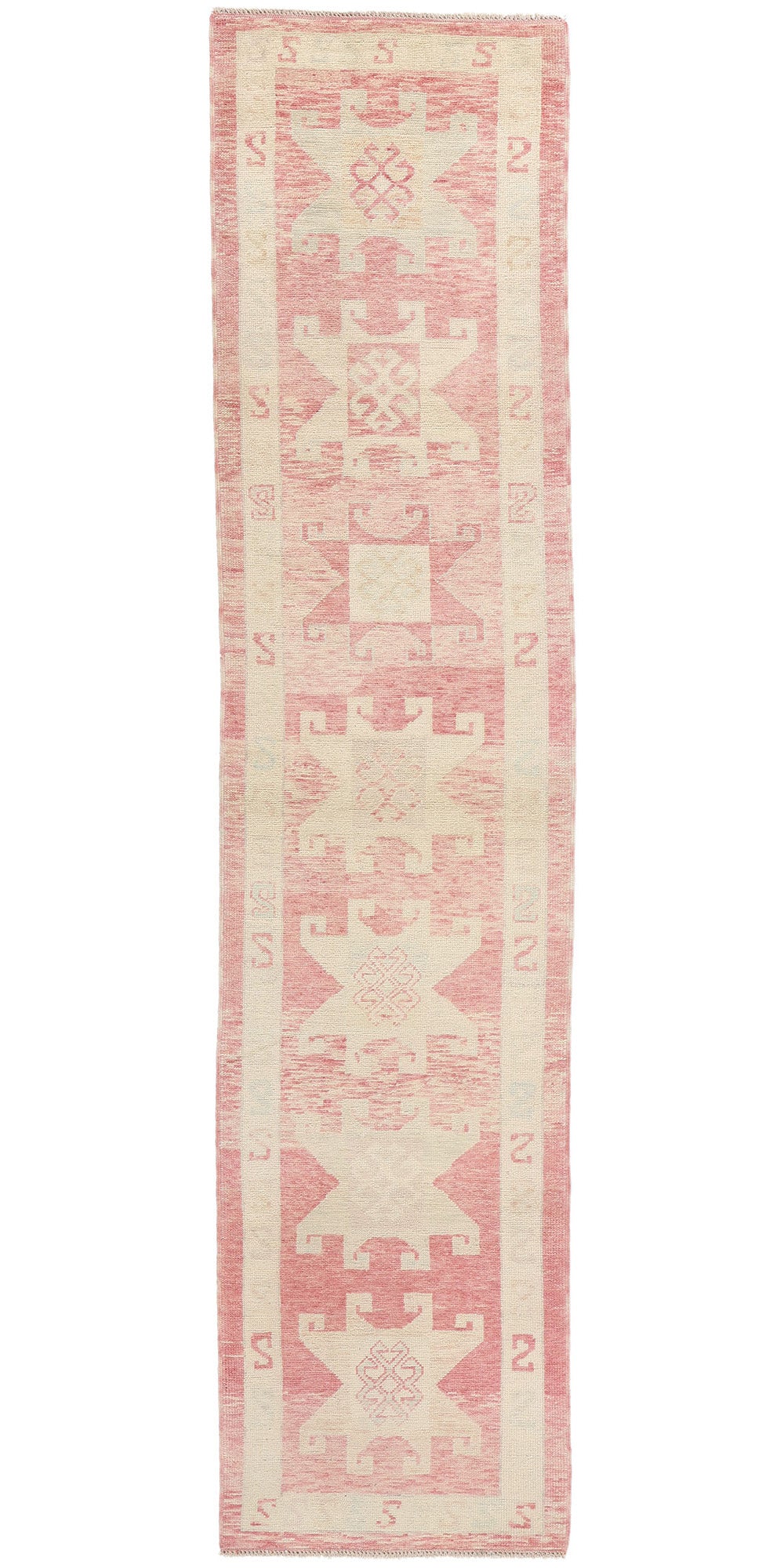 The border, rendered in soft rosy pink and subtle geometric patterns, frames the field with an air of understated elegance. Echoing the central motifs, the hooked border enhances the rug’s overall structure and reinforces its harmonious design. This intricate interplay of color, form, and symbolic detail exemplifies the skill of the artisan, highlighting the precision and care inherent in every knot of this Oushak runner.