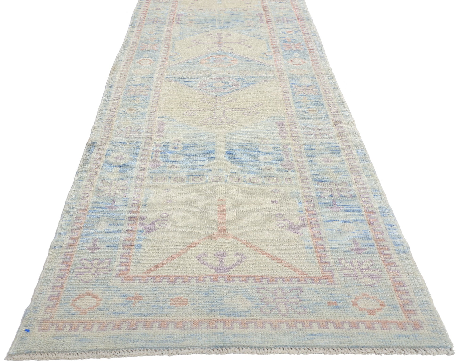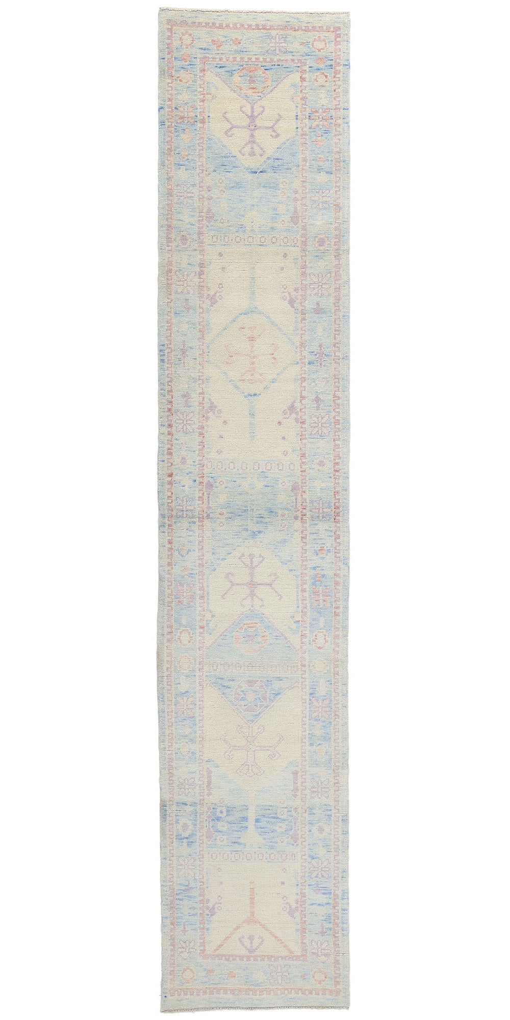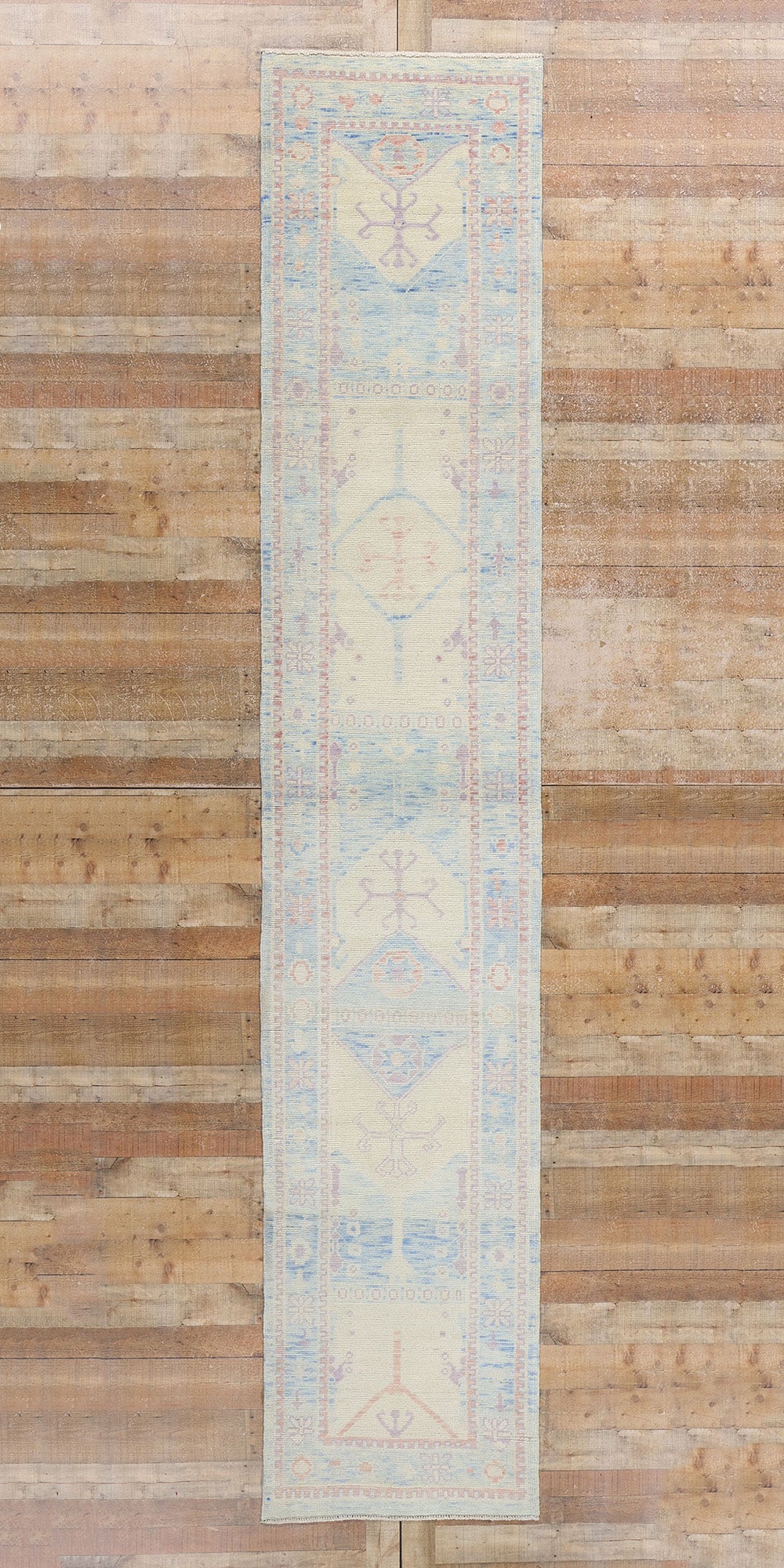 This hand-knotted wool modern Turkish Oushak rug runner radiates a serene and ethereal charm, effortlessly blending traditional craftsmanship with contemporary elegance. Its abrashed field is adorned with soft pastel hues of sky blue, lavender, rose and beige, creating a soothing and inviting aesthetic. The central field is delicately patterned with symbolic motifs, including angular medallions and stylized botanical elements, evoking the rich heritage of Anatolian weaving while maintaining a modern sensibility.