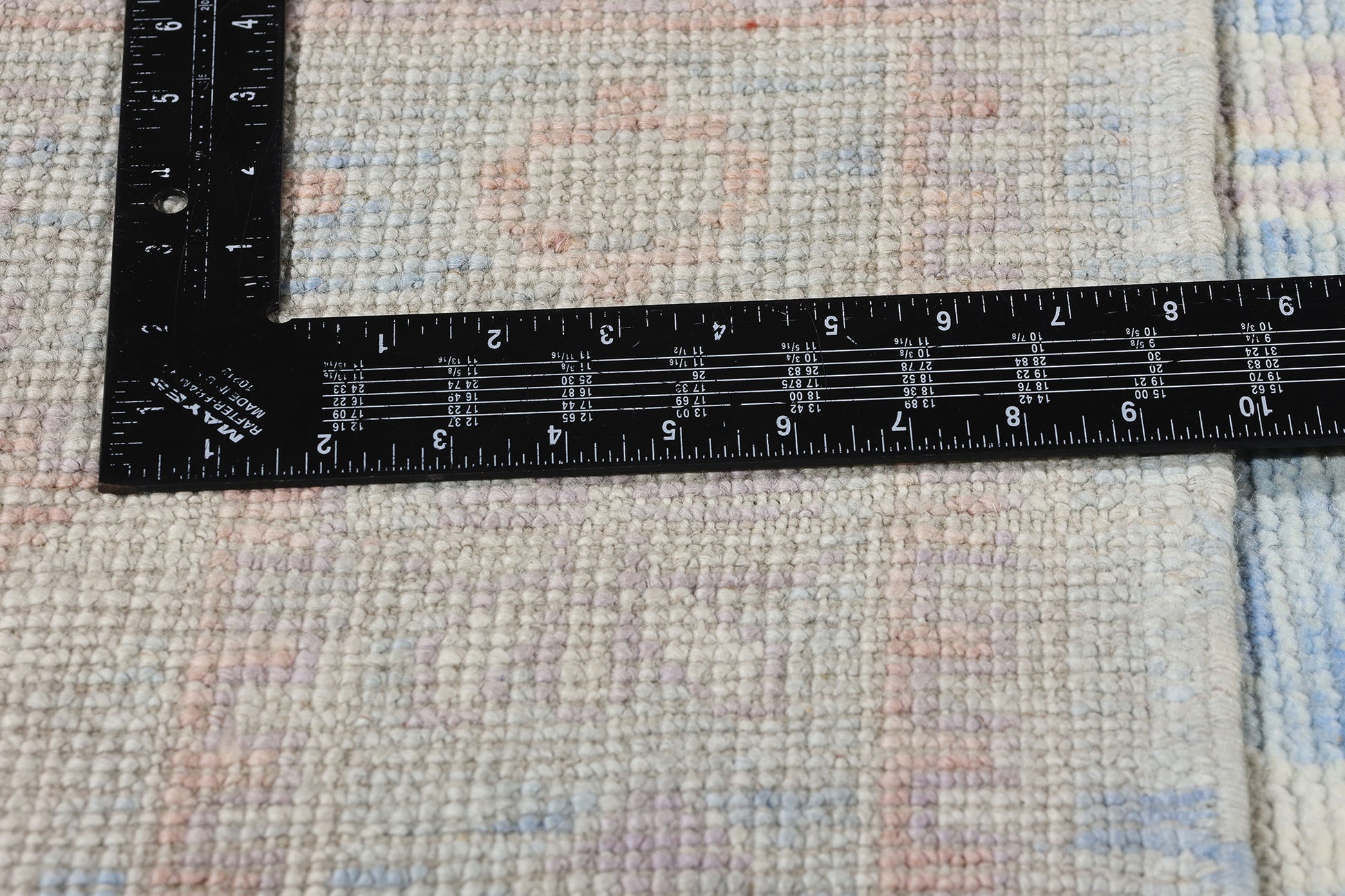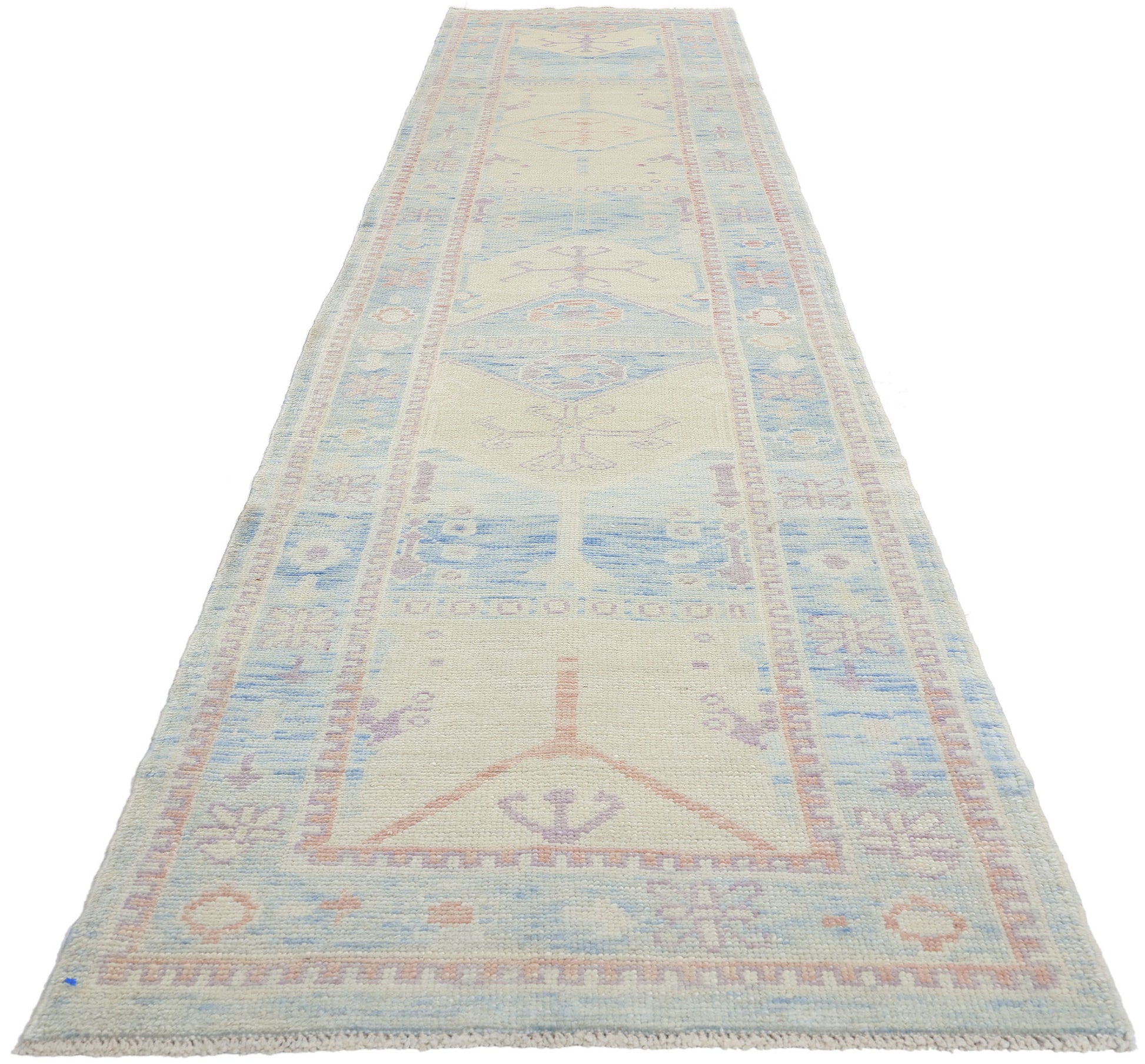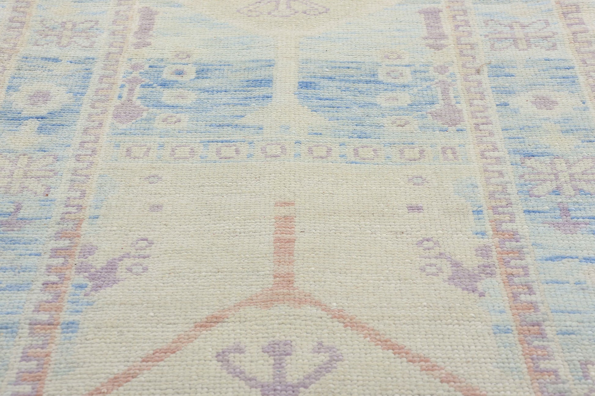 This hand-knotted wool modern Turkish Oushak rug runner radiates a serene and ethereal charm, effortlessly blending traditional craftsmanship with contemporary elegance. Its abrashed field is adorned with soft pastel hues of sky blue, lavender, rose and beige, creating a soothing and inviting aesthetic. The central field is delicately patterned with symbolic motifs, including angular medallions and stylized botanical elements, evoking the rich heritage of Anatolian weaving while maintaining a modern sensibility.