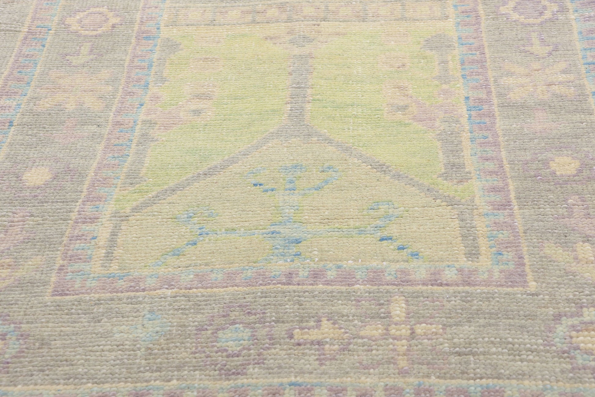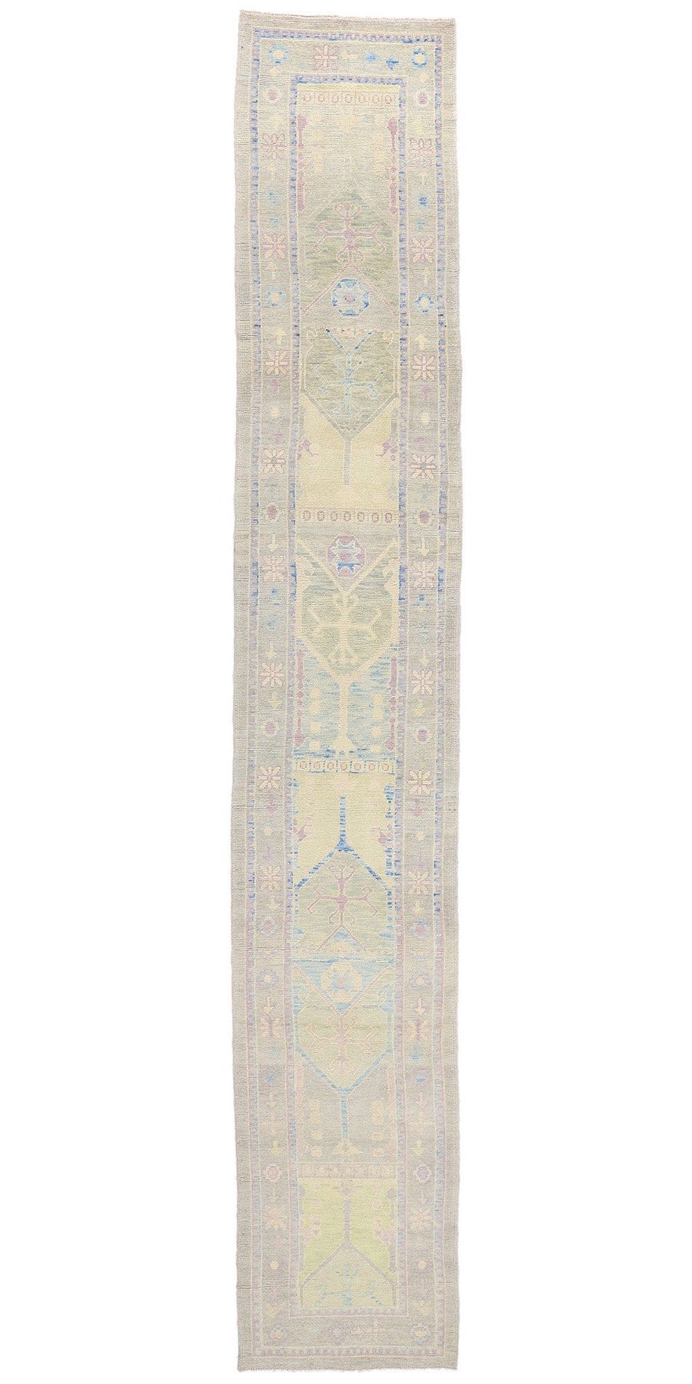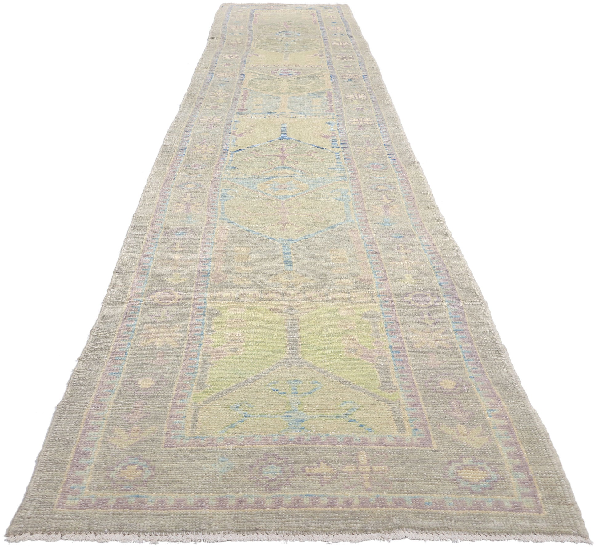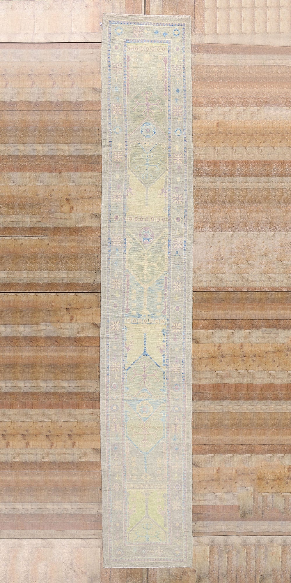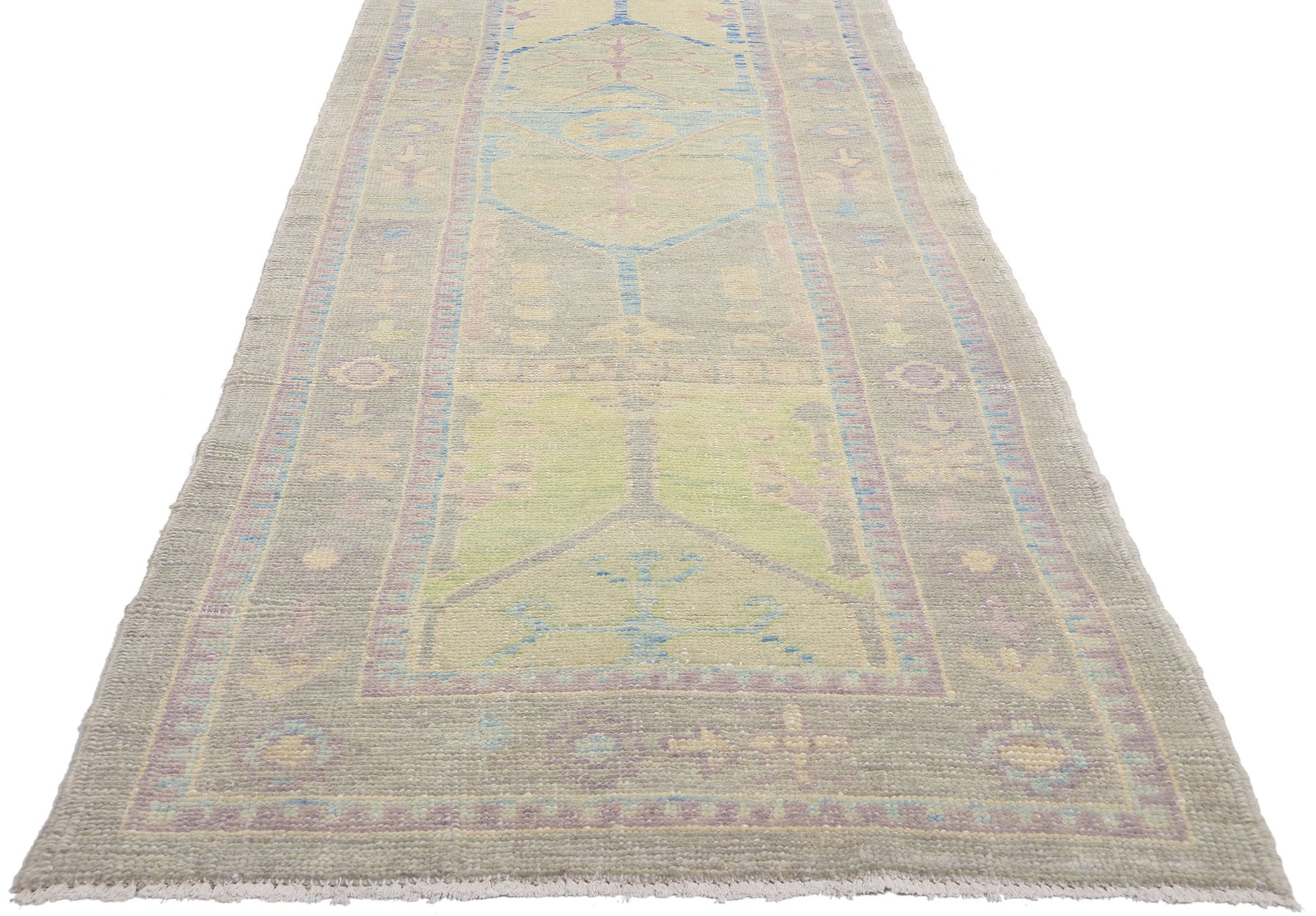 This hand-knotted wool modern Turkish Oushak rug runner showcases the timeless artistry of Anatolian weaving, reimagined with a contemporary touch. Its elongated silhouette and soft color palette of pastel blues, lavenders, and light greens create an ethereal quality, making it a stunning accent for narrow spaces such as hallways or entryways. The delicate interplay of colors on the abrashed background enhances its subtle elegance, evoking a tranquil and serene atmosphere.